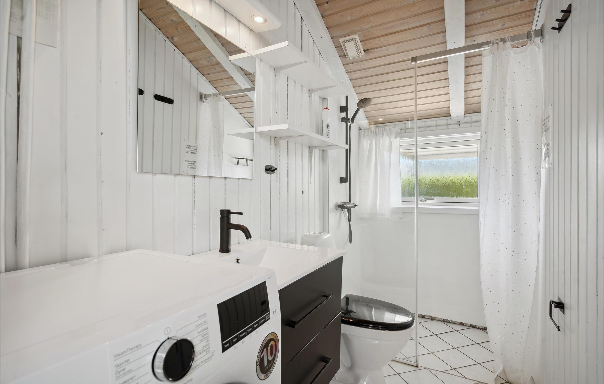 Pænt feriehus ved Skovmose Strand med moderne køkken, brændeovn og tæt på vandet.