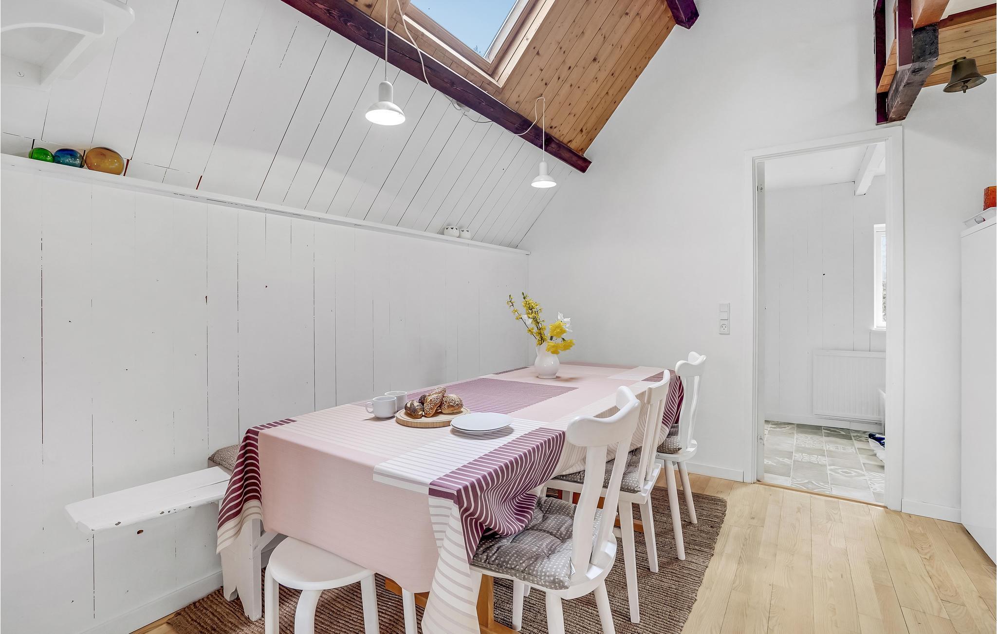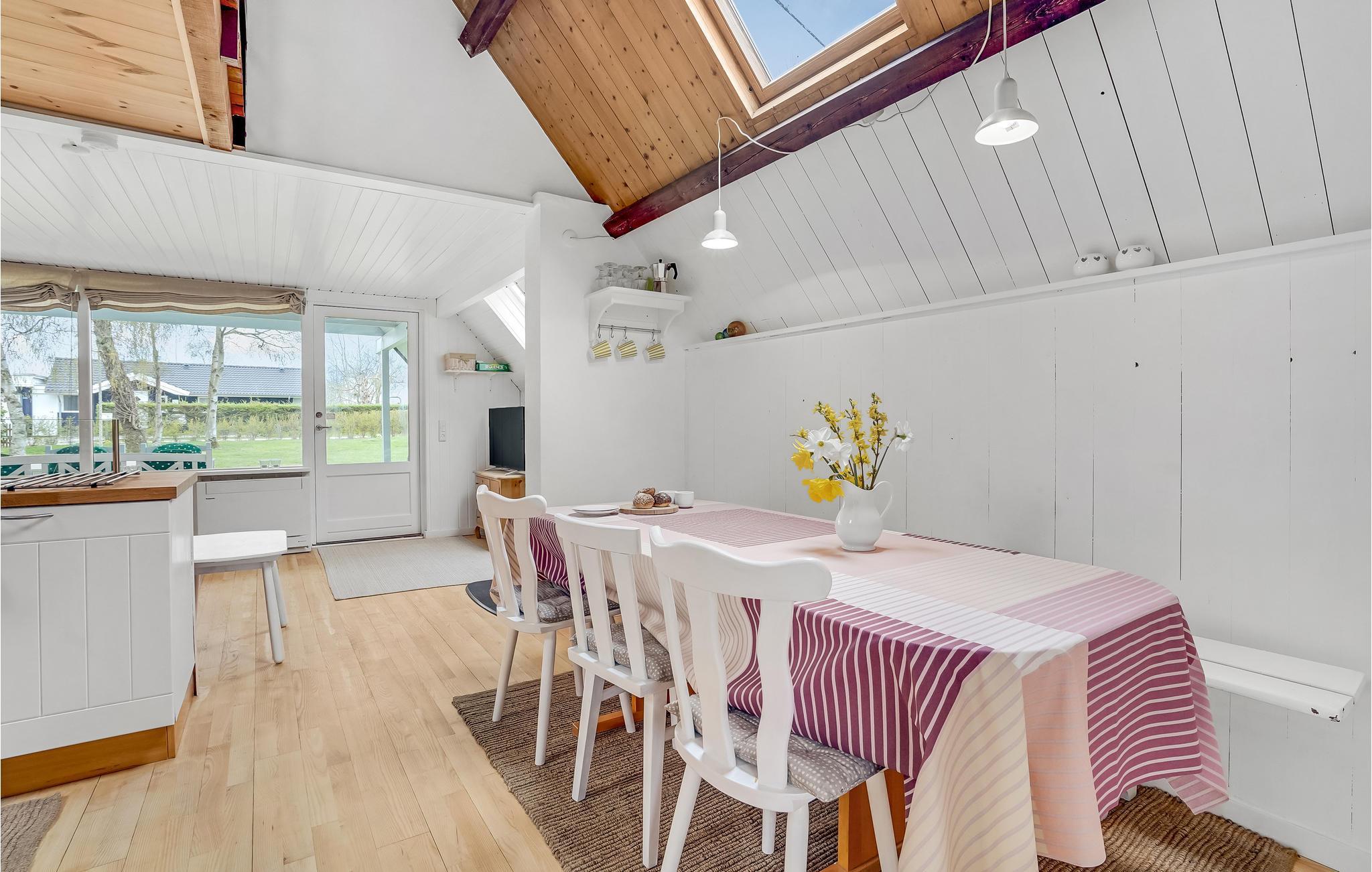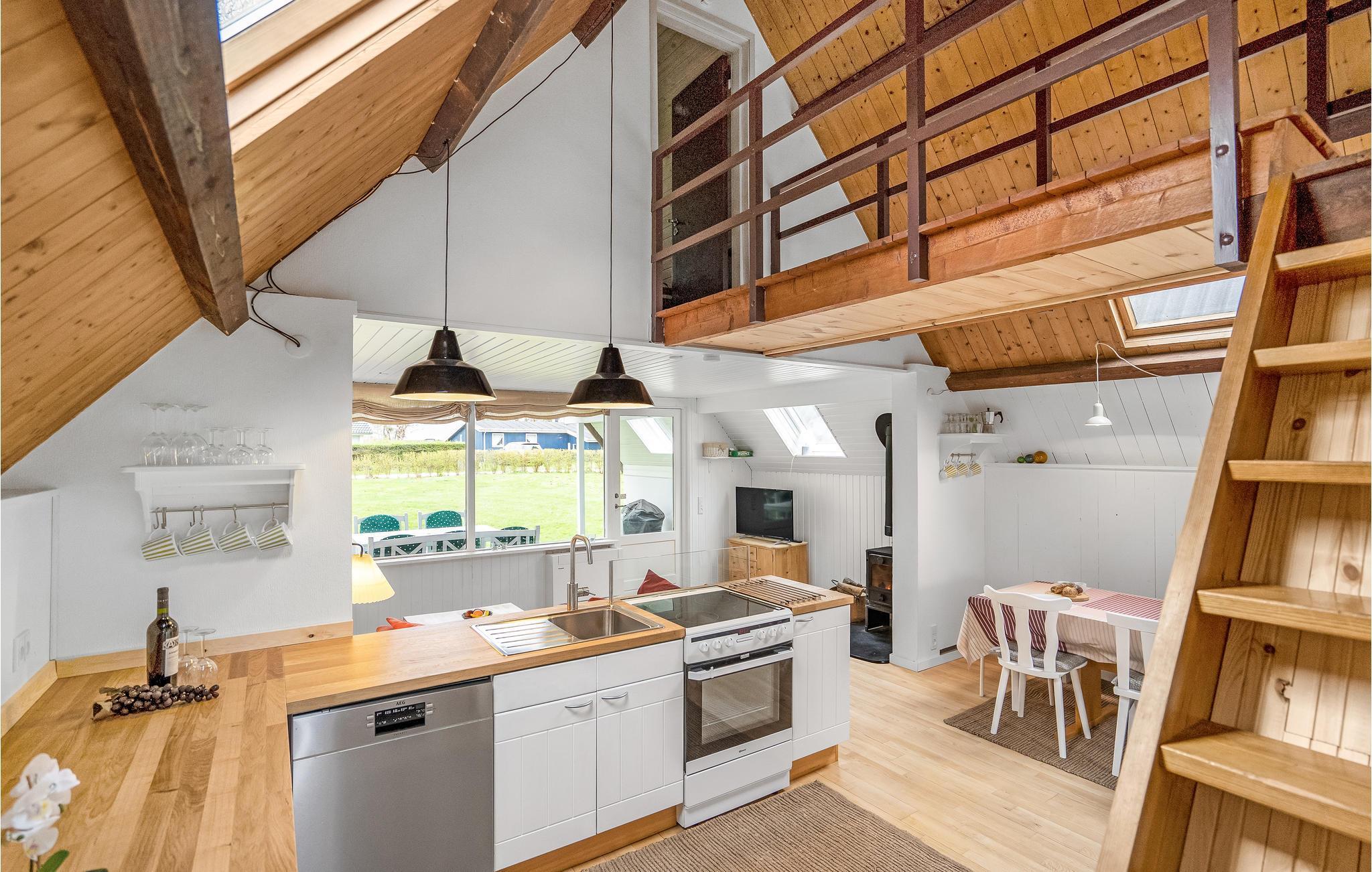 Huset ligger i anden række til vandet, og der er kun 130 meter til den familievenlige badestrand og Østersøens klare vand. Husets køkken ligger i åben forbindelse med spiseafdelingen og opholdsstuen. I stuen er der en brændeovn, som I kan benytte på de kølige dage og aftener.