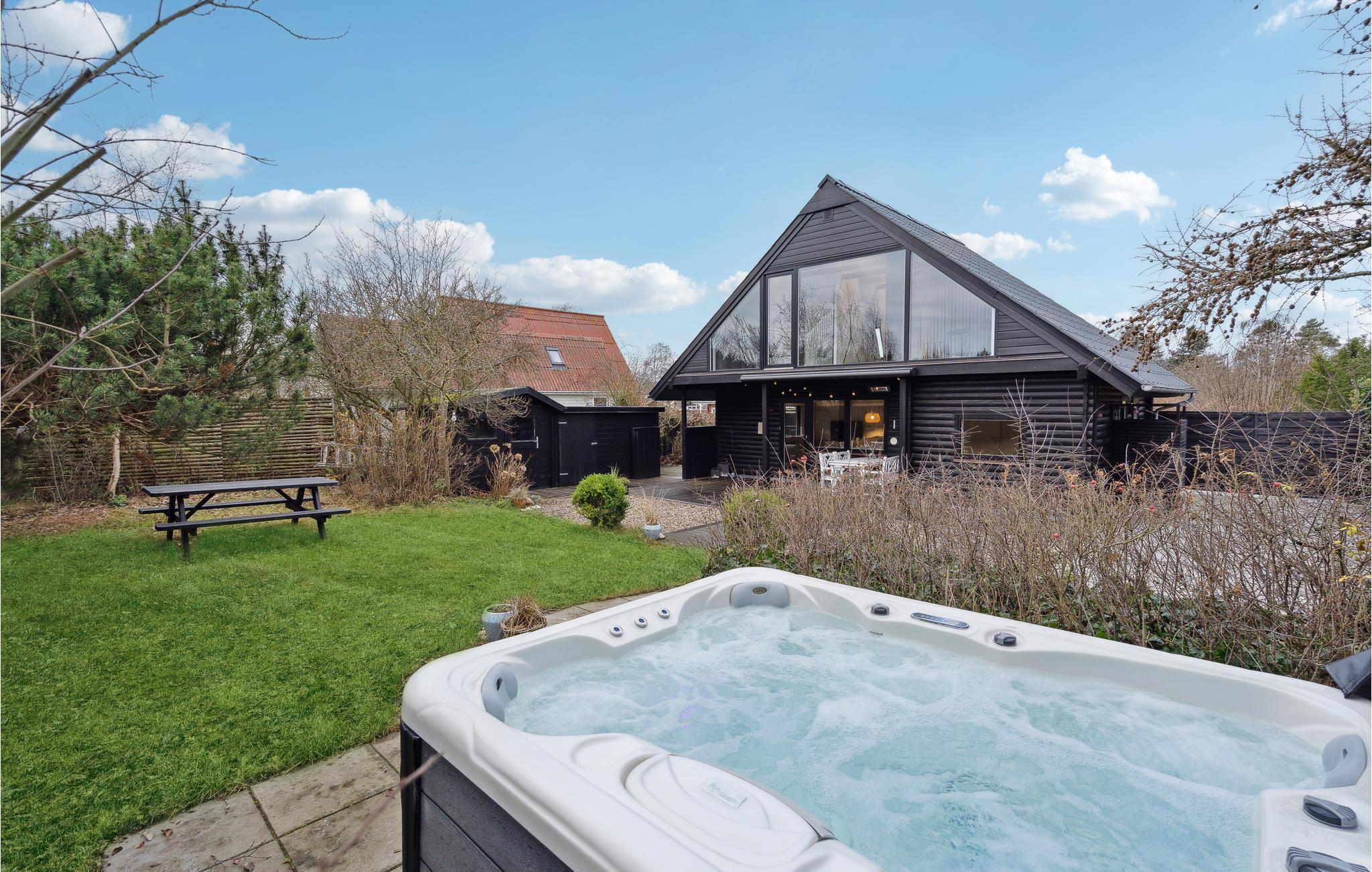 Stranden er tæt på, men I kan faktisk bare gå ud i haven, hvis I vil nyde nogle timer i solen. I kan grille og spise sammen på den store træterrasse eller slappe helt af i det udendørs spabad.