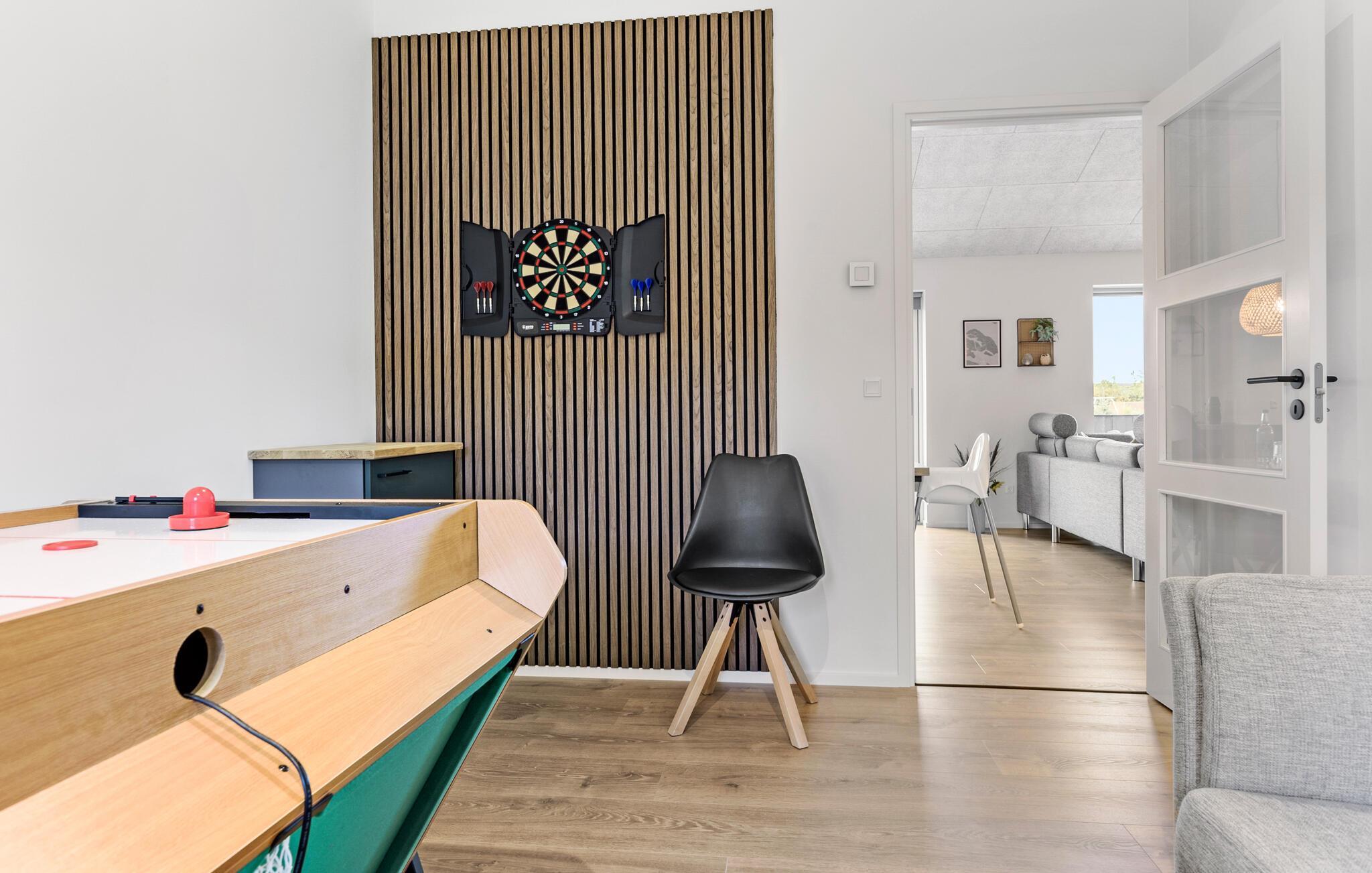 Boligen er udstyret med en masse herlige faciliteter til den kræsne feriegæst. Indretningen er moderne, komfortabel og strømlinet, så her er det nemt at finde sig til rette og koncentrere sig om at holde fri. Trænger I til afveksling fra bøger og brætspil i stuen, er det hyggeligt med et slag billard, dart eller bordfodbold i aktivitetsrummet.