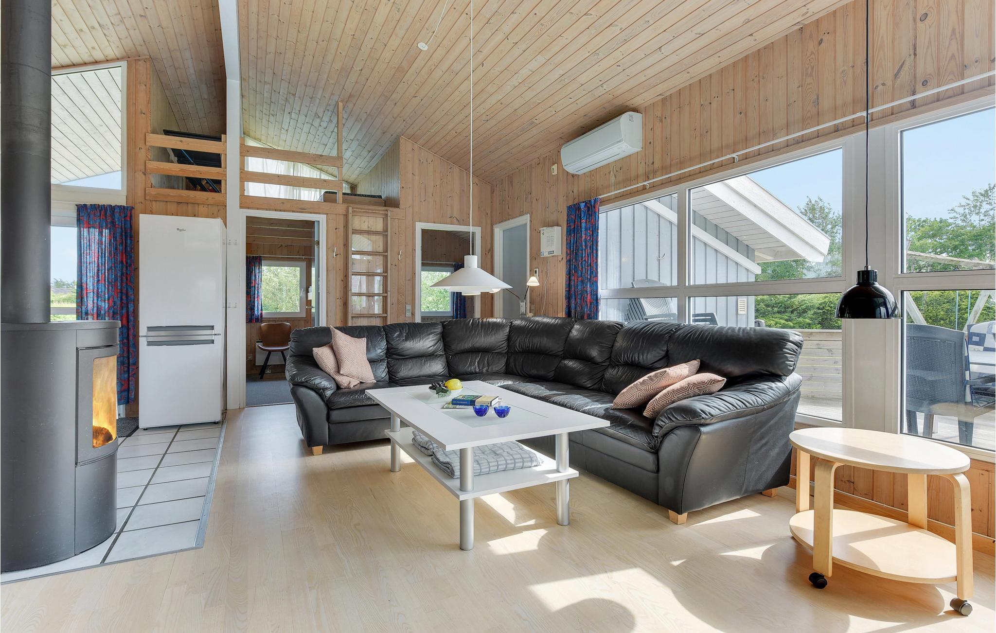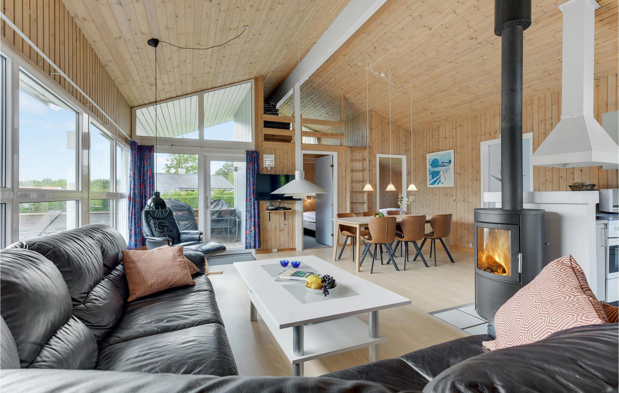 Glæd jer til en afslappende ferie med familien. Feriehuset fremstår yderst hyggeligt med trævægge, og brændeovnen i den lyse stue tilfører en hjemlig atmosfære. Med fire soveværelser og to badeværelser er huset dejligt rummeligt. Efter en lang dag med eventyr kan I slappe af i boblebadet og saunaen.