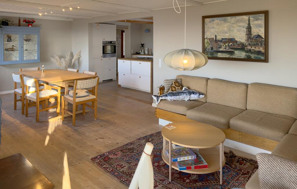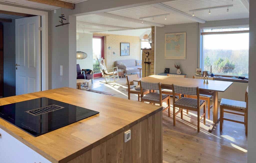 Sæt jer til rette i den rummelige opholdsstue med komfortable sofaer, store vinduer og direkte udsigt over naturen. Læs en bog i opholdsområdet i udestuestil eller nyd rolige aftener i en afslappet atmosfære. Tilbered jeres måltider i det moderne, åbne køkken med kogeø og masser af bordplads. Find sammen omkring spisebordet for at spise sammen, spille spil eller planlægge næste dags aktiviteter.
