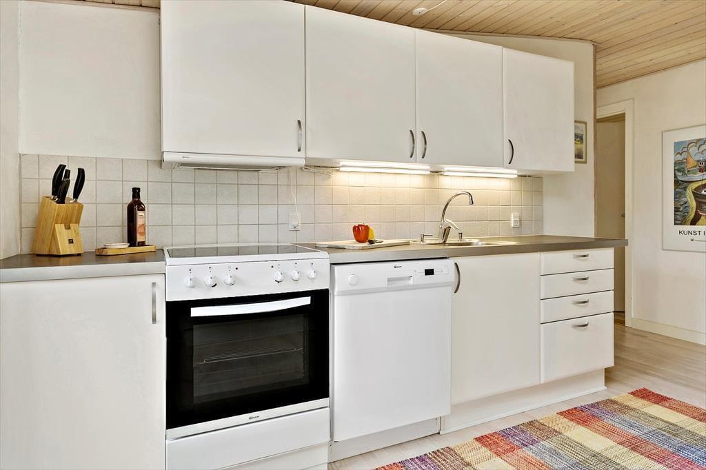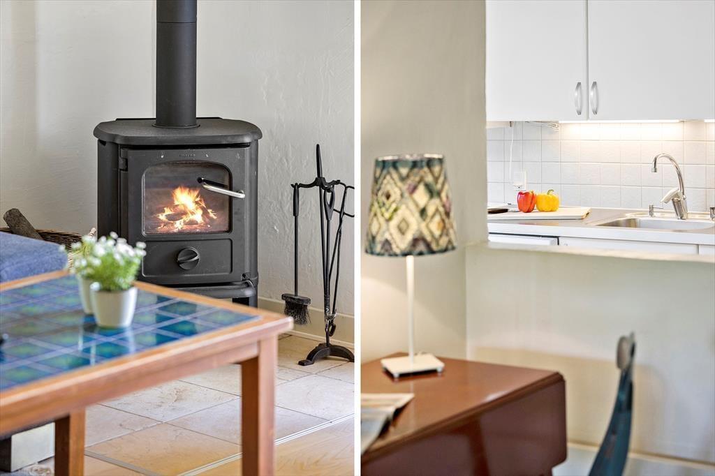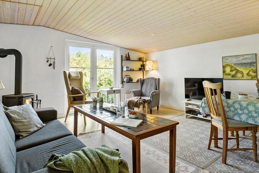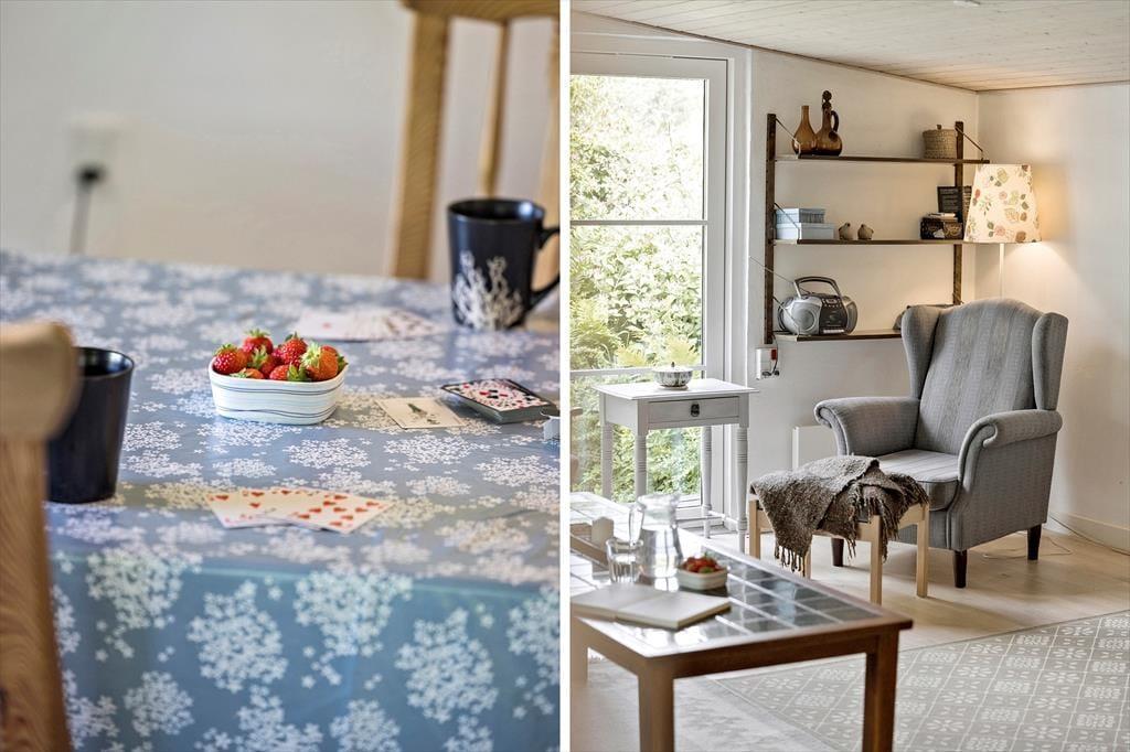 Feriefølelsen melder sig hurtigt, når du ankommer til det fine, hvide hus midt i det grønne. Indenfor byder indretningen på en hjemlig og komfortabel stil, der inviterer dig til at finde ro og nyde dine feriedage. Har du brætspil, strikketøj eller gode bøger med, er stuen det oplagte sted at slå sig ned – her er brændeovn, bløde møbler og en hyggelig spiseplads. Der er åben forbindelse til køkkenet, og derudover rummer huset tre soveværelser og et brusebadeværelse. Det største af soveværelserne har direkte adgang til terrassen, så du kan begynde dagen med et skridt ud i haven og en god portion frisk luft.