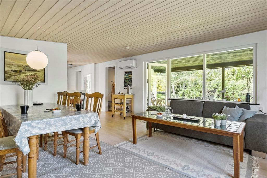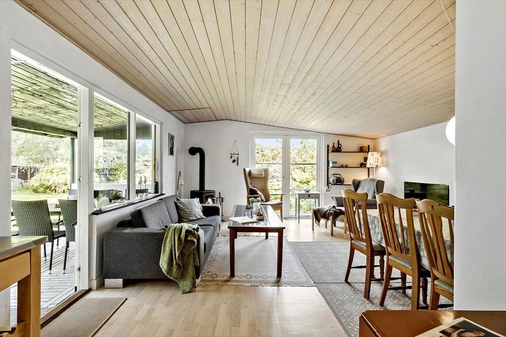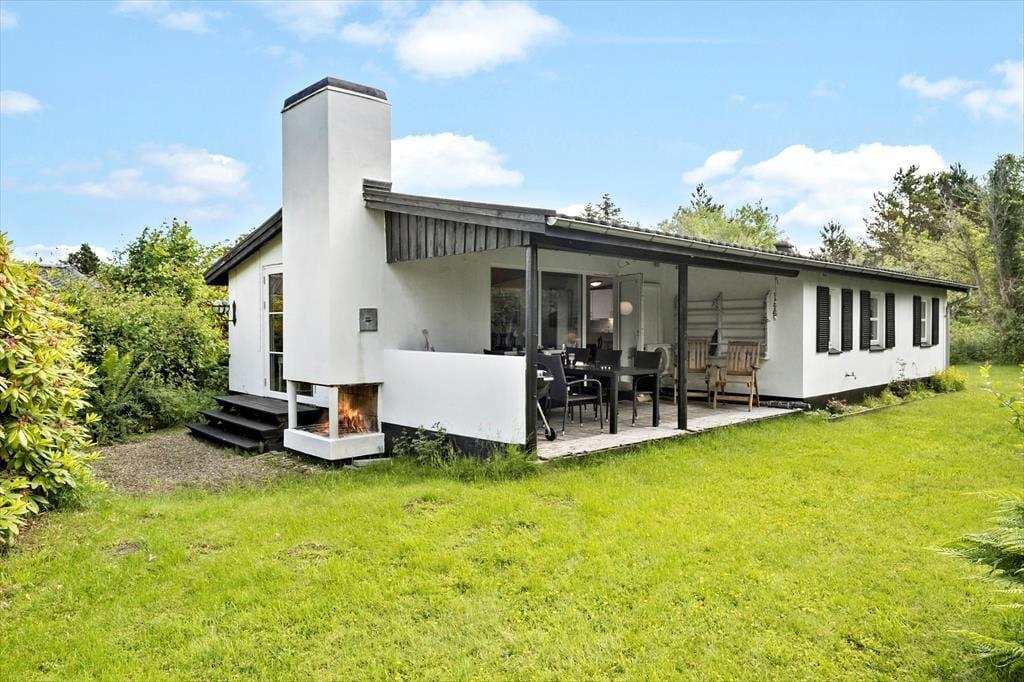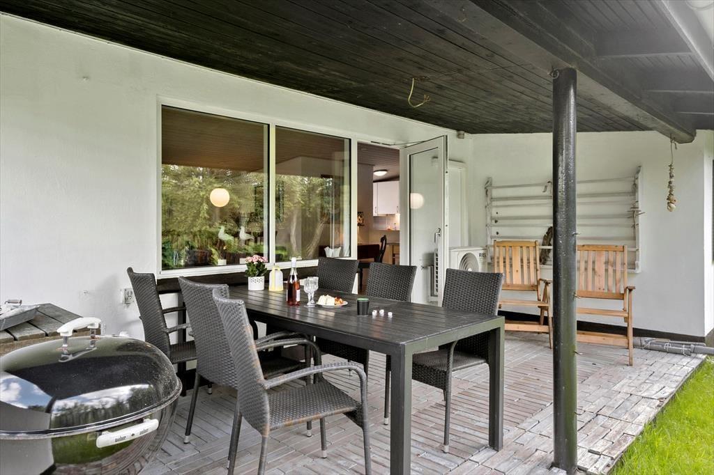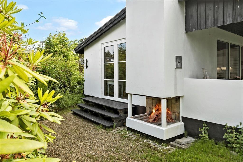 På en fredfyldt sommermorgen kan du oplagt spise morgenmad og drikke kaffe ude i det fri – og hvis du ikke har lagt planer for dagen, er det fristende at blive her i timevis for at nyde det gode vejr på tilbagelænet vis. Der ligger en åben terrasse ud for køkkenet, og mod syd fungerer en overdækket terrasse som en dejlig forlængelse af stuen. På husets vestside finder du en udendørs pejs: Tænk, hvor stemningsfuldt det kan være at sidde her en stille sommeraften, omgivet af grundens grønne frodighed og i skæret fra flammerne, mens tusmørket langsomt breder sig.