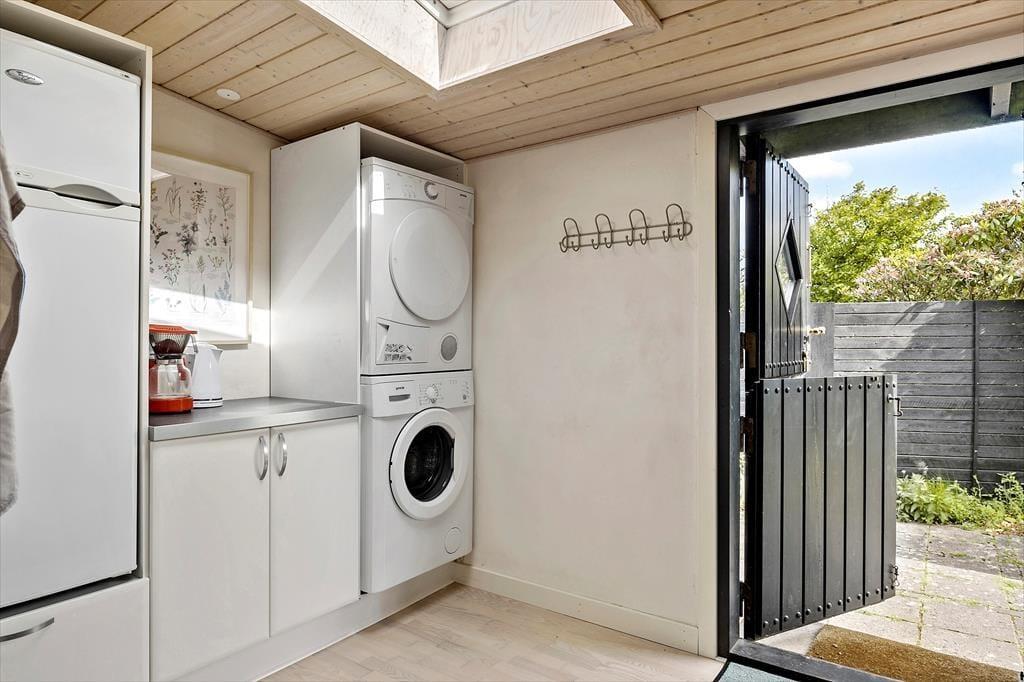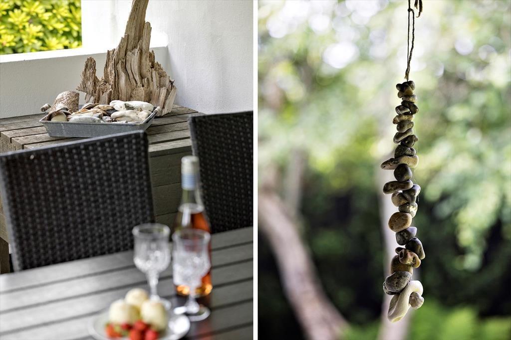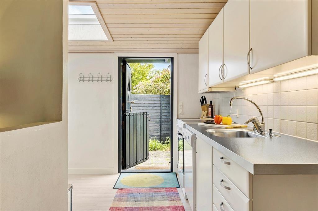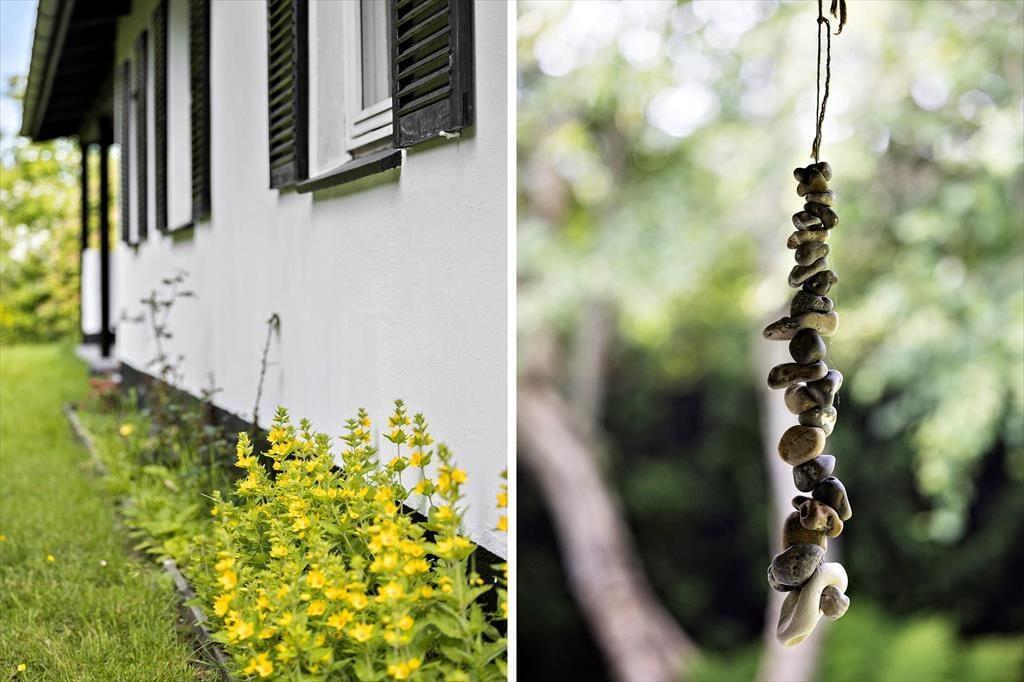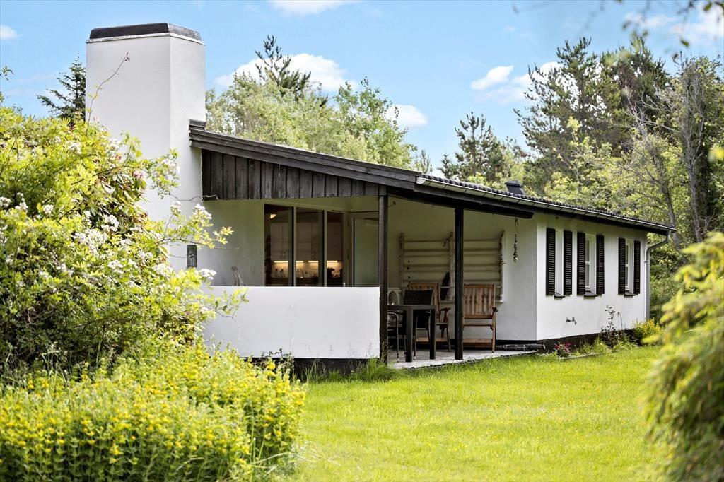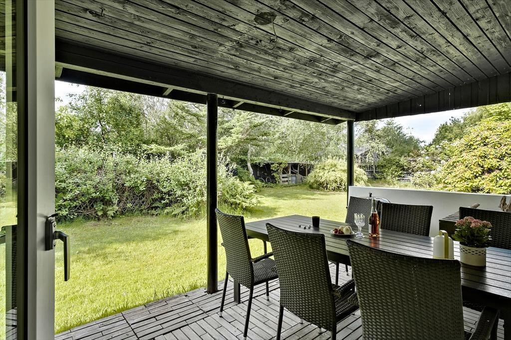 På en fredfyldt sommermorgen kan du oplagt spise morgenmad og drikke kaffe ude i det fri – og hvis du ikke har lagt planer for dagen, er det fristende at blive her i timevis for at nyde det gode vejr på tilbagelænet vis. Der ligger en åben terrasse ud for køkkenet, og mod syd fungerer en overdækket terrasse som en dejlig forlængelse af stuen. På husets vestside finder du en udendørs pejs: Tænk, hvor stemningsfuldt det kan være at sidde her en stille sommeraften, omgivet af grundens grønne frodighed og i skæret fra flammerne, mens tusmørket langsomt breder sig.