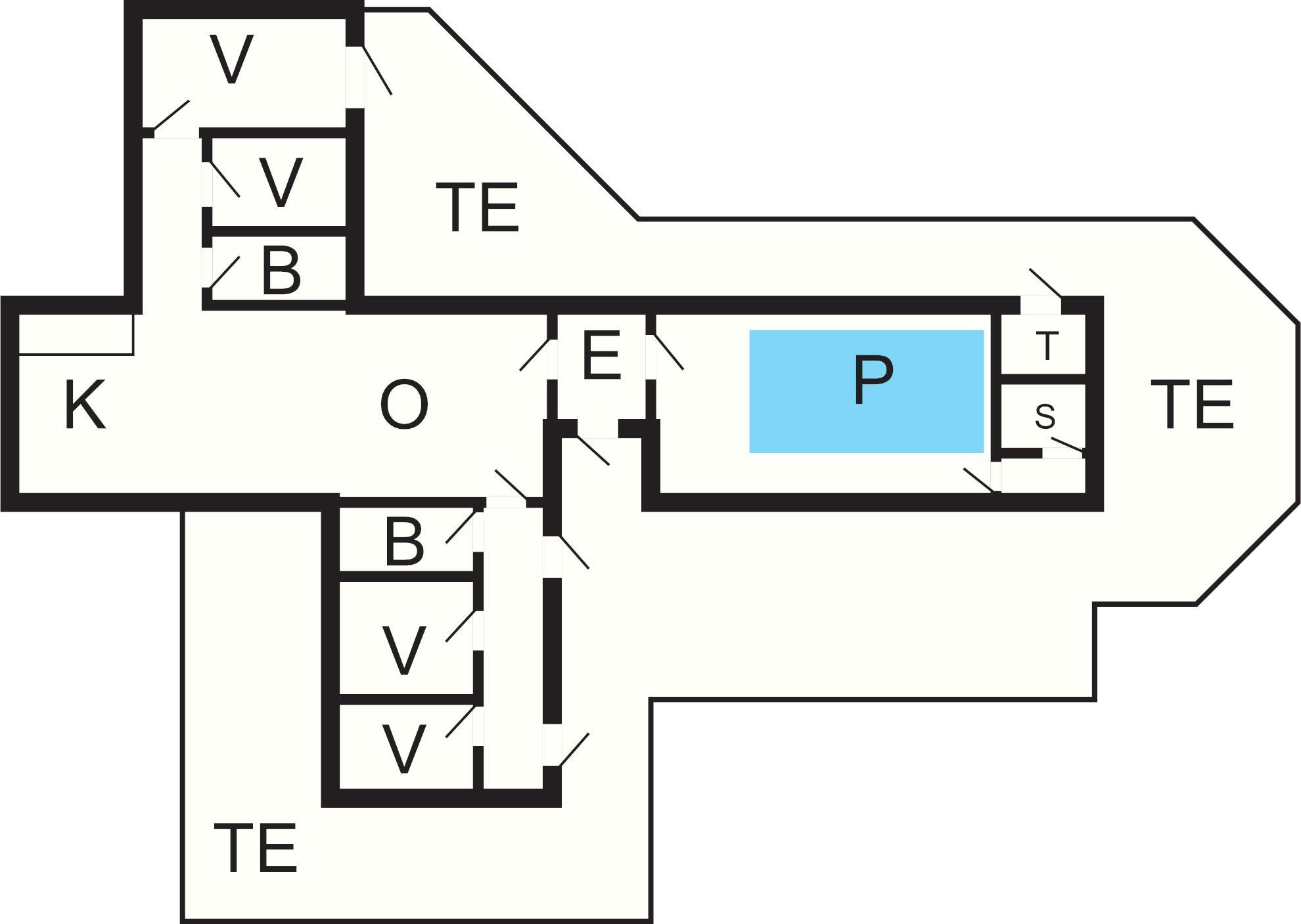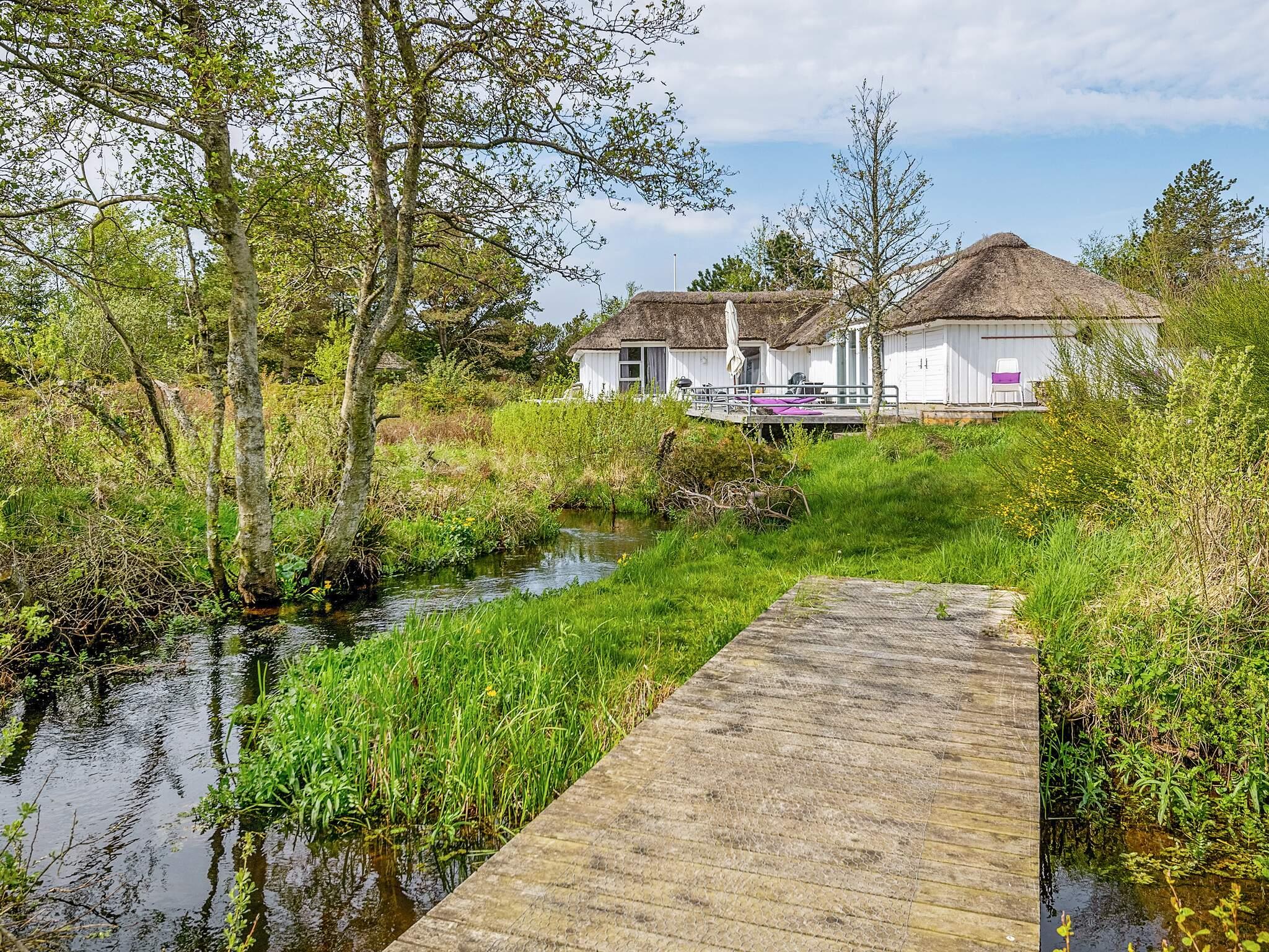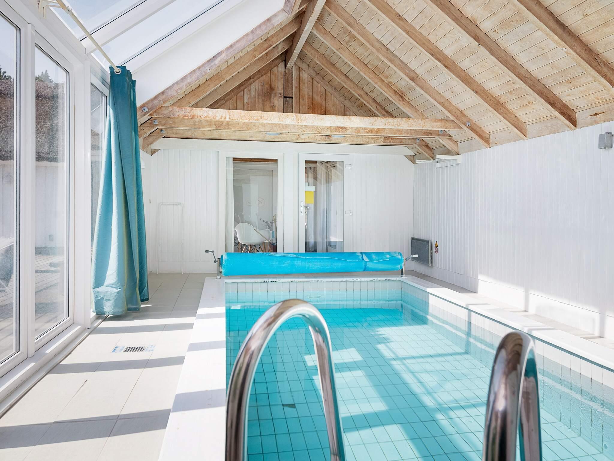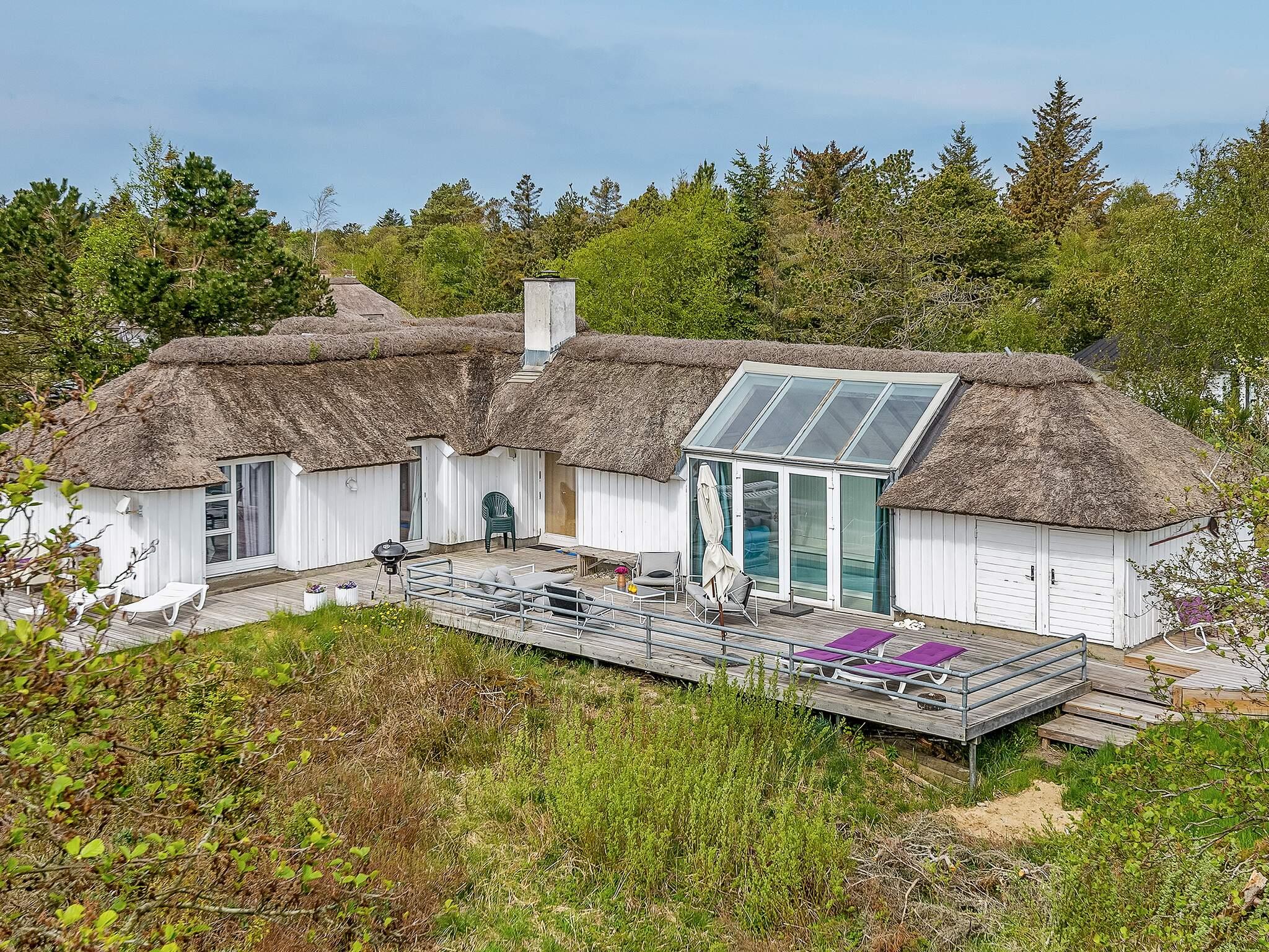 Stort sommerhus med stråtag og indendørs swimmingpool (18 m2) og sauna.
