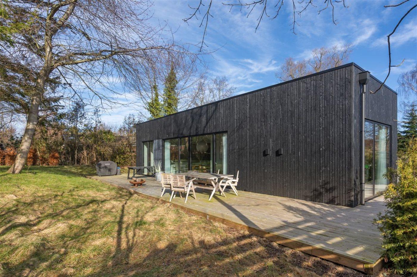 Nyt sommerhus fra 2021 med moderne faciliteter, beliggende på en ugenert grund ved en sø nær Smidstrup Strand.