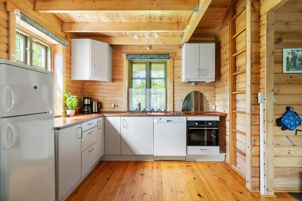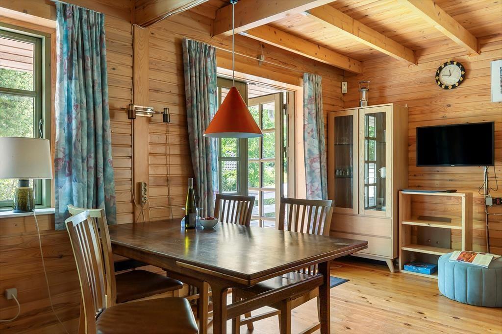 Sommerhusets hyggelige og varme atmosfære skaber de perfekte rammer for en afslappende ferie. Hjerterummet er den kombinerede opholds- og spisestue, hvor du kan samles med familie og venner. Her kan du slappe af i de komfortable møbler eller nyde et lækkert måltid ved spisebordet. Fra opholdsstuen er der direkte udgang til en stor træterrasse, hvor du kan nyde de lune sommeraftener. Køkkenet ligger i åben forbindelse med stuen og er fuldt udstyret, så du let kan lave dine livretter, mens samtalen fortsætter på tværs af rummet.