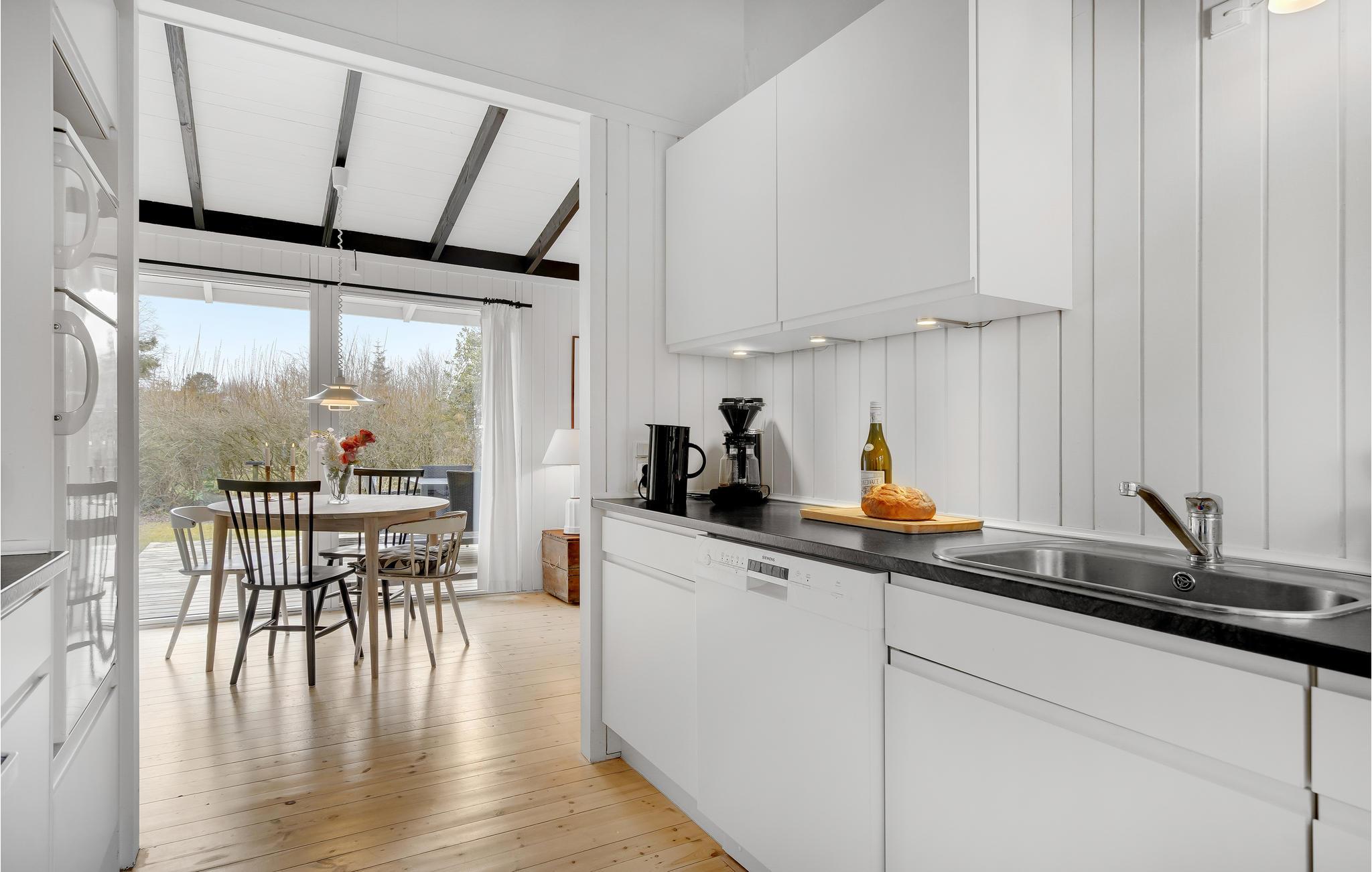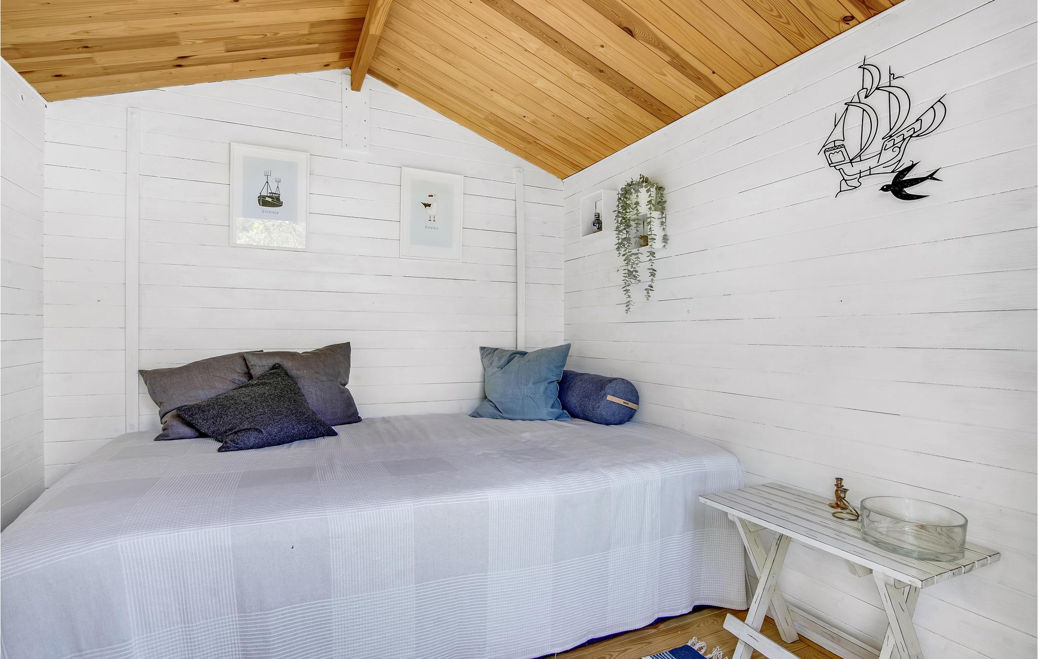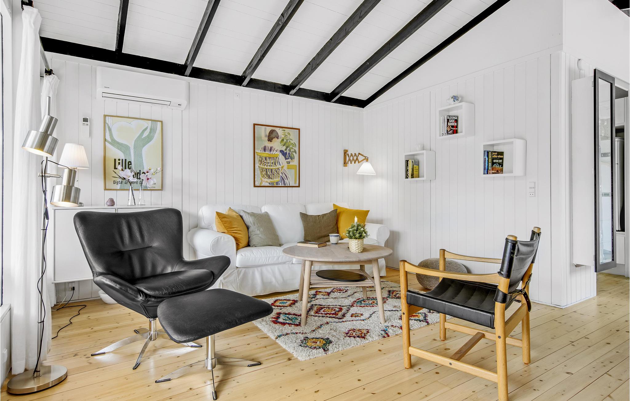 Feriehuset venter sine gæster på en smuk ejendom omgivet af træer og er lyst og indbydende. De 2 soveværelser med dobbeltsenge kan rumme 4 personer. Talrige store vinduer slipper meget lys ind i huset, og i stuen kan I gøre jer komfortabel ved brændeovnen efter en lang gåtur i naturen.