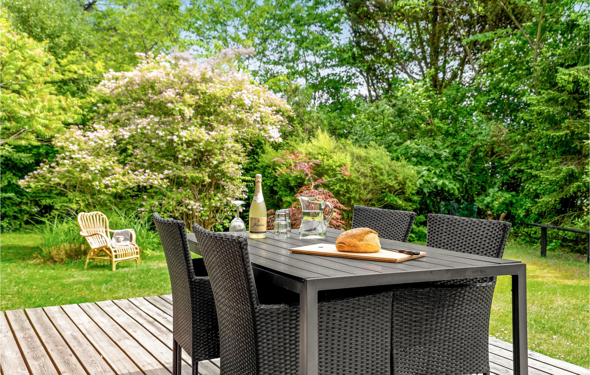 Indbydende træsommerhus nær Smidstrup strand med terrasse, brændeovn og udendørs bruser.