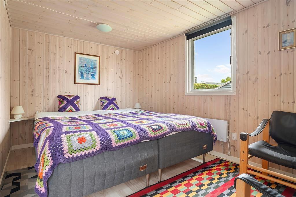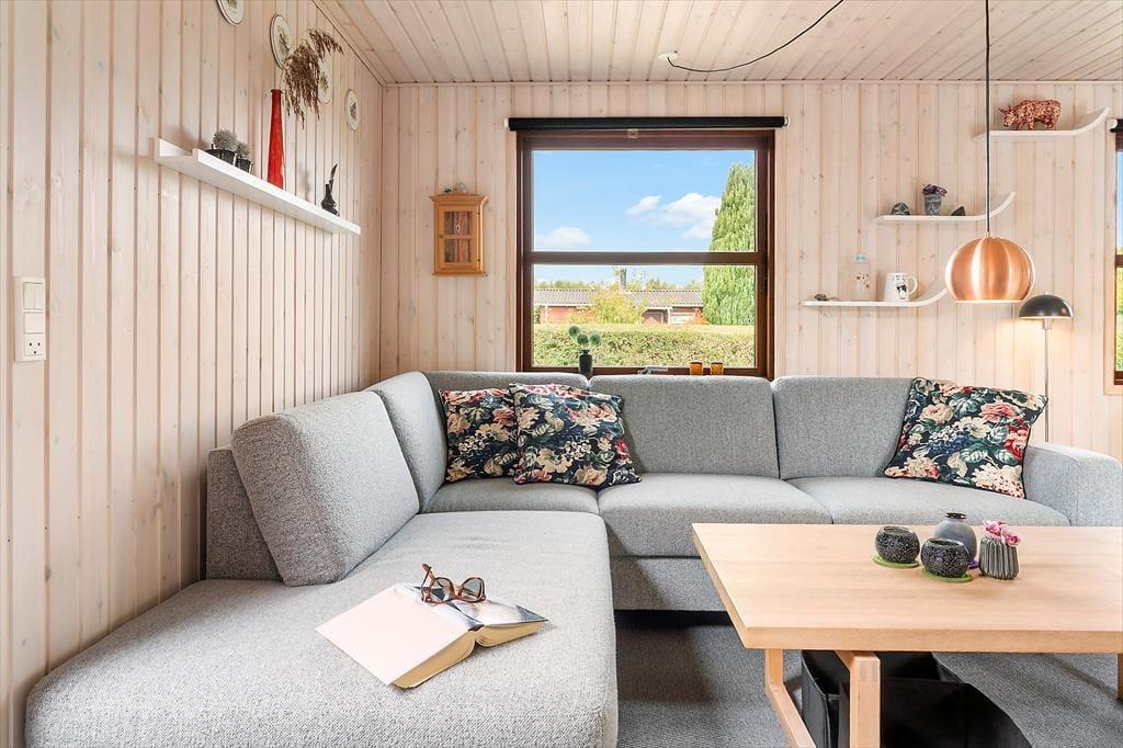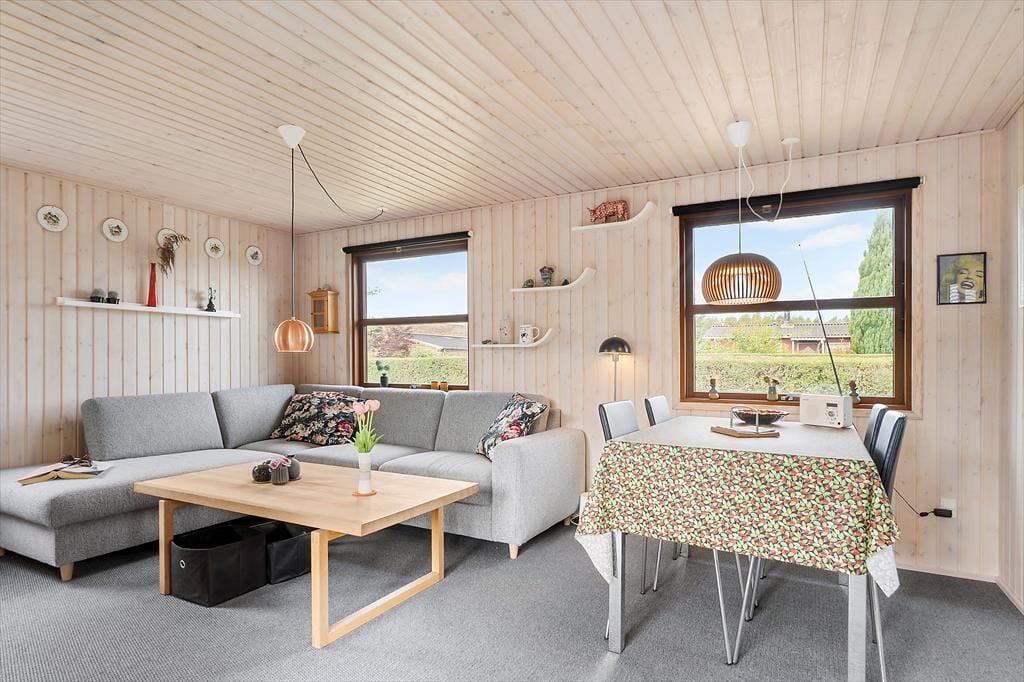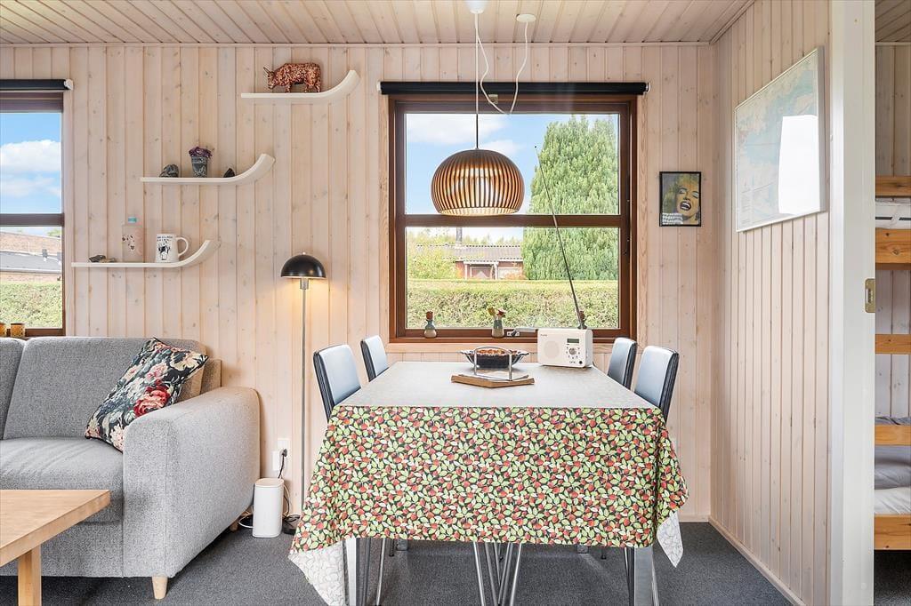 I dette mindre klassiske sommerhus, kan du med det samme mærke, at her er der hygge og at I kan nyde ferien med hinanden. Vinduerne i alrummet giver et dejligt lysindfald, og haven kommer på den måde helt indenfor. De gennemgående lyse trævægge overalt i huset skaber en dejlig sommerhusatmosfære, så du kan godt glæde dig til ferien her! Stuen og køkkenet er husets samlingsrum, og i køkkenet gør det muligt at tilberede aftensmaden, mens du fordyber dig i samtaler om dagens oplevelser med dem, der sidder ved spisebordet eller sofaen. Med spisebordet i midten af rummet, er der plads til, at I alle kan spise sammen eller spille et spil hvor øjeblikke blive til minder og latter som fylder rummet. Ved siden af spisebordet og stuen er en havedør ud til en syd vendte overdækket terrasse, så det er også dejligt at tage måltiderne med udenfor og nyde udsigten til natur og have. Det er helt perfekt at sidde her med en bog eller tænde for en god film. Her kan I virkelig slappe af, og nyde at være på ferie.