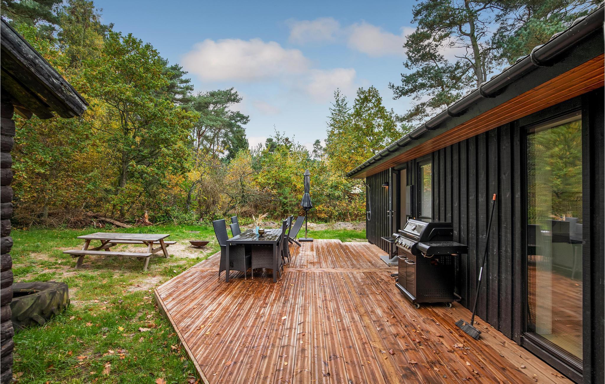 Også udvendigt imponerer huset. Den store træterrasse indbyder til udendørsspisning, mange timers solbadning og hyggelige grillaftener.