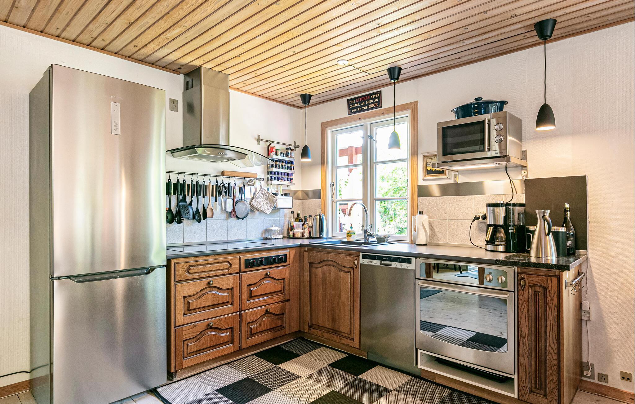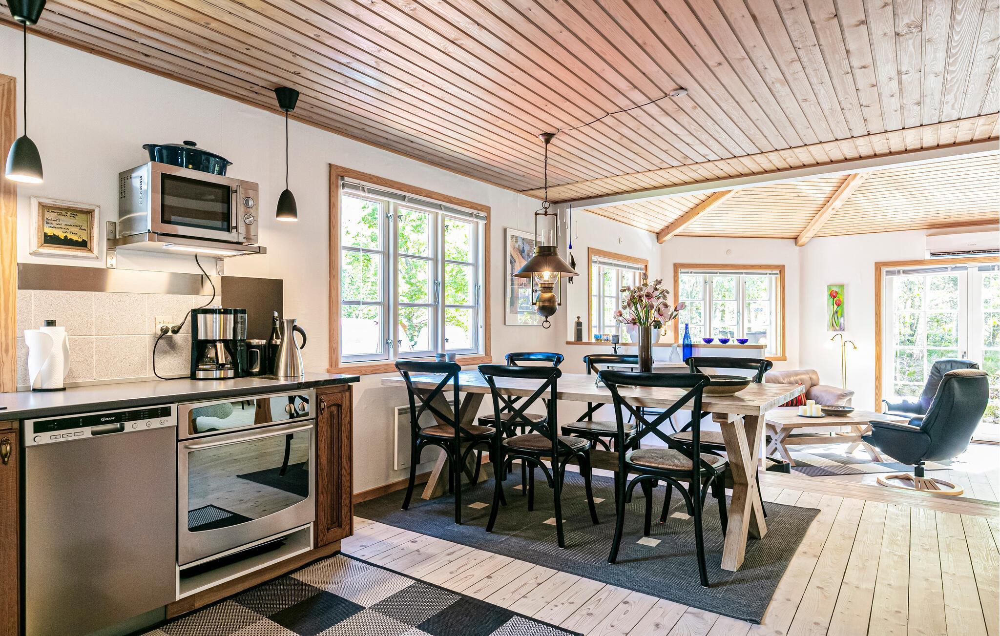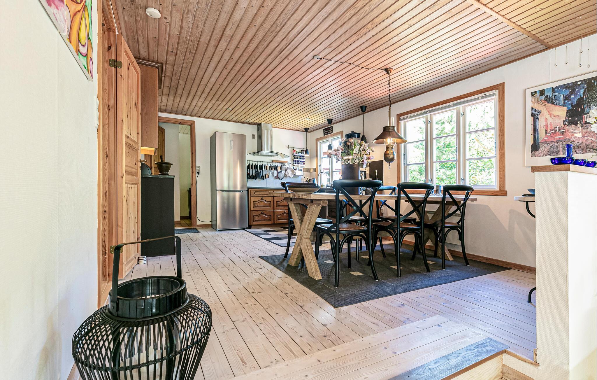 Velkommen til dette indbydende træhus, der ligger smukt omgivet af træer og buske ved skønne Snogebæk. Indretningen fremtræder yderst flot med velholdte trælofter, åbent boligkoncept og store vinduespartier, der giver stuen flere dejlige lysindfald. Nyd godt af de gode faciliteter og tag jer god tid til madlavningen i det veludstyrede køkken, inden der dækkes op til middagen ved spisebordet. På en gråvejrsdag kan I fyre op i brændeovnen og nyde dens varme knitren, der er det helt rette lydtapet til en hyggelig aften i sofaen med brætspil eller en god film.