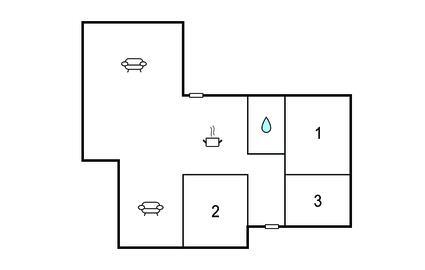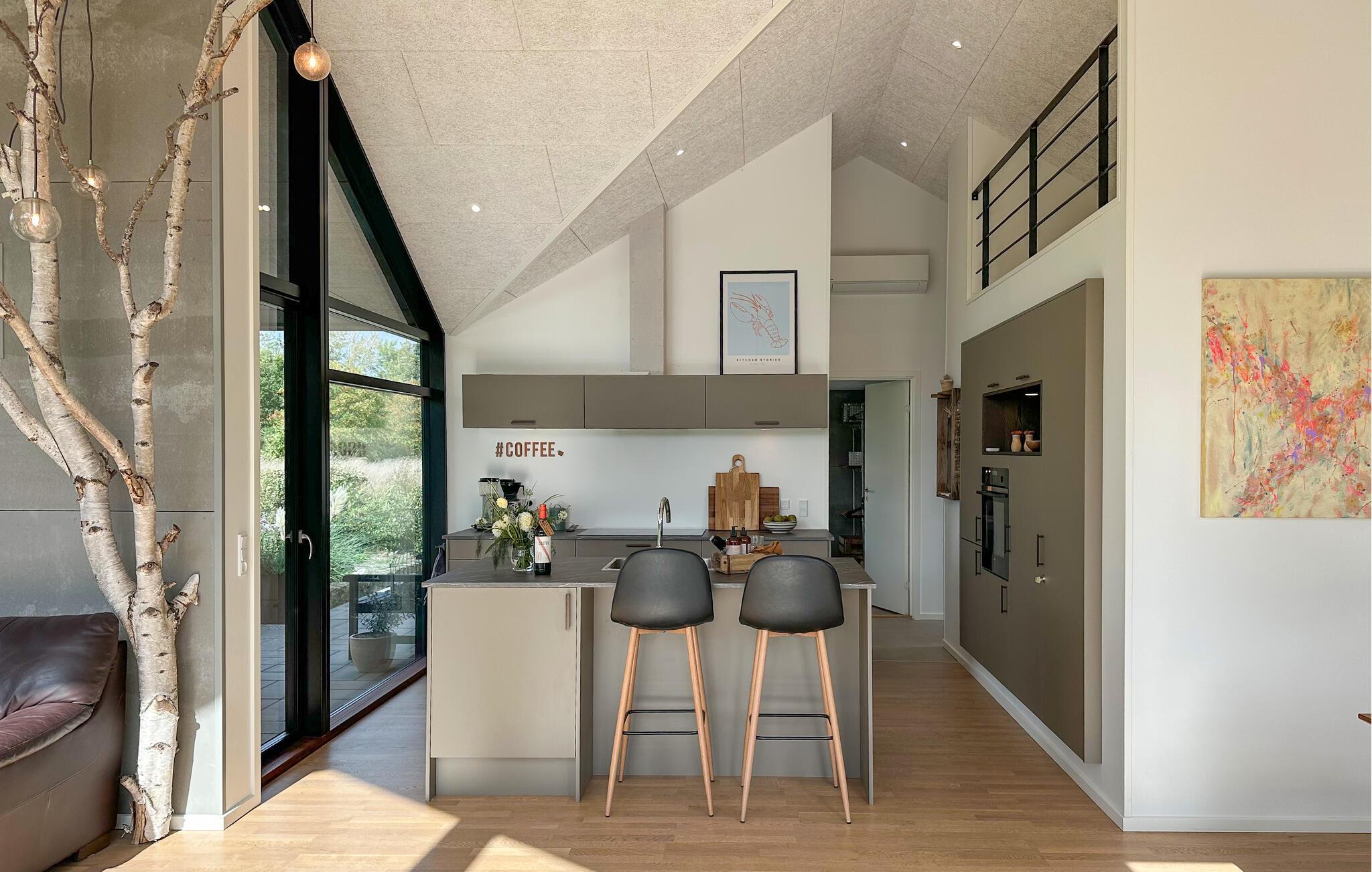 Dette arkitektonisk attraktive feriehus forkæler jer med masser af naturskønt lys takket være sine store vinduer og lover hyggelige dage i sin stilfulde opholdsstue. Glæd jer til at lave lækre måltider i det åbne køkken og spise sammen ved det behageligt oplyste spisebord. Den rummelige stue har en behagelig sofa, hvor I kan nyde gode samtaler med et glas vin.