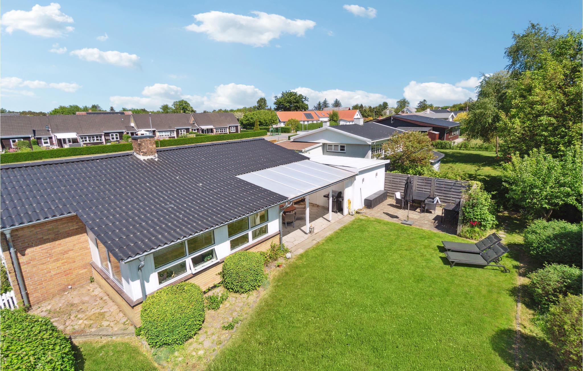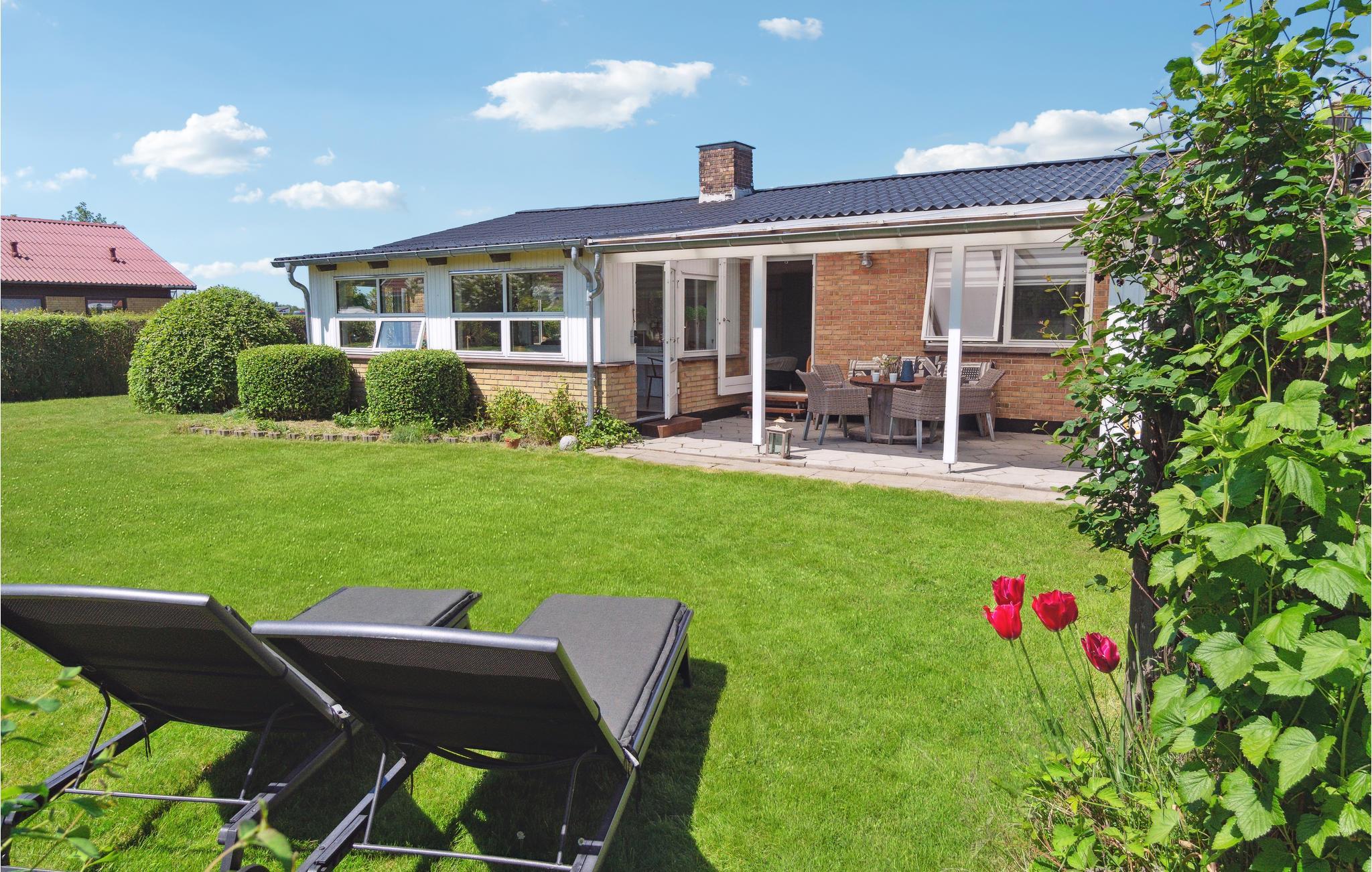 Hyggeligt feriehus i Snogebæk med 600 m til sandstrand, overdækket terrasse og indhegnet have.