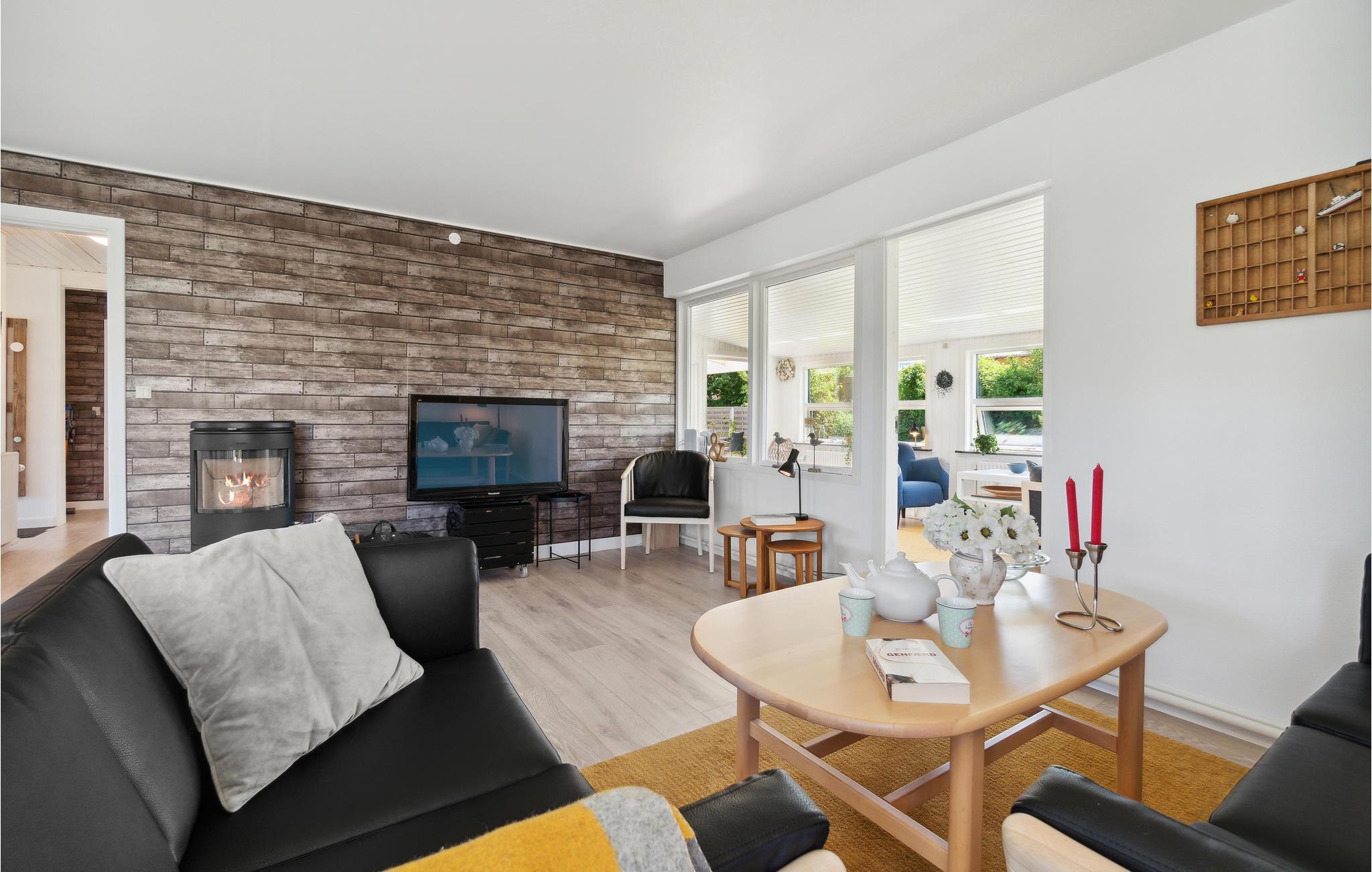 I kommer til at tilbringe mange gode stunder i den rummelige og lyse opholdsstue, hvor I kan flade ud og se fjernsyn og om vinteren lytte til flammernes knitren i brændeovnen. I finder også en spiseplads i stuen. I husets store, åbne og veludstyrede køkken kan I være i gang med at lave mad mange på én gang. Den dejlige havestue er det perfekte sted at trække ind, når det bliver køligt at sidde ude om aftenen. Derudover består huset af tre gode soveværelser, et fint badeværelse og et bryggers med vaskemaskine og fryser (egen indgang).