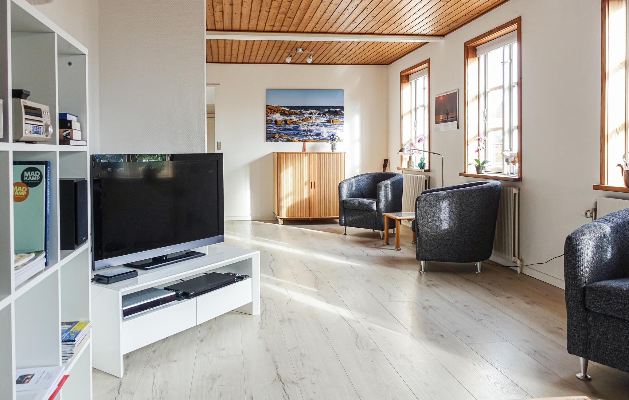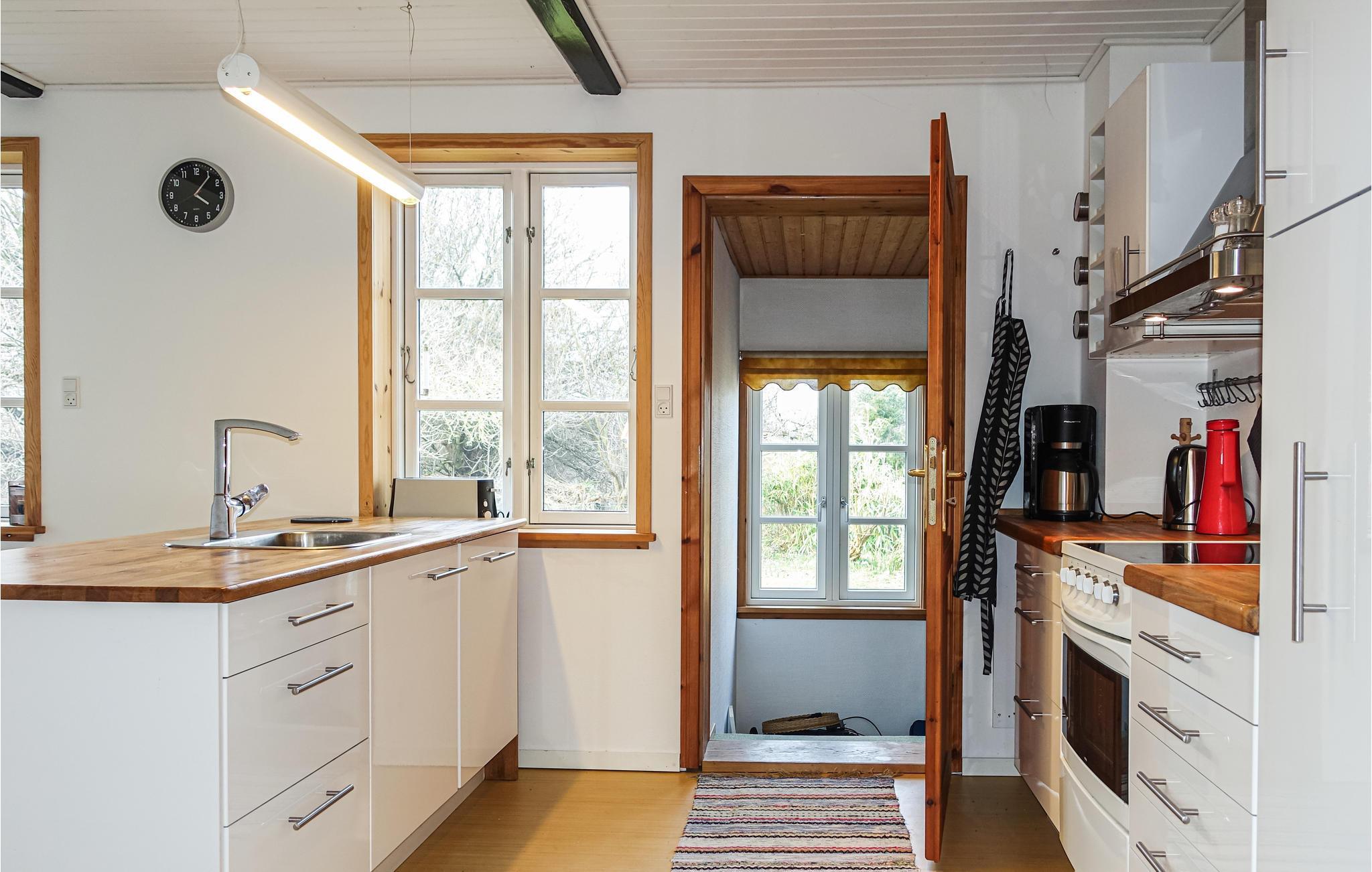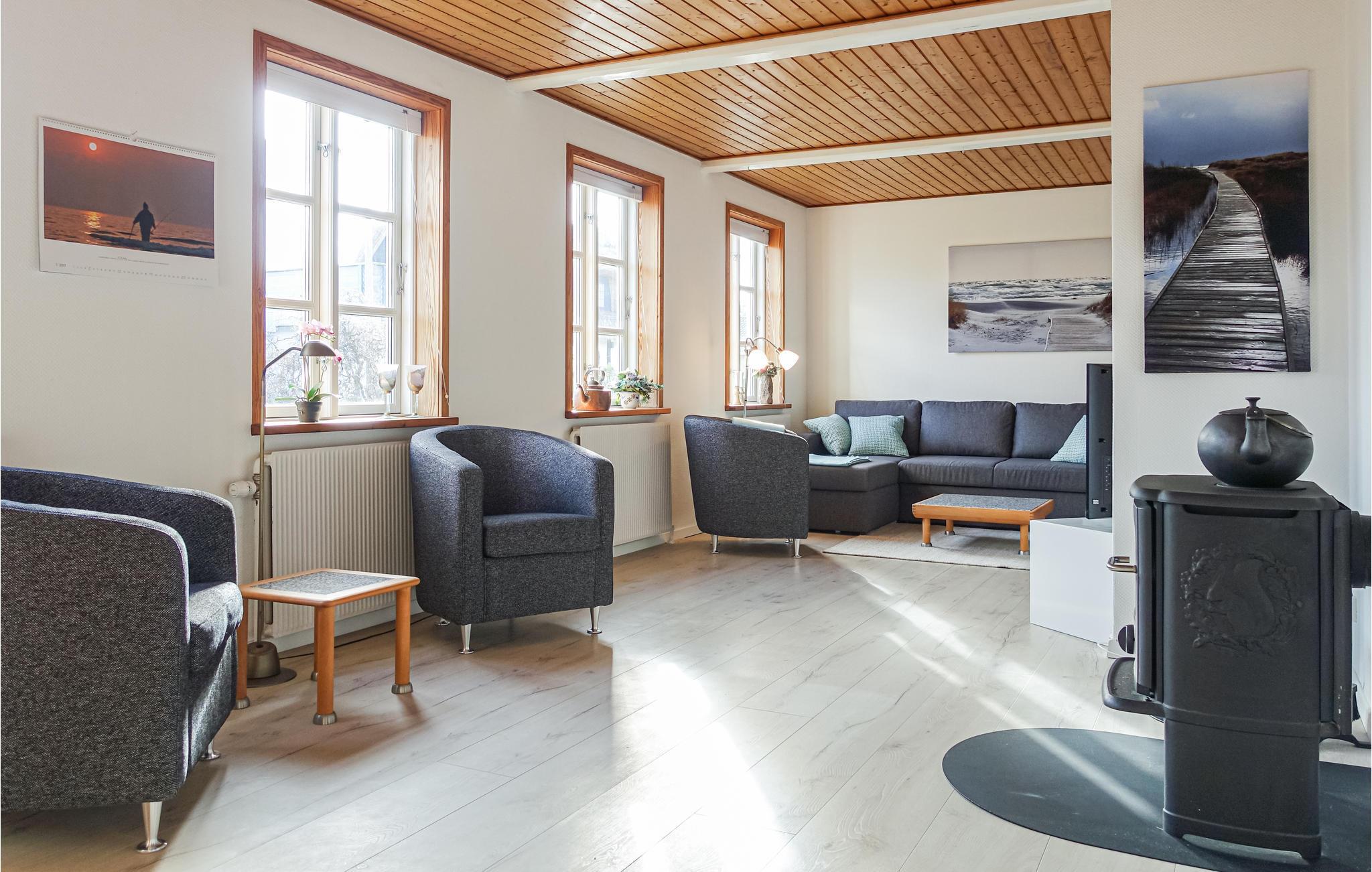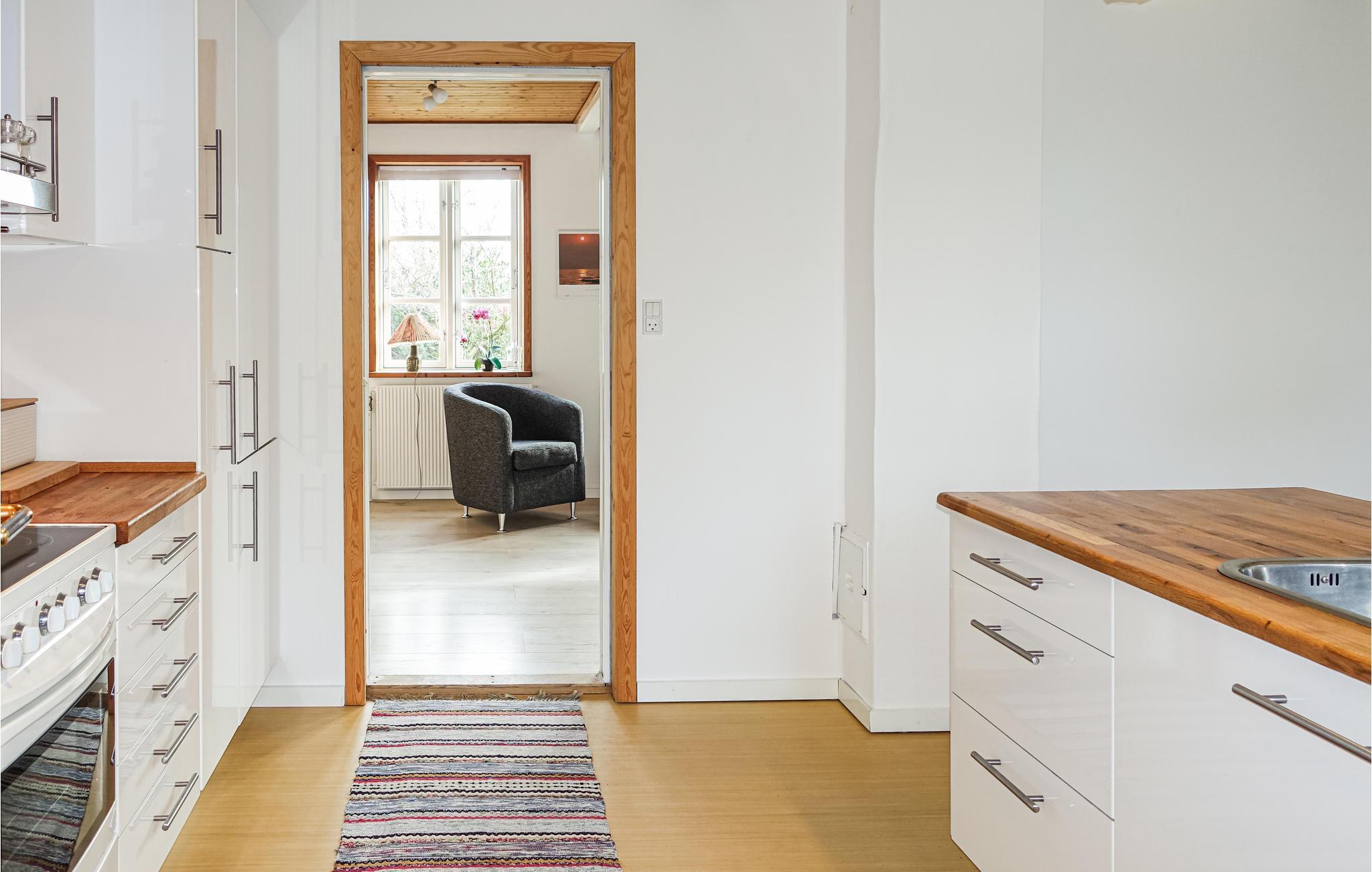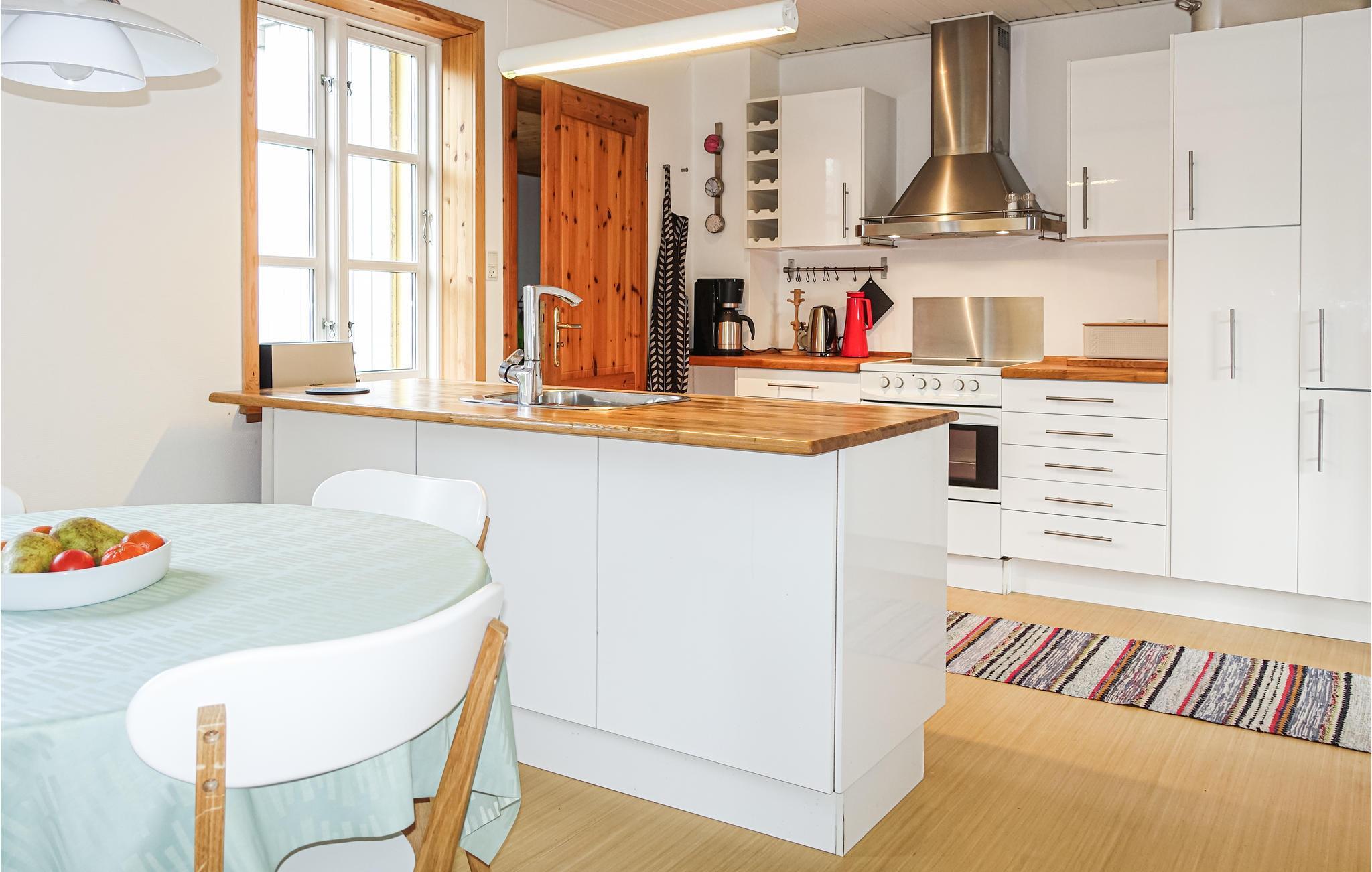 Ferieboligens hjerte er den hyggelige, lyse og attraktivt indrettede opholdsstue, hvor I kan flade godt ud og se fjernsyn og i kølige sæsoner lytte til de knitrende flammer i brændeovnen. I det veludstyrede køkken er det en fornøjelse at lave mad.