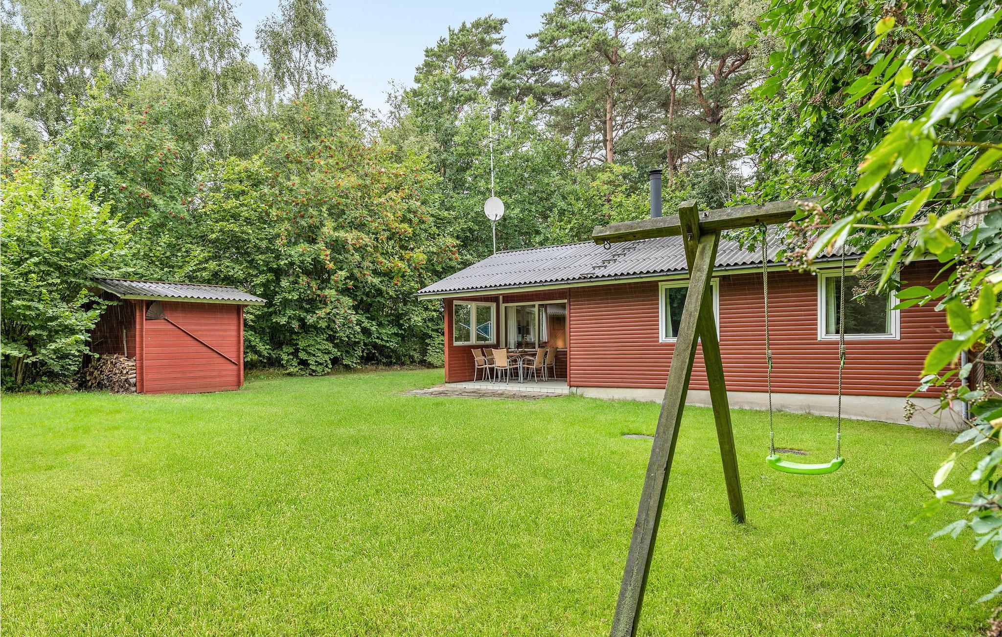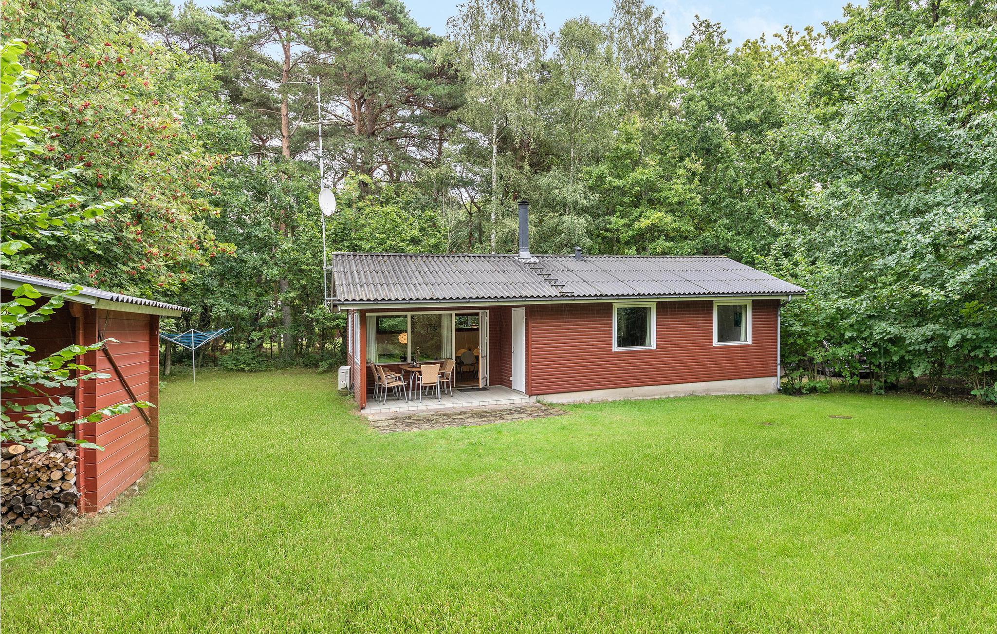 Hyggeligt træsommerhus tæt på børnevenlig badestrand med overdækket terrasse og stor have i skønne Snogebæk.