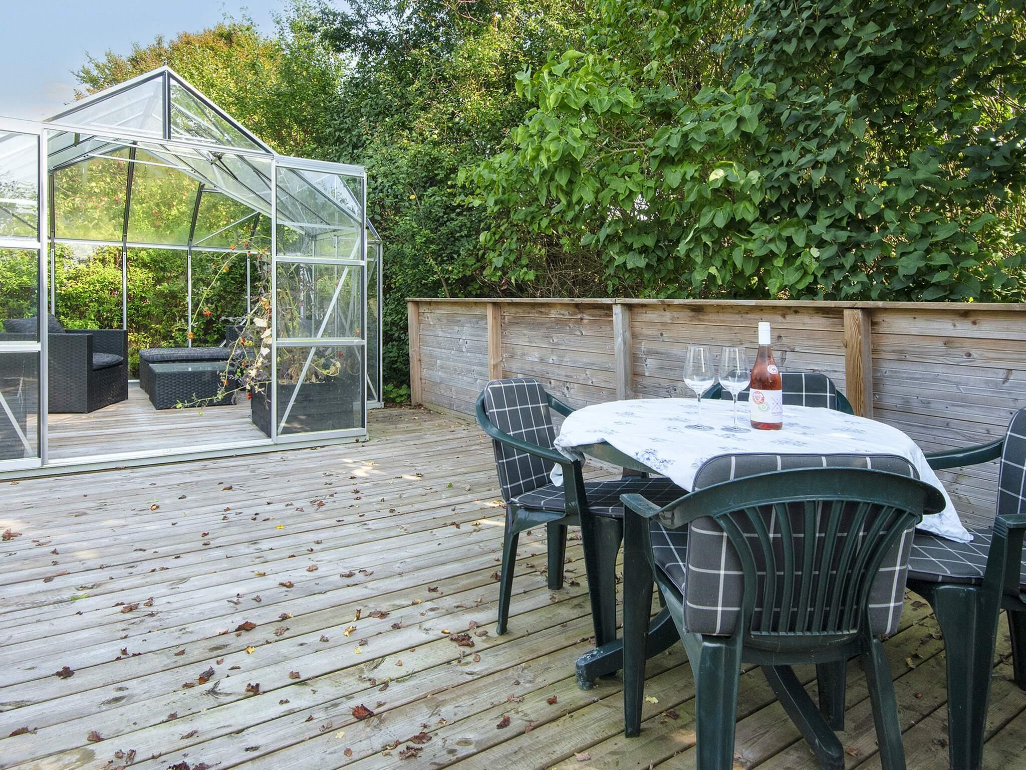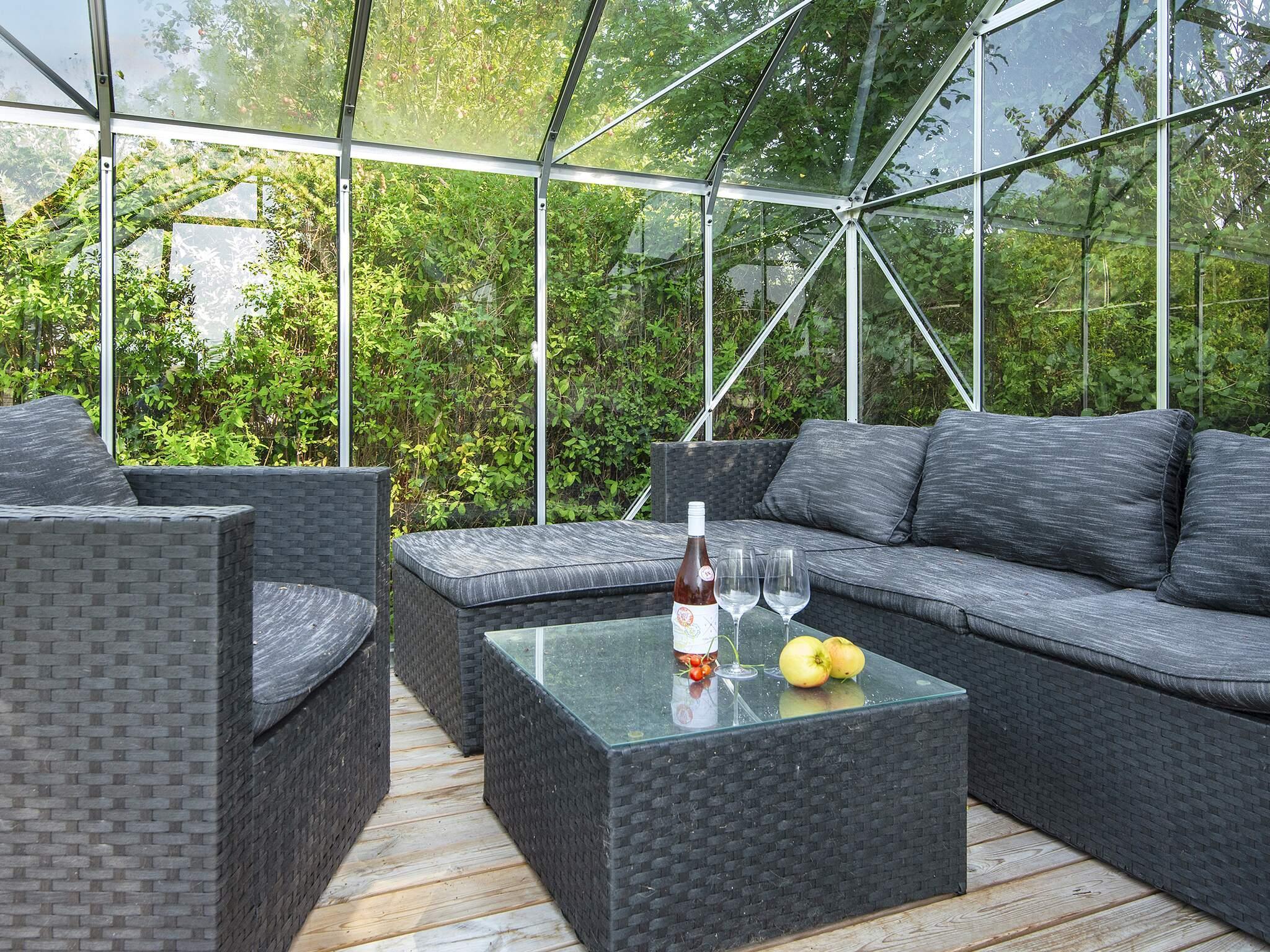 Den store stue har direkte udgang til en skøn overdækket terrasse, hvor du kan nyde dine måltider uanset vejret. Haven har flere hyggelige hjørner, der inviterer til afslapning og fordybelse i en god bog. Der er også et charmerende orangeri, hvor du kan nyde aftenen selv når det blæser.