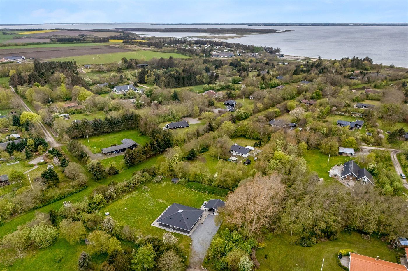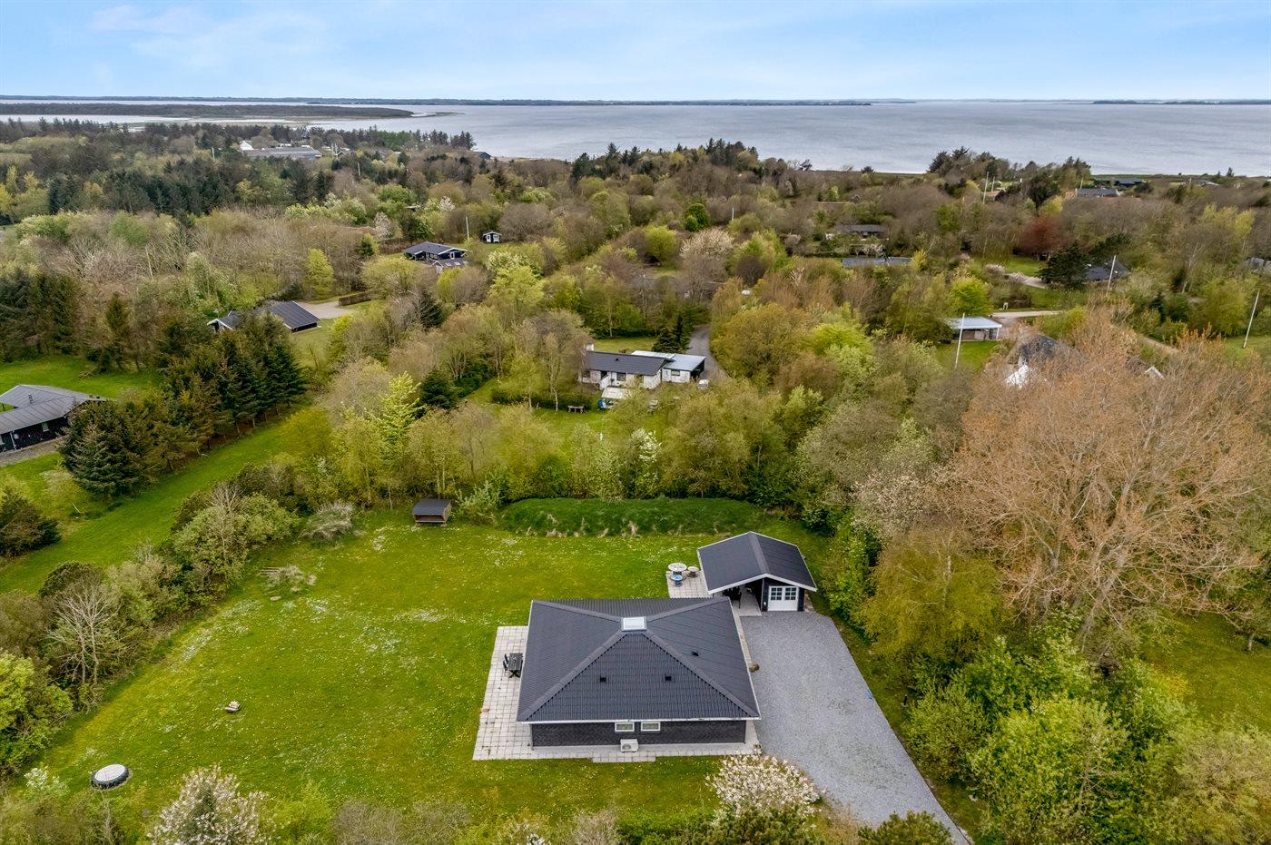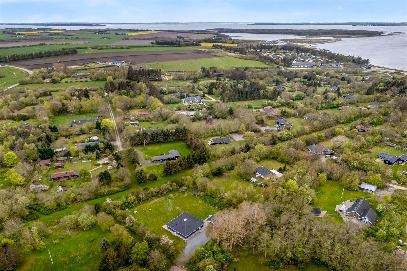Ferieboligen er beliggende på en 2570 m² stor grund i skov/plantage. Der er 400 m til fjorden. Der er en sø i en afstand af 2000 m. Der er en badebro i nærheden. Nærmeste forretning er beliggende i en afstand af 3000 m. Til ferieboligen hører åbent terrasseareal. Desuden er der overdækket terrasse. Der ligger en legeplads i en afstand af 200 m. Bålsted. Shelter. Der er mulighed for at tilberede maden udendørs i udekøkkenet. Der er installeret stik til opladning af elbil. Med 11 kW ladeeffekt. Parkering ved ferieboligen.