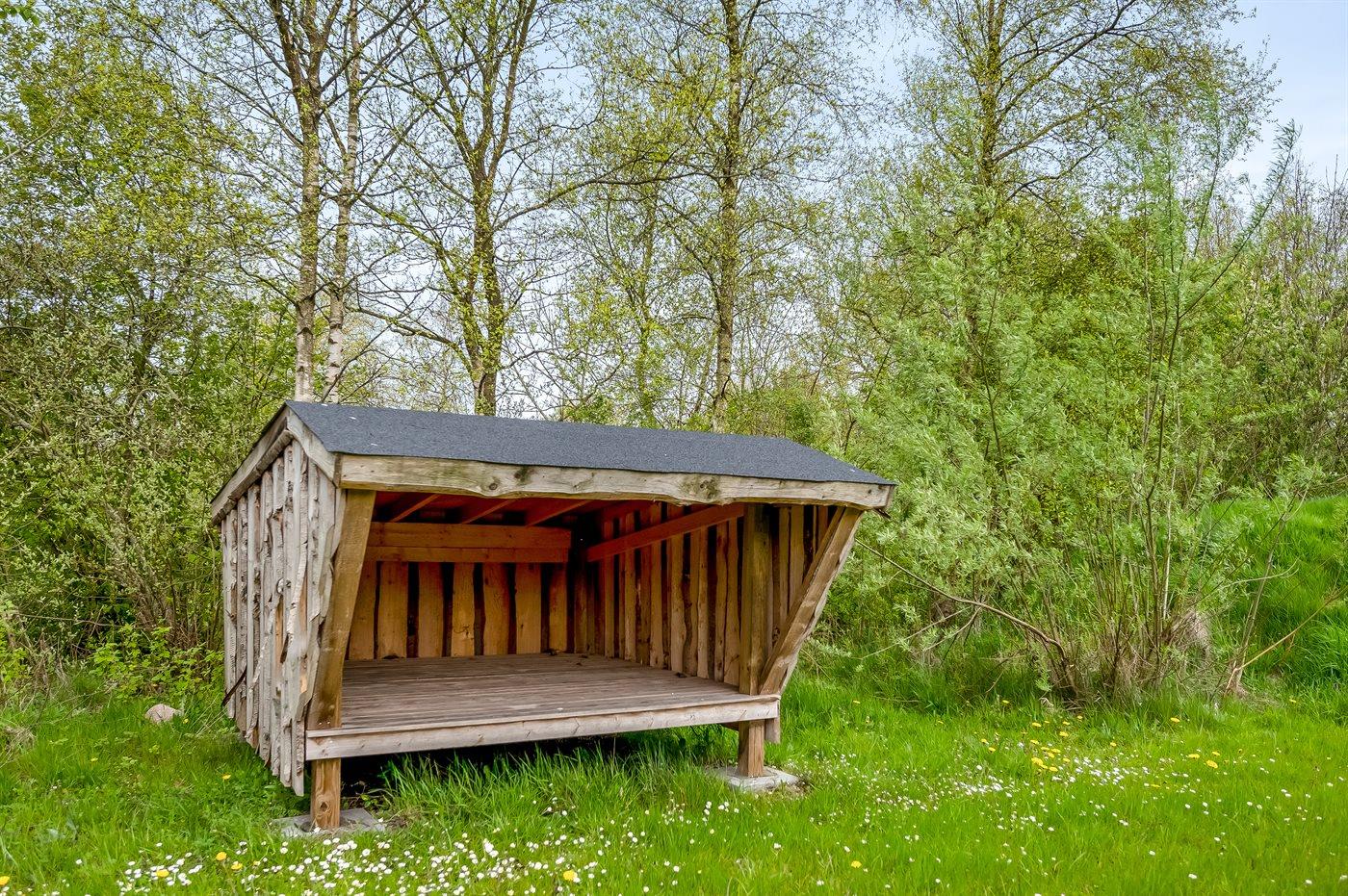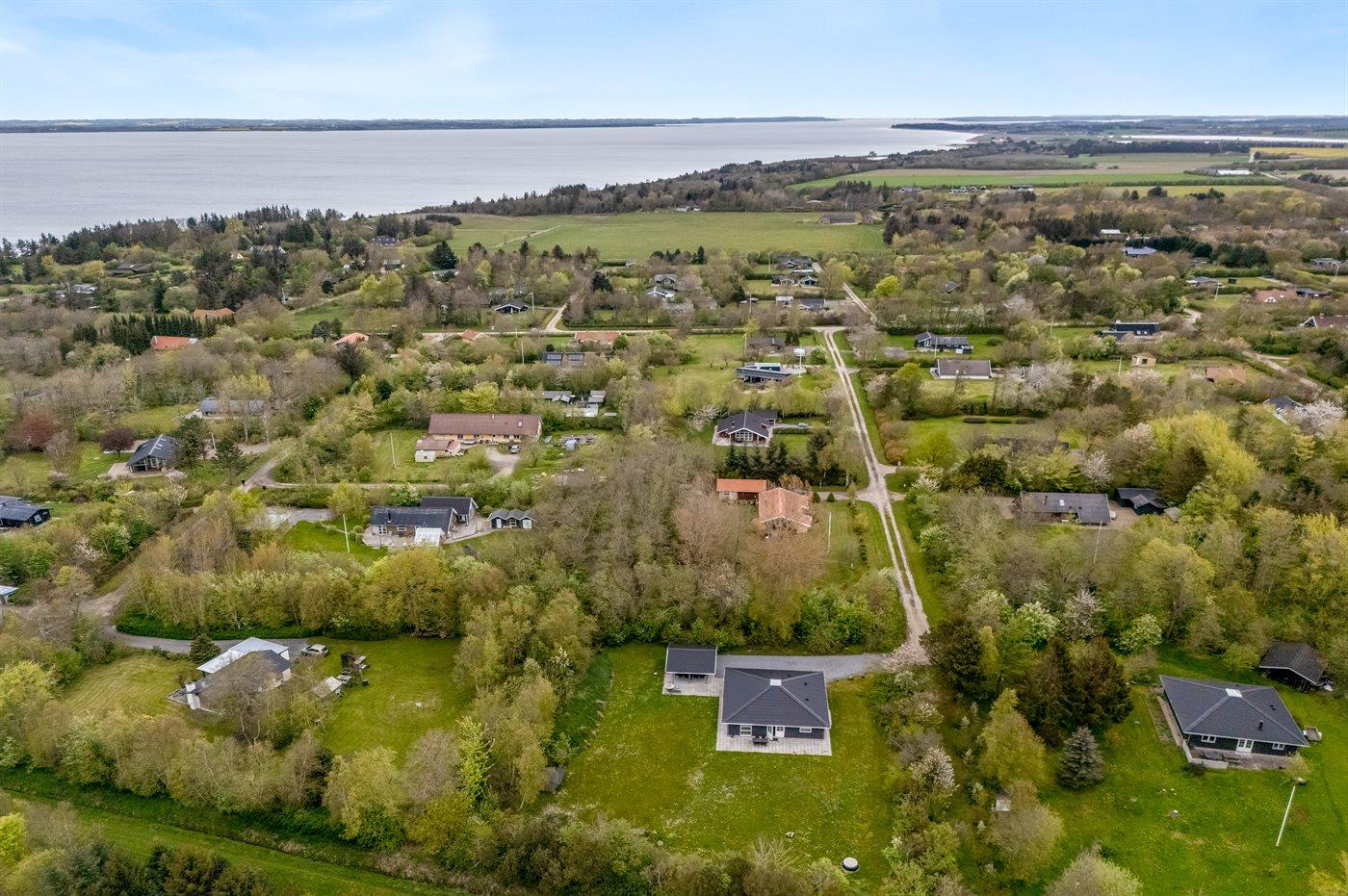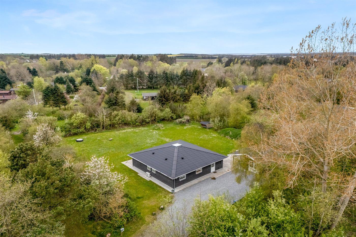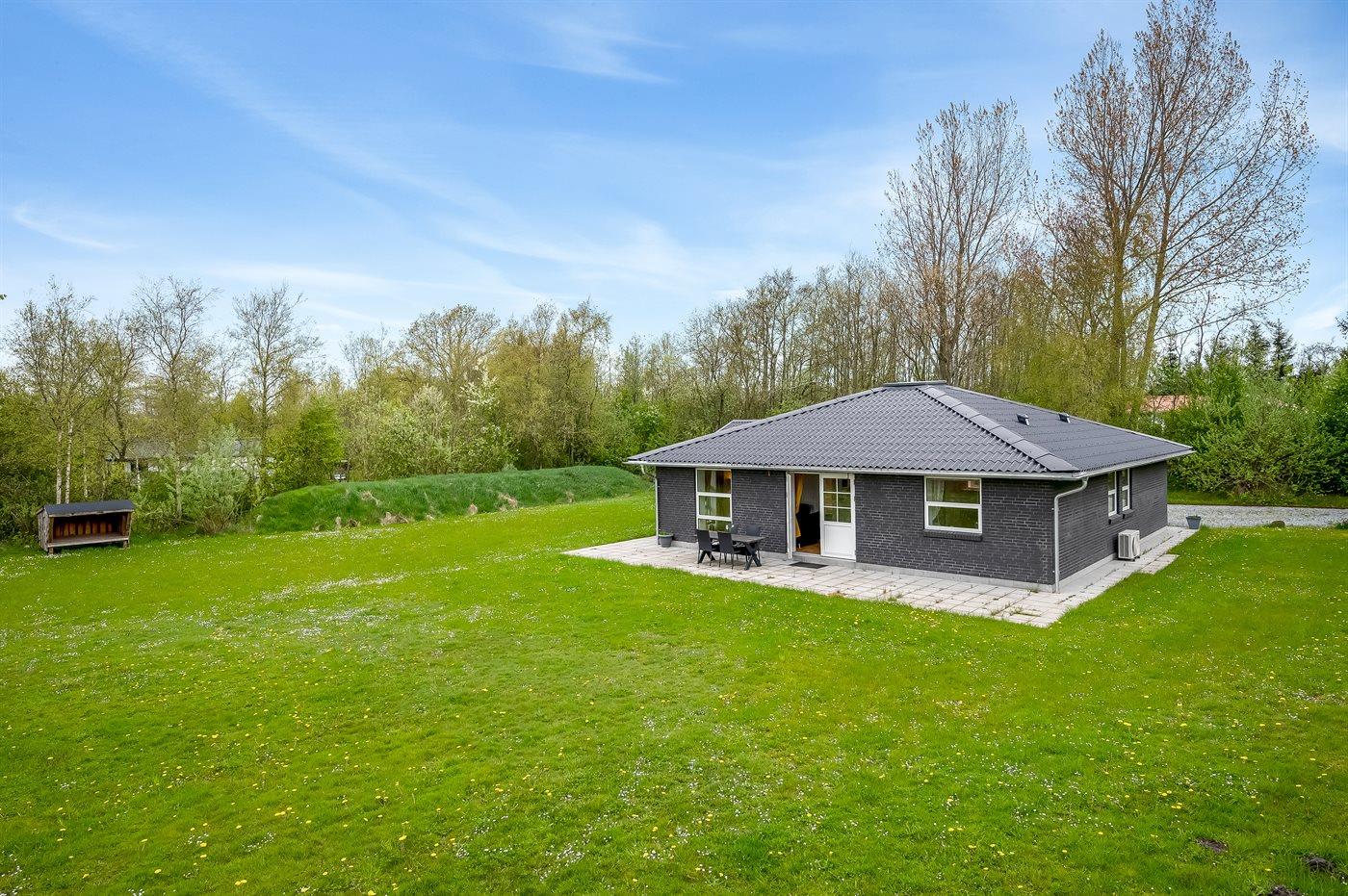 Ferieboligen er beliggende på en 2570 m² stor grund i skov/plantage. Der er 400 m til fjorden. Der er en sø i en afstand af 2000 m. Der er en badebro i nærheden. Nærmeste forretning er beliggende i en afstand af 3000 m. Til ferieboligen hører åbent terrasseareal. Desuden er der overdækket terrasse. Der ligger en legeplads i en afstand af 200 m. Bålsted. Shelter. Der er mulighed for at tilberede maden udendørs i udekøkkenet. Der er installeret stik til opladning af elbil. Med 11 kW ladeeffekt. Parkering ved ferieboligen.
