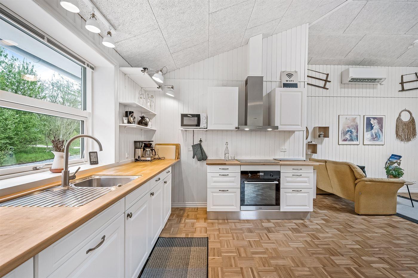 Køkkenet er udstyret med 1 køleskab. Der er 4 induktionskogeplader, varmluftovn, mikrobølgeovn samt opvaskemaskine.