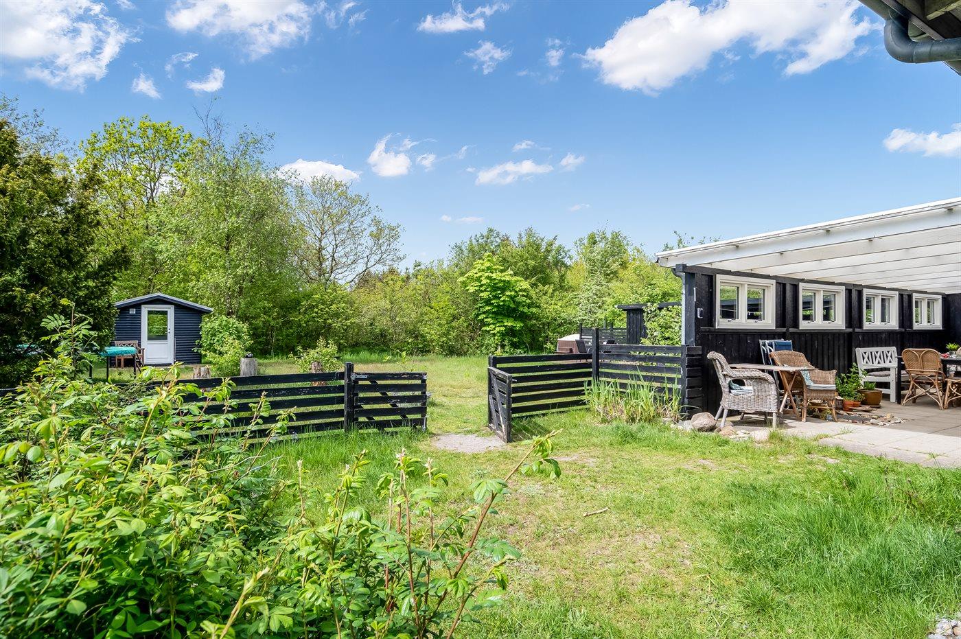 Ferieboligen er beliggende på en 1200 m² stor grund i skov/plantage. Der er 150 m til fjorden. Nærmeste forretning er beliggende i en afstand af 3200 m. Til ferieboligen hører åbent terrasseareal. Desuden er der overdækket terrasse. Der er installeret stik til opladning af elbil. Type 2 stik. Parkering ved ferieboligen.
