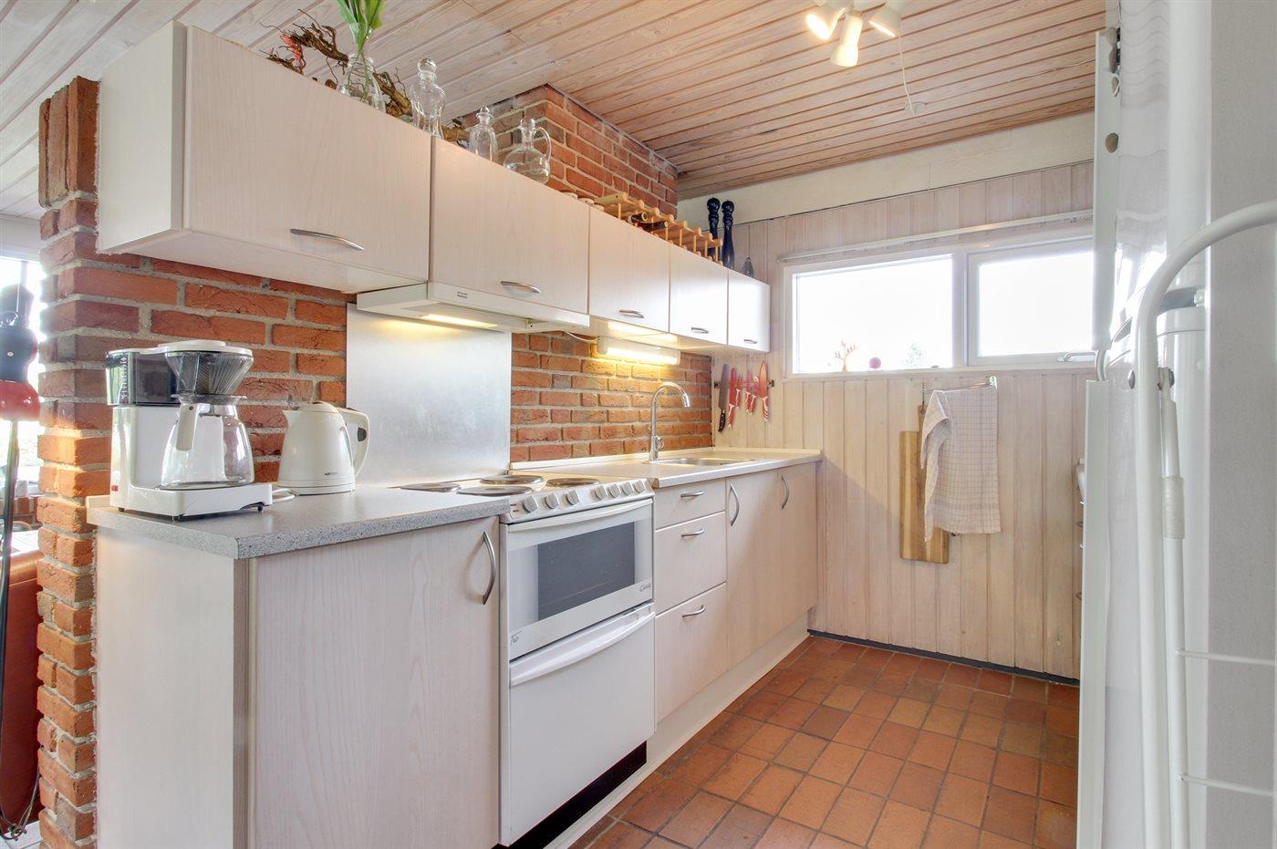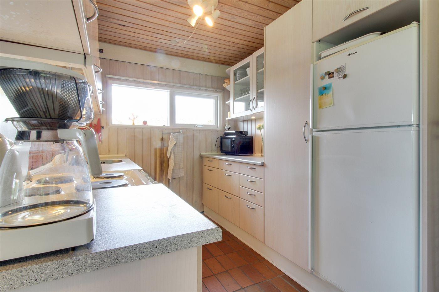 Køkkenet er udstyret med 1 køleskab. Der er 4 elkogeplader, bageovn, mikrobølgeovn samt opvaskemaskine.
