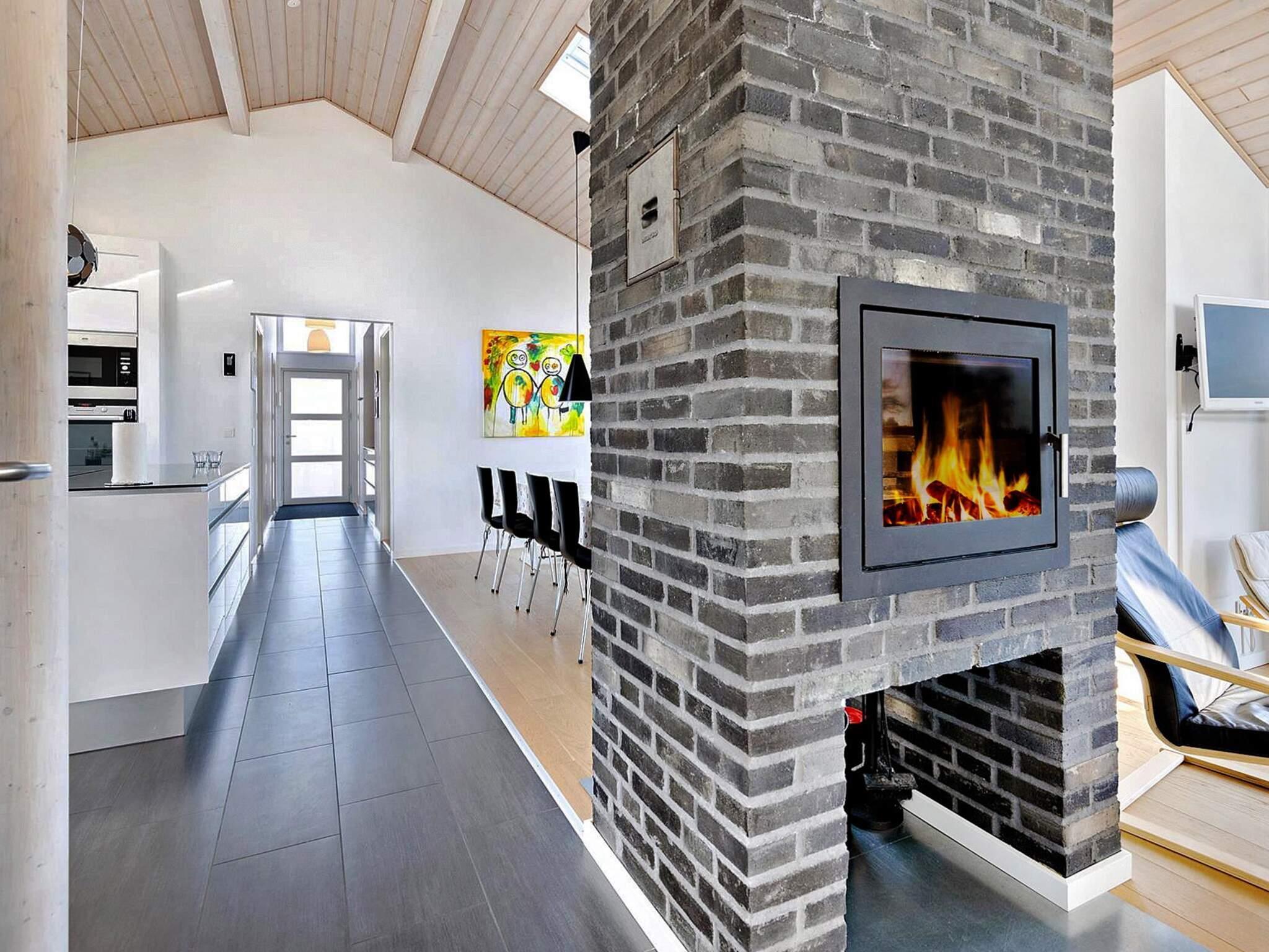 Entréen fører til badeværelse med spabad og sauna samt soveværelse. Herfra kommer du også ind i det rummelige køkken og opholdsstue i åbent plan, designet til familiesammenkomster. Værelset byder på åbent loft til højderyg, ovenlysvinduer, generøst køkken med kogeø samt udgang til både øst- og vestvendte terrasser. En stor hems (oplægninger) giver ekstra plads, mens der løber gulvvarme i hele huset for helårskomfort. Ejendommen indeholder fire velindrettede soveværelser og to badeværelser, det ene med vaskemaskine og tørretumbler. Underholdningsmulighederne omfatter en PlayStation 2 med forskellige spil. En moderne luft-til-luft varmepumpe med kølefunktion sikrer et behageligt indeklima.