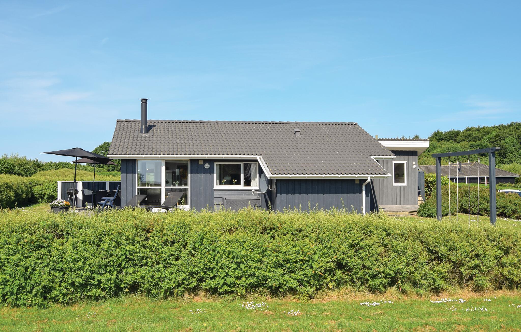 Moderne træferiehus i Spodsbjerg med havudsigt, spabad og sauna, tæt på fiskemuligheder og havn.
