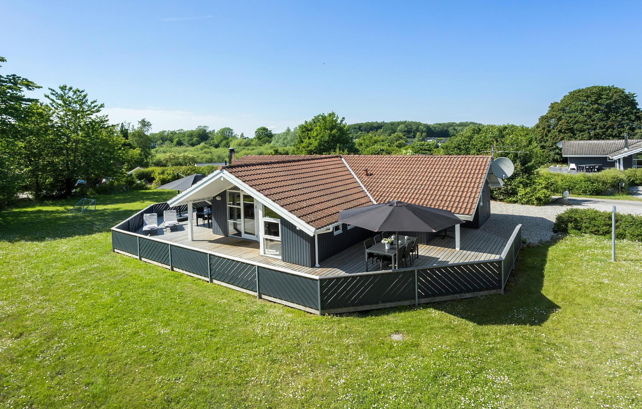 Hyggeligt træsommerhus i Spodsbjerg med spabad, stor overdækket terrasse og tæt på familievenlig strand.