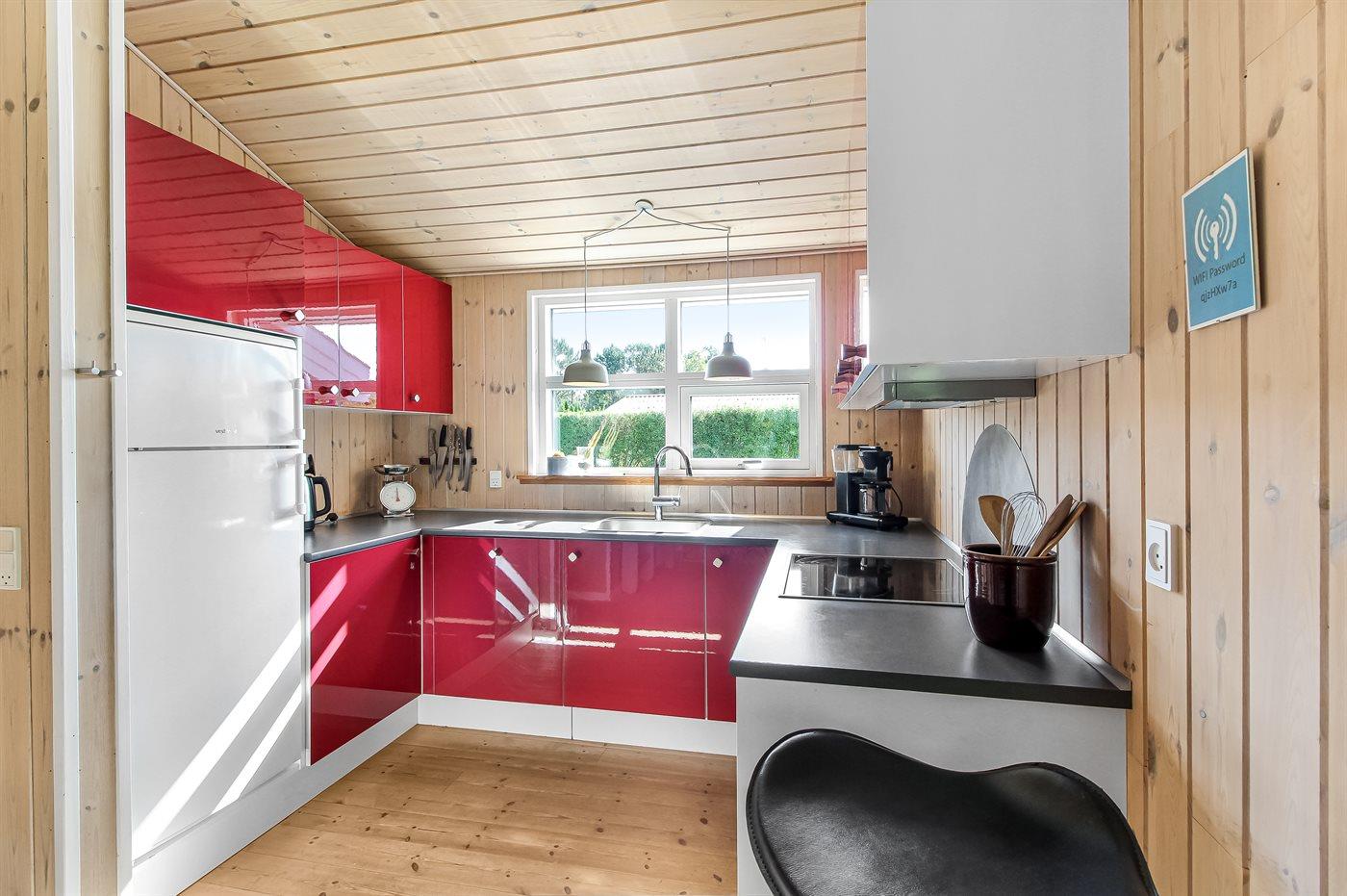 Køkkenet er udstyret med 1 køleskab. Der er 4 keramiske kogeplader, varmluftovn samt opvaskemaskine.