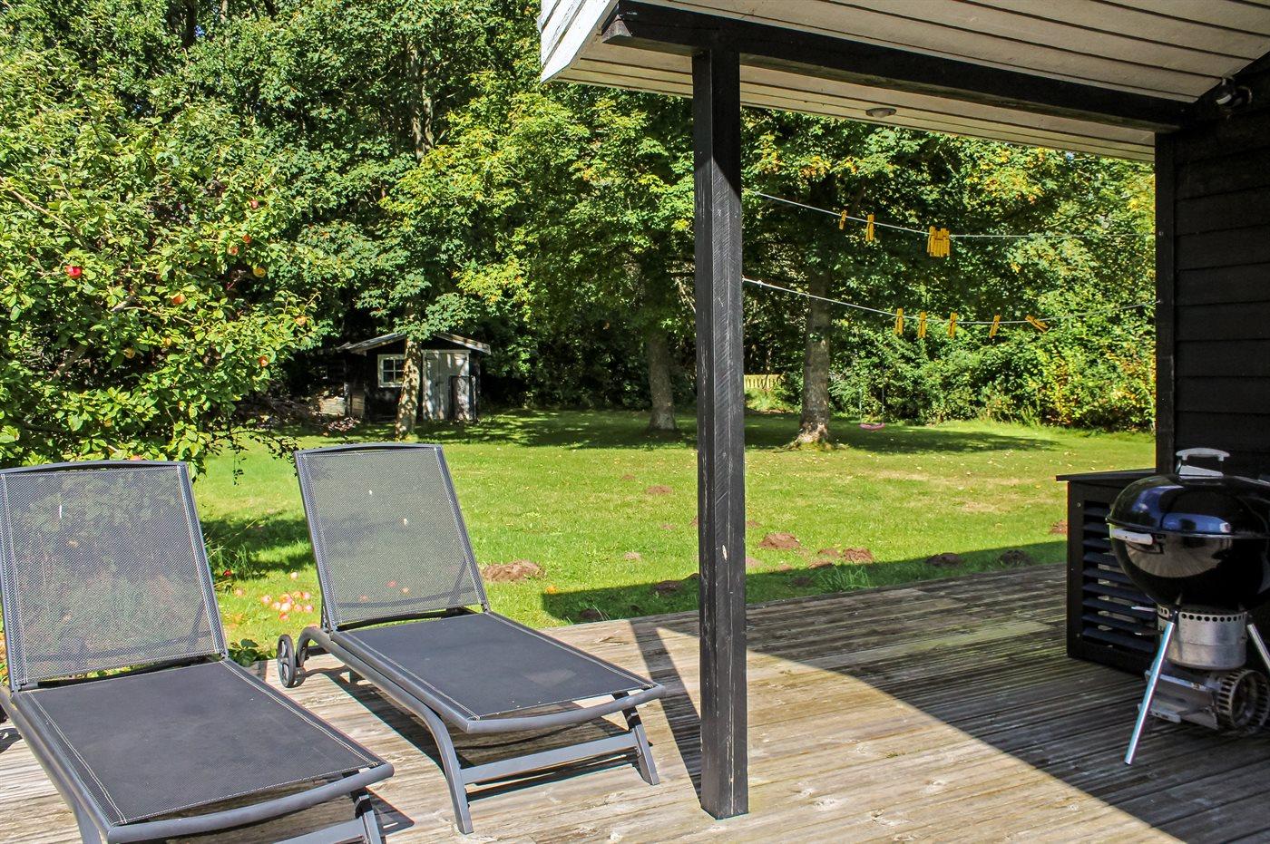 Ferieboligen er beliggende på en 1200 m² stor naturgrund. Der er 500 m til havet. Nærmeste forretning er beliggende i en afstand af 5000 m. Til ferieboligen hører 28 m² terrasseareal. Desuden er der 12 m² overdækket terrasse. Gynge. Parkering ved ferieboligen.