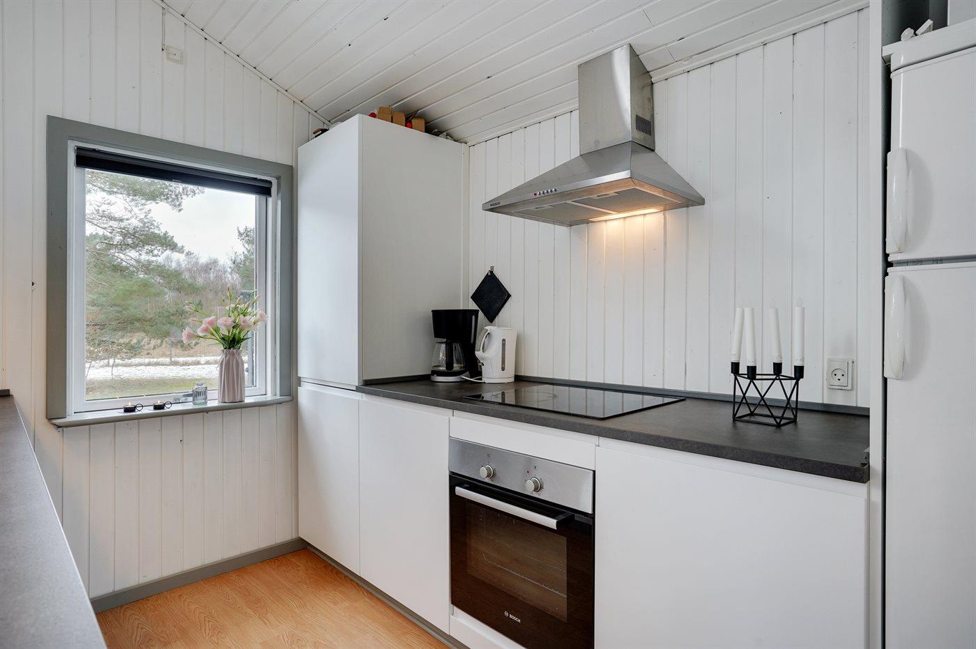 Køkkenet er udstyret med 1 køleskab. Der er 4 keramiske kogeplader, varmluftovn, mikrobølgeovn samt opvaskemaskine.