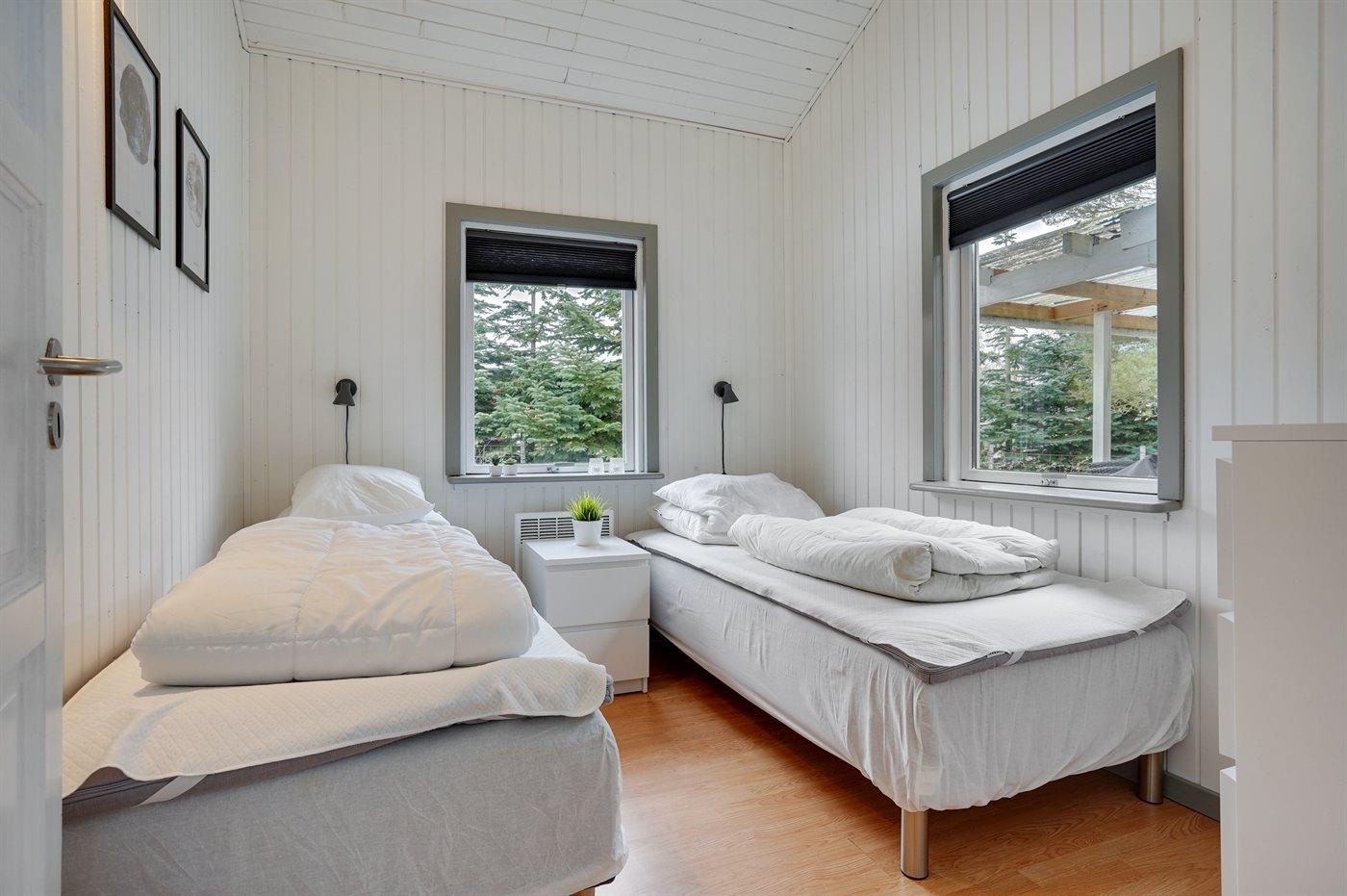 Der er i alt 3 soveværelser. Sovepladserne fordeler sig på: 2 sovepladser i dobbeltseng. 4 sovepladser i enkeltsenge. Derudover er der 1 stk. barneseng.