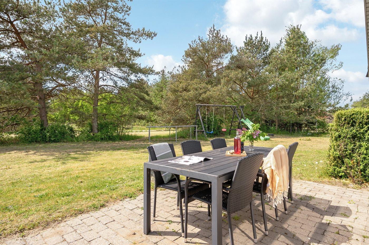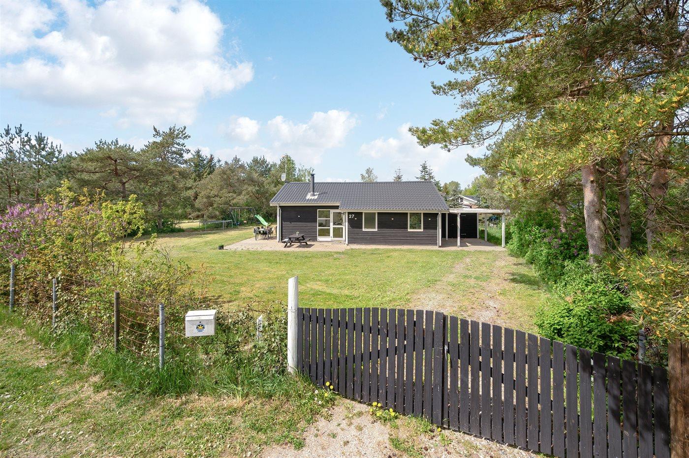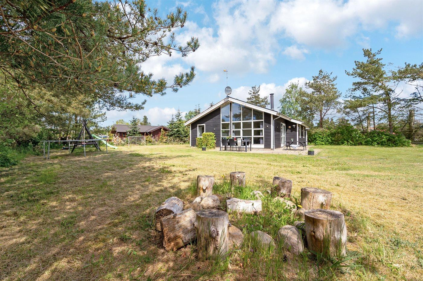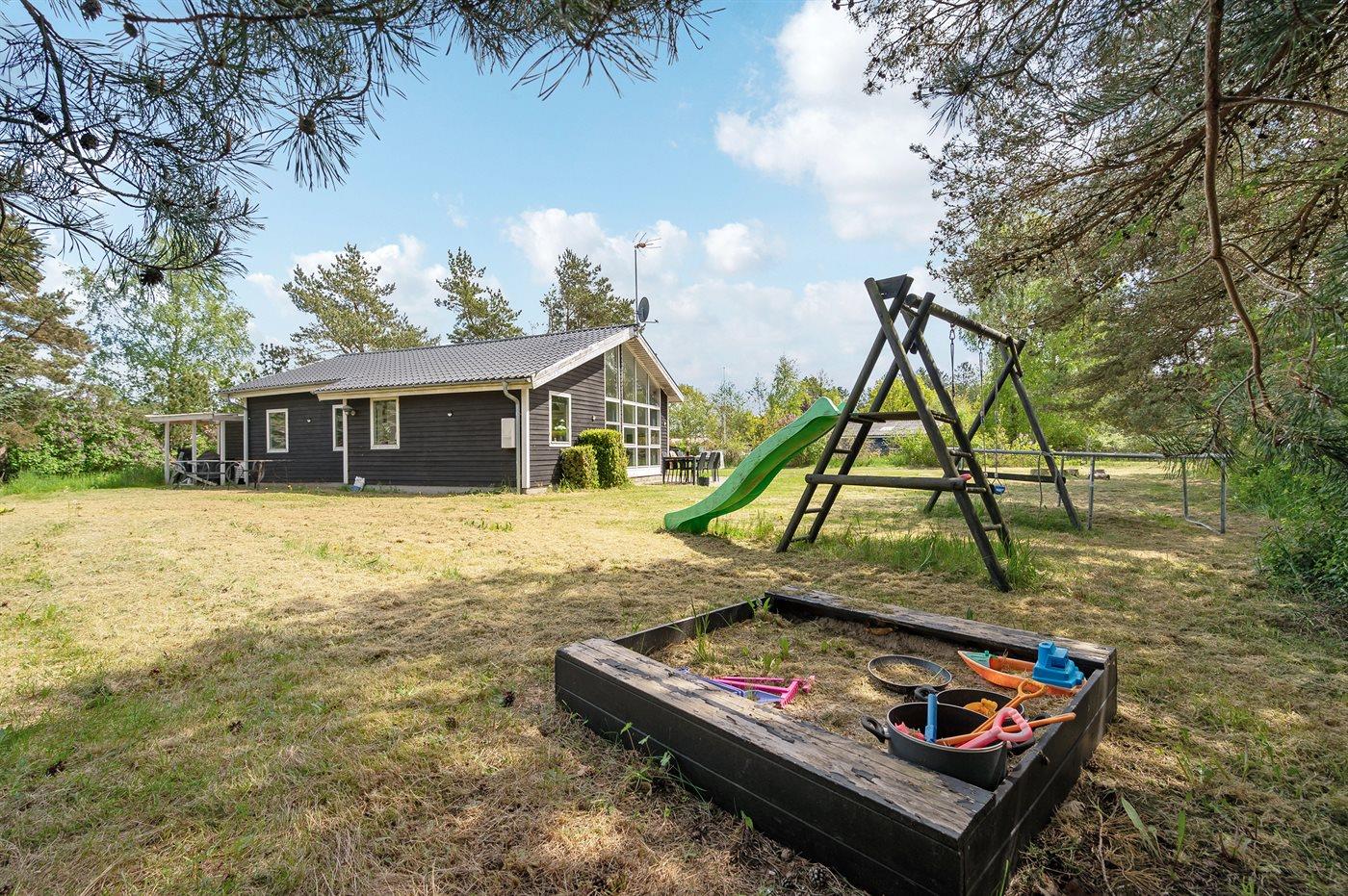 Ferieboligen er beliggende på en 1200 m² stor naturgrund. Grunden er indhegnet. Der er 300 m til havet. Nærmeste forretning er beliggende i en afstand af 3000 m. Til ferieboligen hører 60 m² terrasseareal. Der er redskabsrum. Gynge. Sandkasse. Trampolin. Legetårn. Rutchebane. Der er carport til rådighed. Parkering ved ferieboligen.