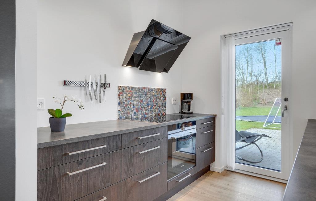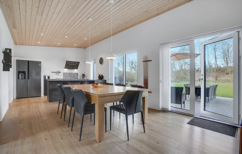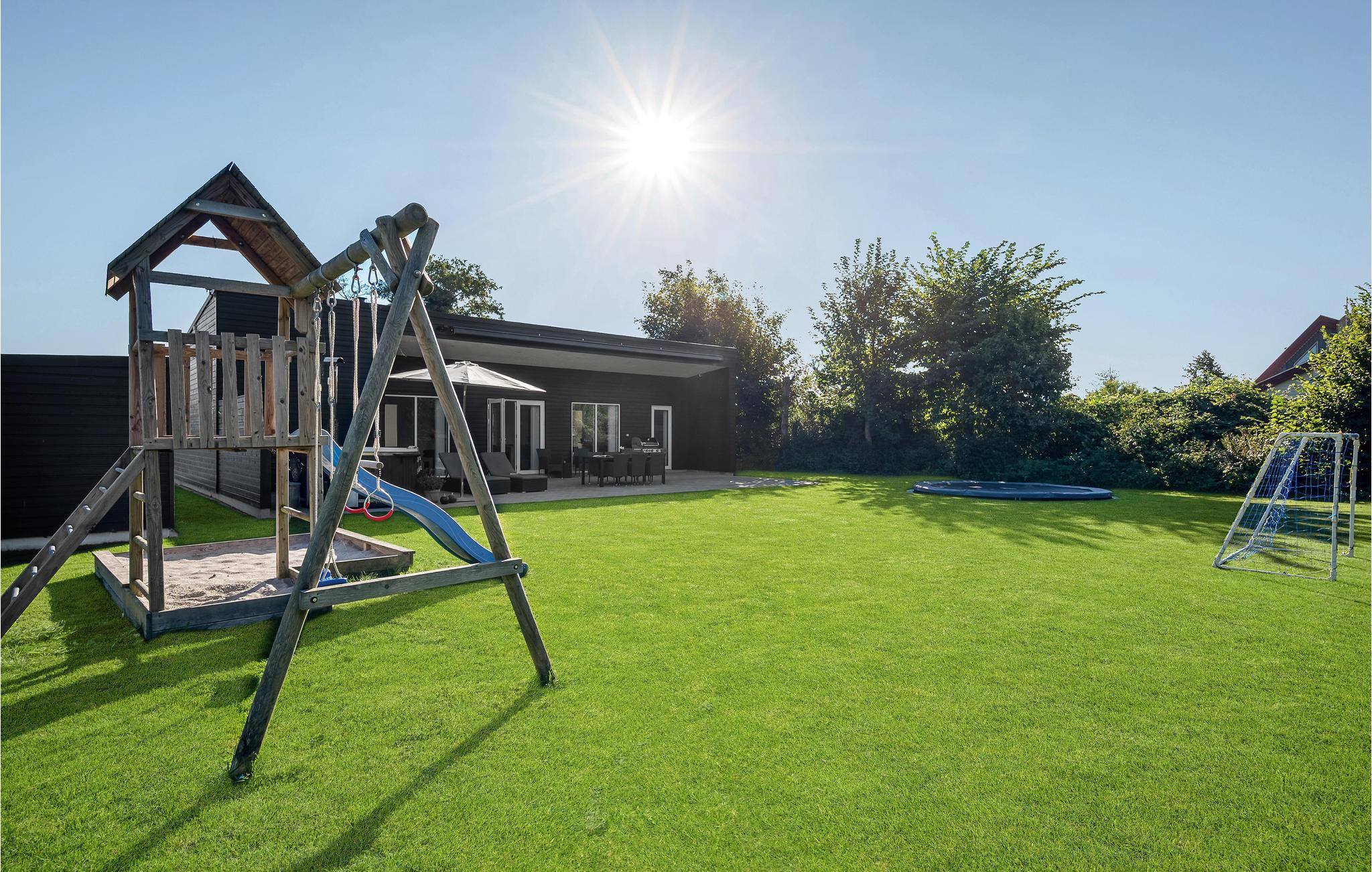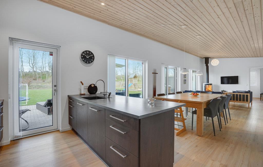 Huset er moderne med store vinduespartier, gode faciliteter og flotte designløsninger. Med 3 soveværelser og 2 badeværelser kan huset rumme op til 8 personer. Efter frokosten kan børn og voksne hygge sig med et spil billard. Tag derefter en afslappende stund i spabadet og nyd de rolige aftener i stuen, mens ilden knitrer i brændeovnen.