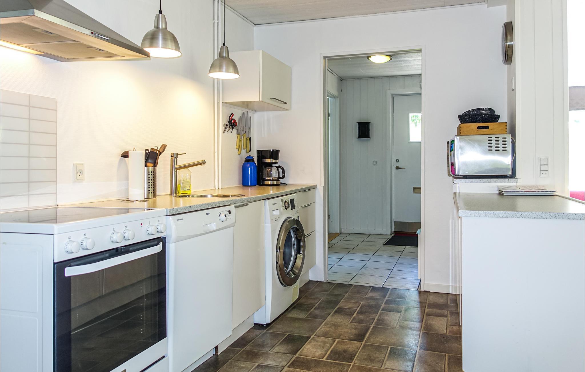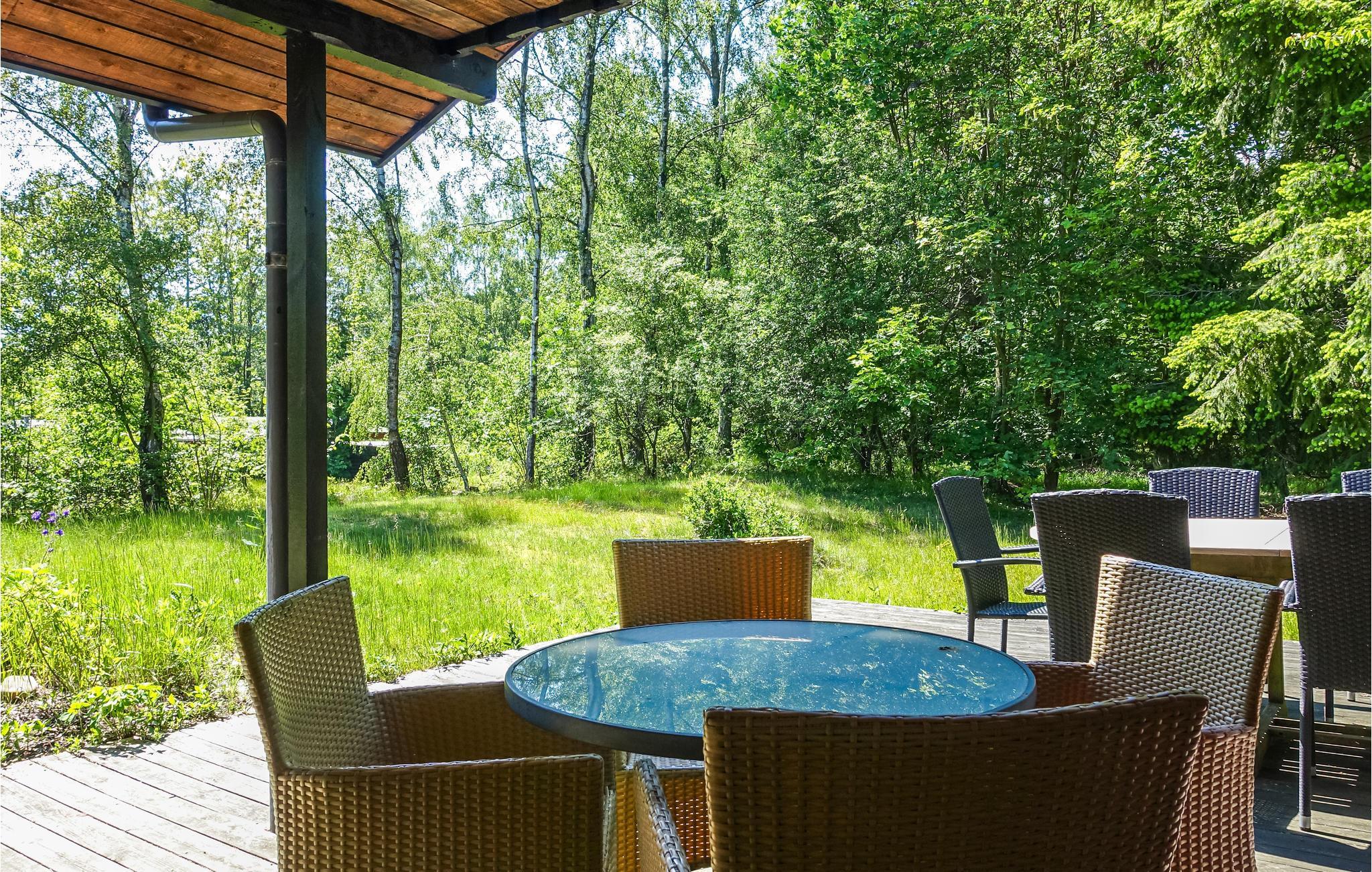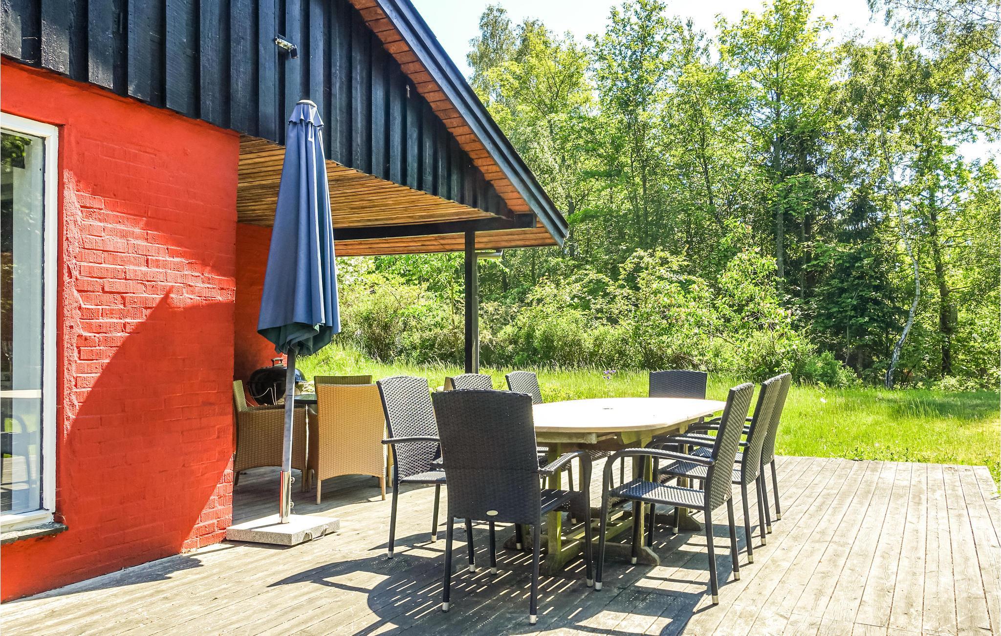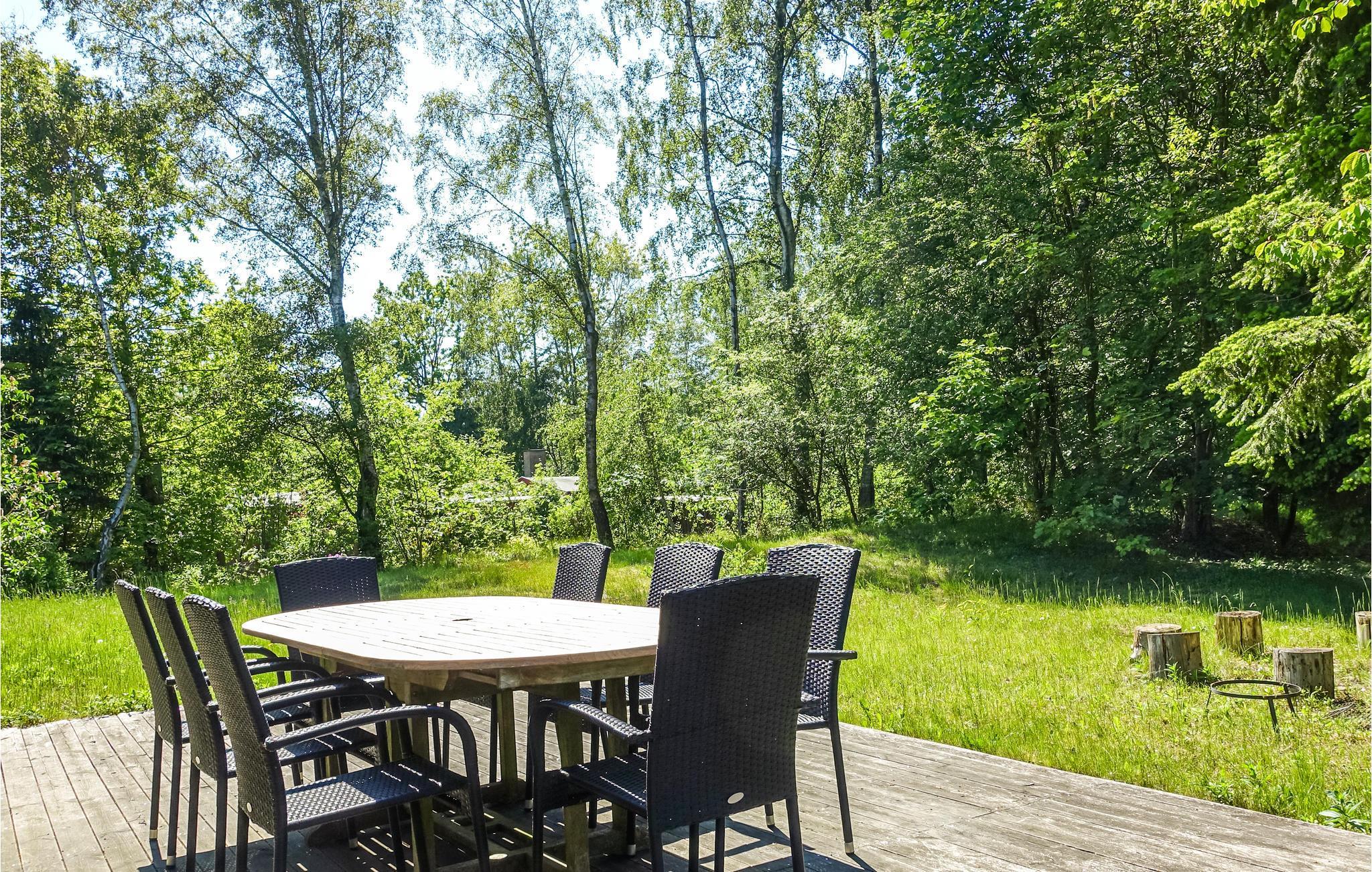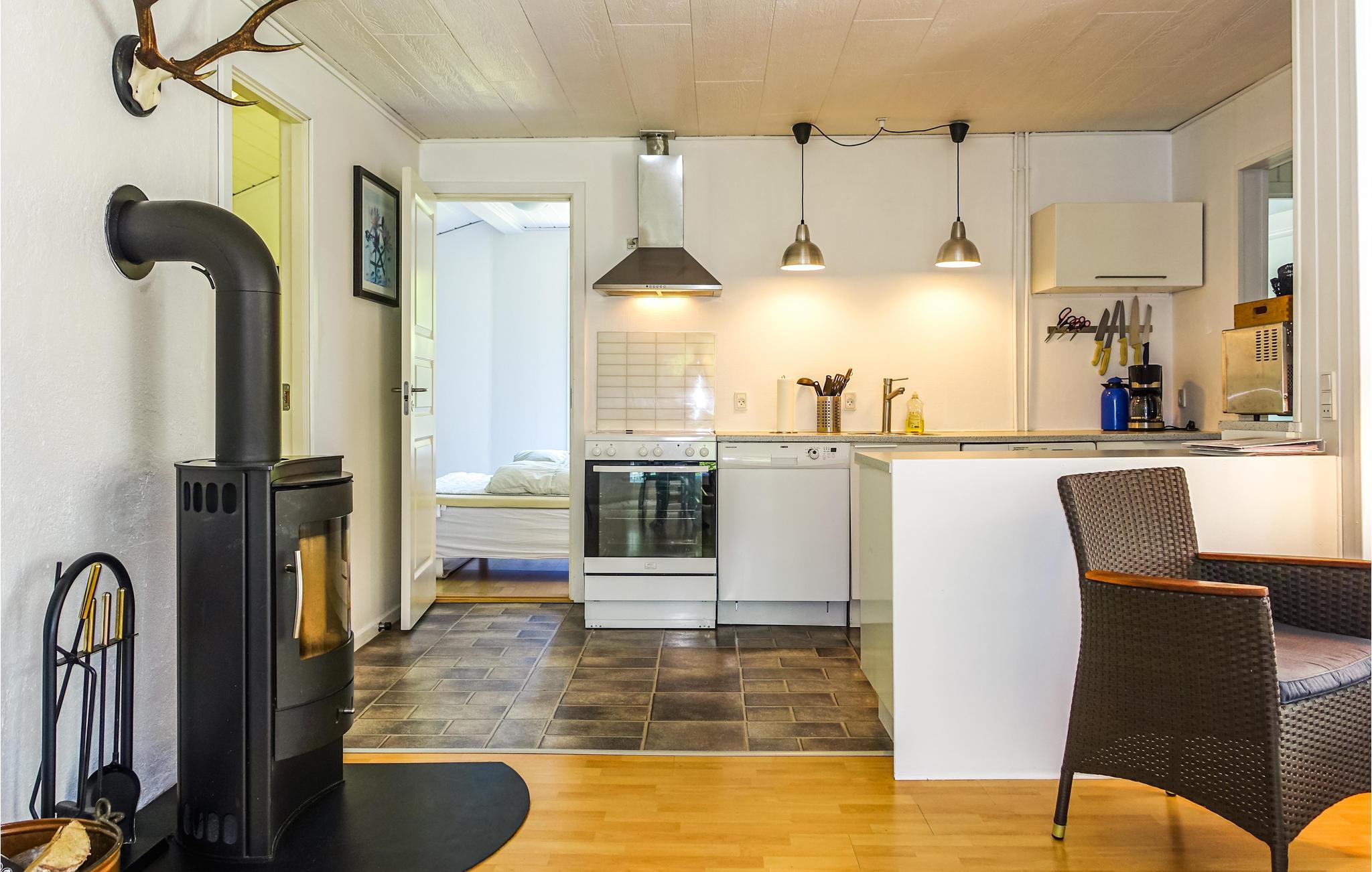 Sommerhuset består af en stor opholdsstue med brændeovn, TV, radio og spiseplads, et åbent, veludstyrret køkken, et flot badeværelse og to gode soveværelser samt et mindre et. Til huset hører en dejlig stor, delvist overdækket terrasse med havemøbler og en grill, så I kan tilberede lækre feriemåltider. Den dejlige have har en hyggelige bålplads og masser af plads til leg. Huset har varmepumpe og gratis trådløst internet (hurtigt og ubegrænset). Der er tørretumbler i udhuset.