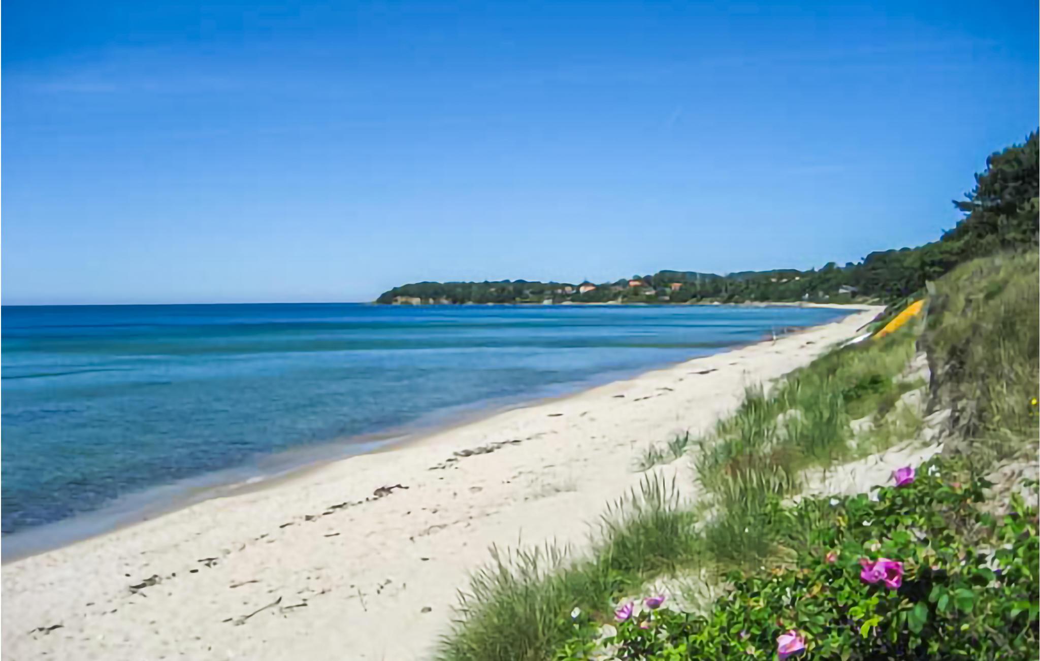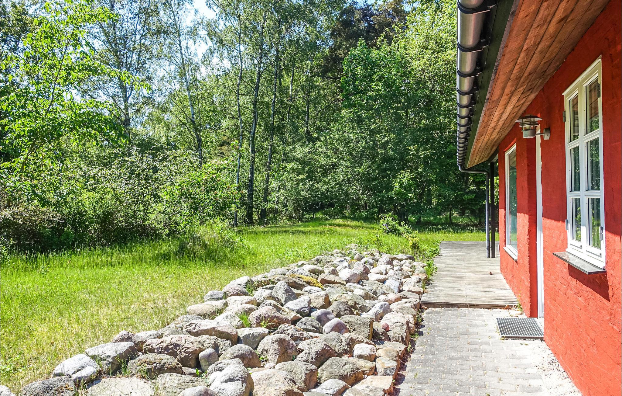Dejligt og pænt sommerhus på en stor naturgrund i eftertragtede Stampen, lidt uden for Rønne (4 km til centrum) og kun 300 meter fra en børnevenlig sandstrand.
