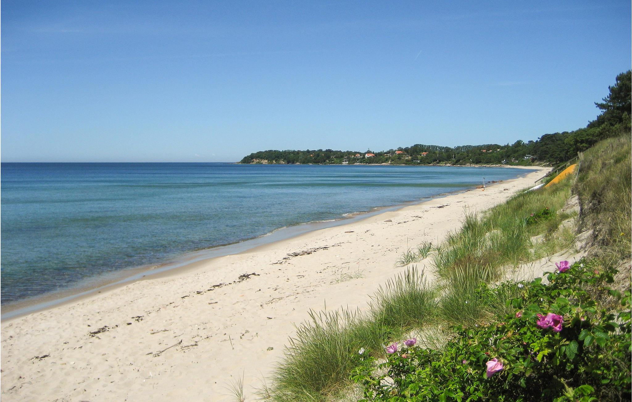 Skønt sommerhus på en dejlig, kuperet naturgrund i eftertragtede Stampen, lidt uden for Rønne (4 km til centrum) og kun 250 meter fra en børnevenlig sandstrand.