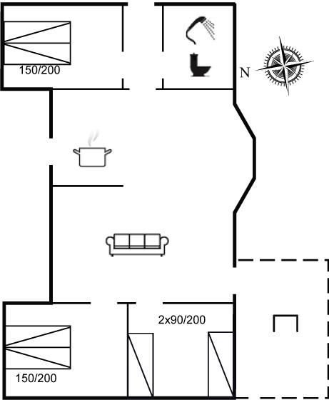 Der er i alt 3 soveværelser. Sovepladserne fordeler sig på: 4 sovepladser i dobbeltsenge. 2 sovepladser i enkeltsenge. Derudover er der 1 stk. barneseng.