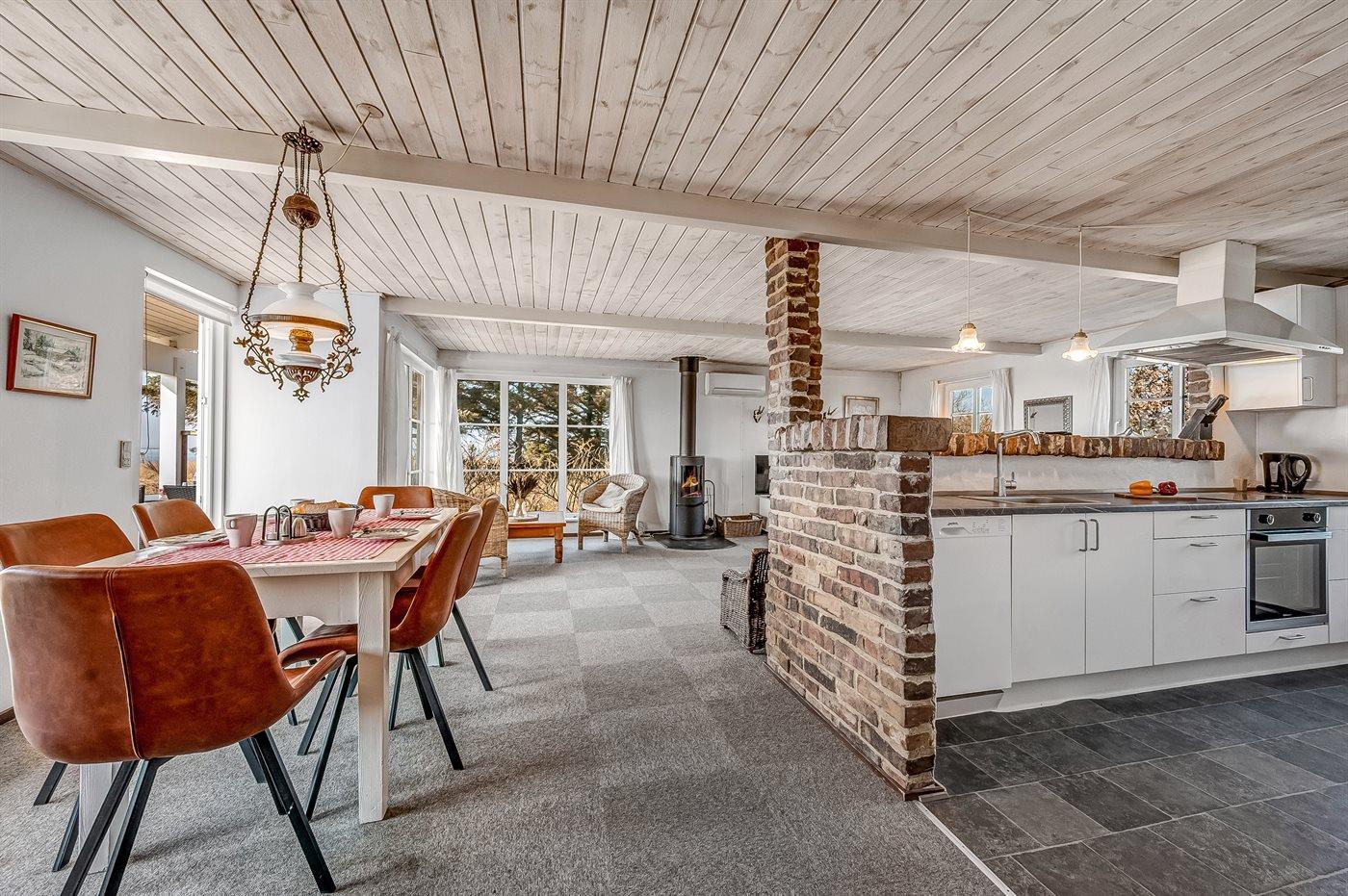 Køkkenet er udstyret med 1 køleskab. Der er 4 keramiske kogeplader, bageovn, mikrobølgeovn samt opvaskemaskine.