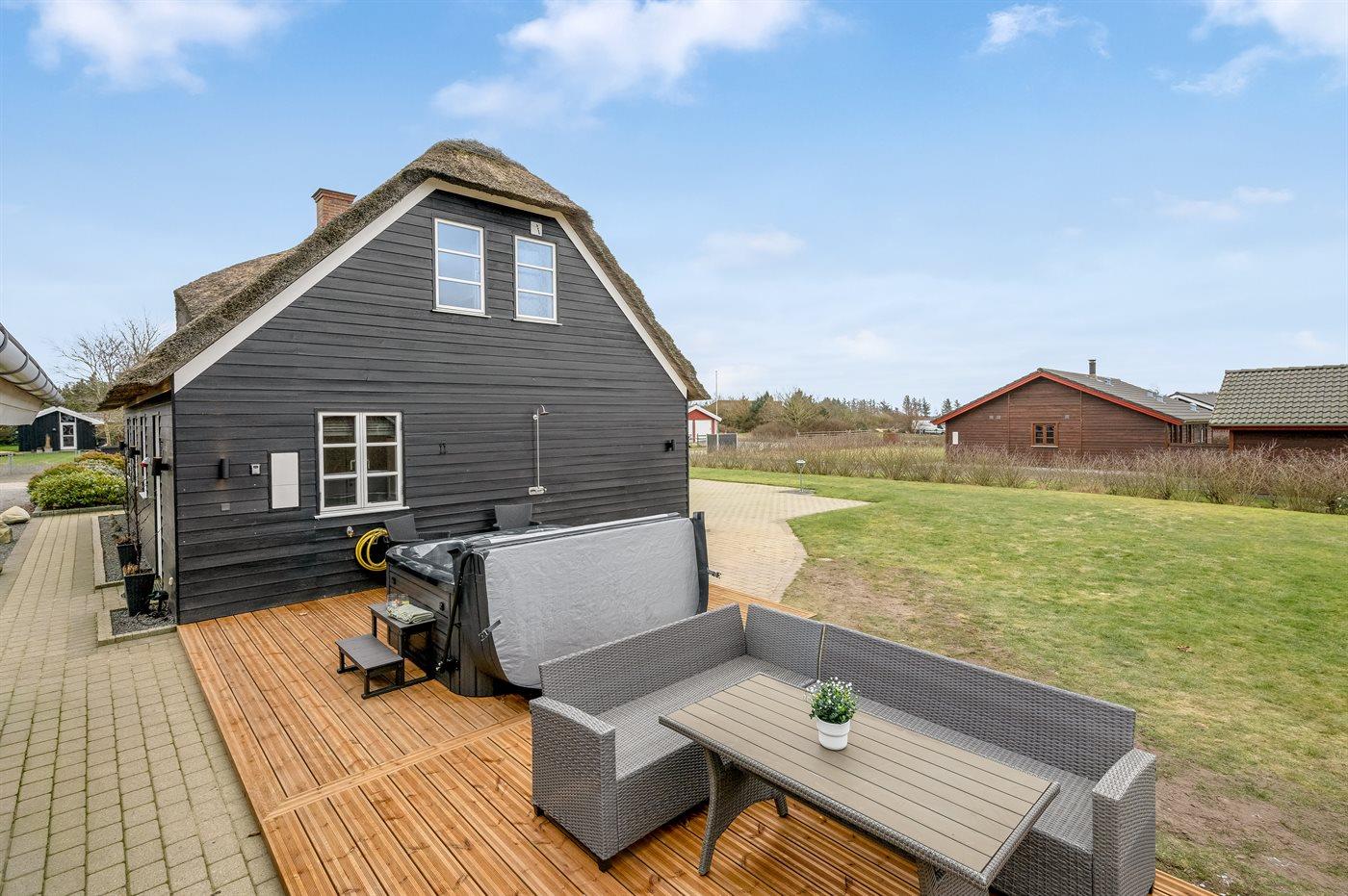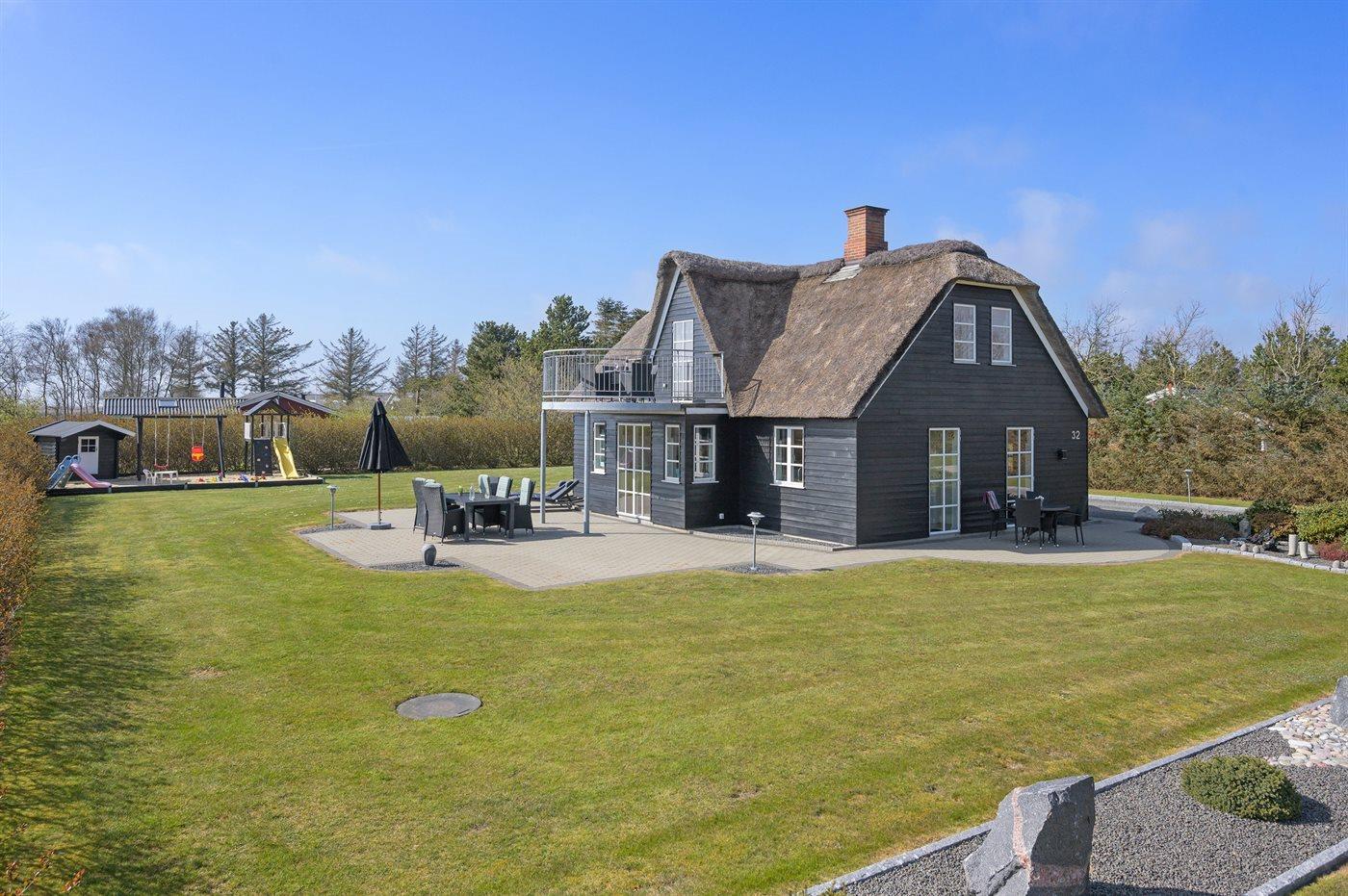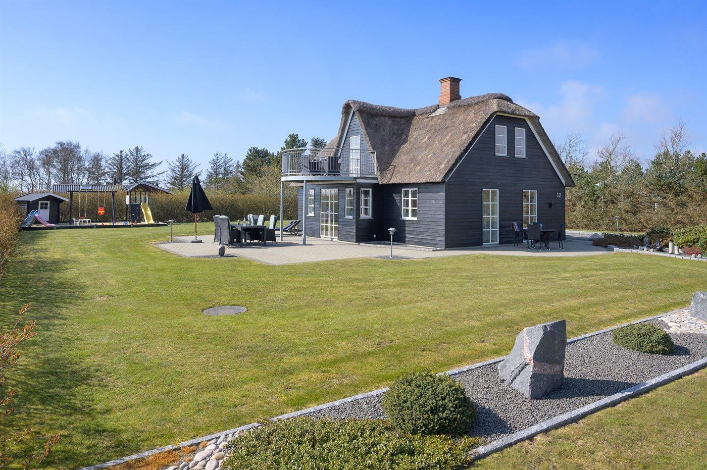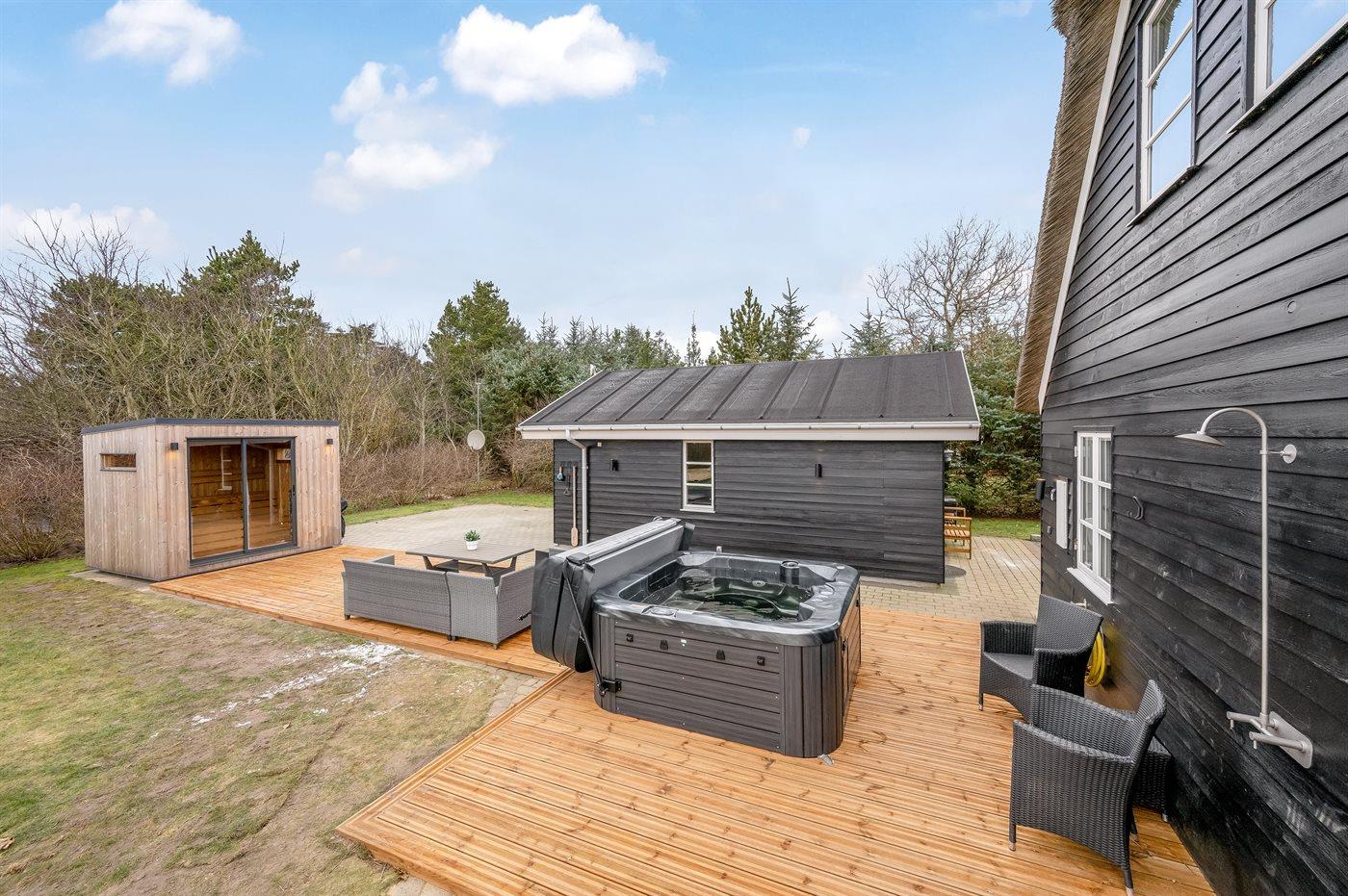 Et flot luksussommerhus i 2 plan, beliggende på en skøn naturgrund, hvor der fra 1. sal er udsigt over Ringkøbing Fjord. Huset er bygget i træ med stråtag 2008. Til huset hører stort såvel åbent som overdækket terrasseareal med div. havemøbler. Desuden findes der en udendørs sauna til 8 personer og en udendørs spa til 6 personer, som kan benyttes hele året. Desuden balkon.