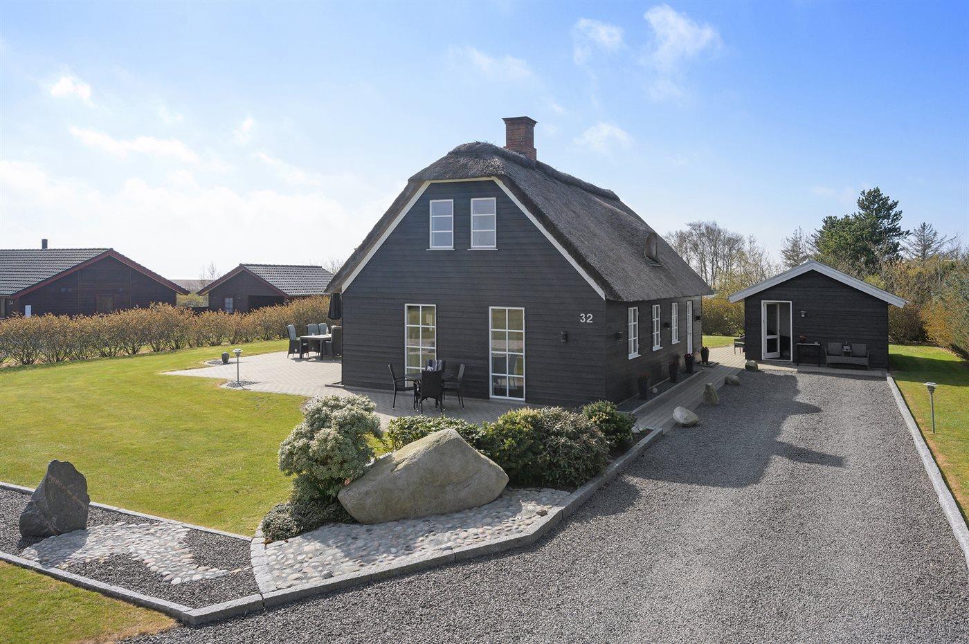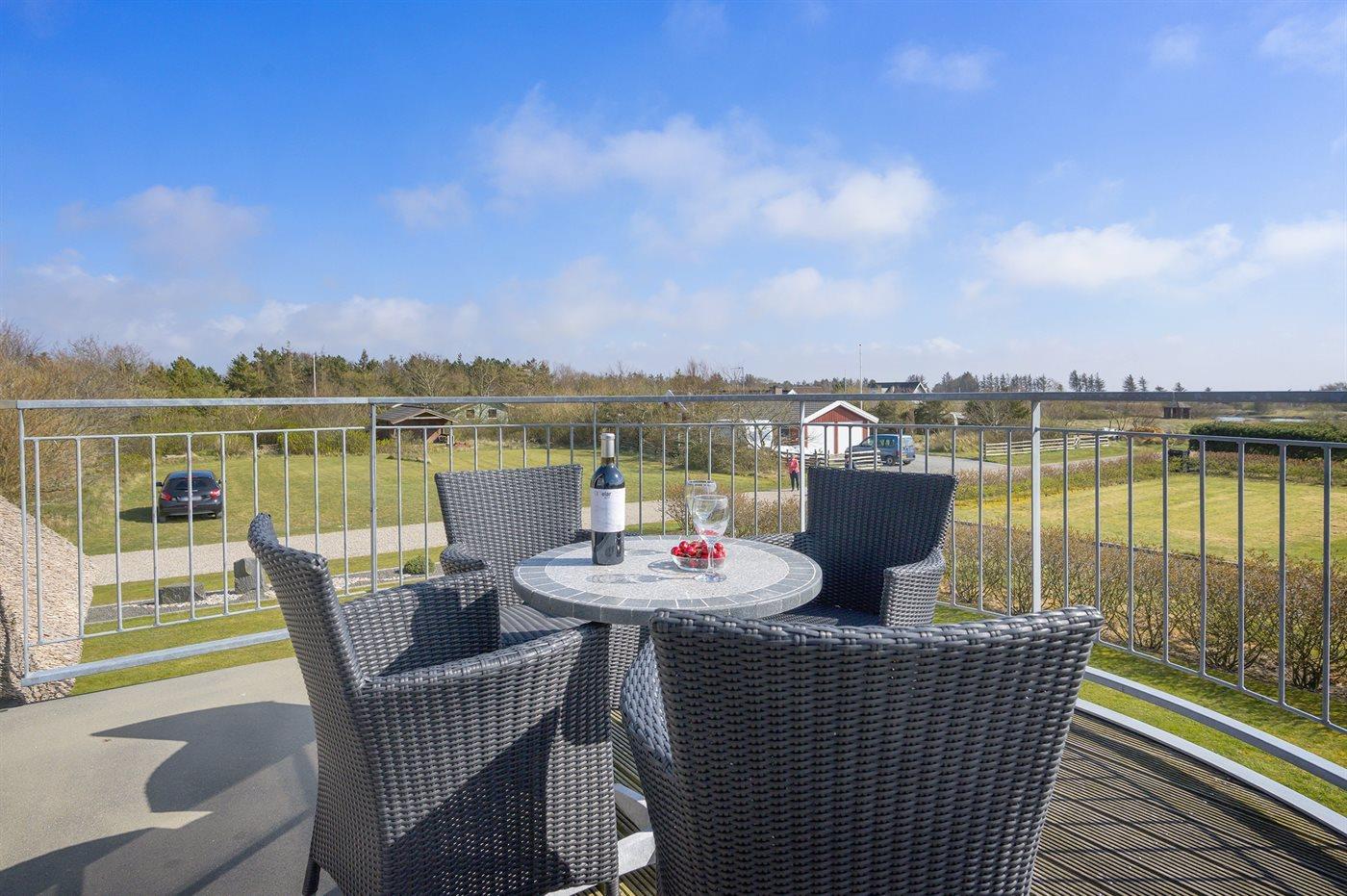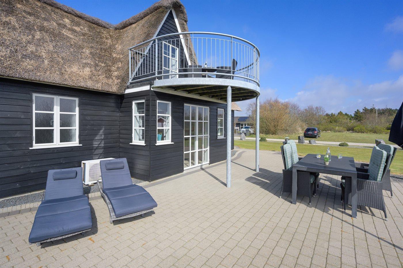 Et flot luksussommerhus i 2 plan, beliggende på en skøn naturgrund, hvor der fra 1. sal er udsigt over Ringkøbing Fjord. Huset er bygget i træ med stråtag 2008. Til huset hører stort såvel åbent som overdækket terrasseareal med div. havemøbler. Desuden findes der en udendørs sauna til 8 personer og en udendørs spa til 6 personer, som kan benyttes hele året. Desuden balkon.