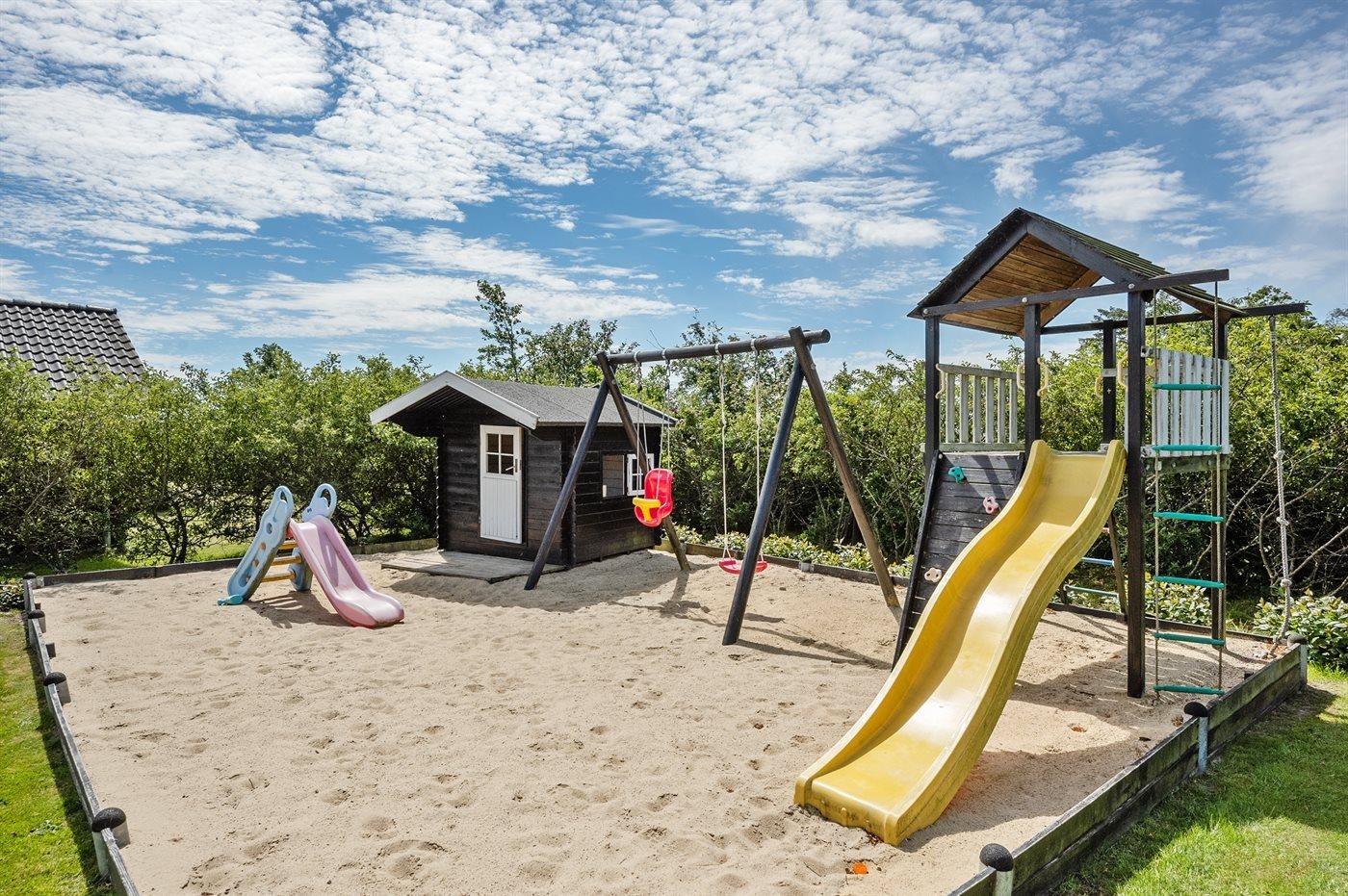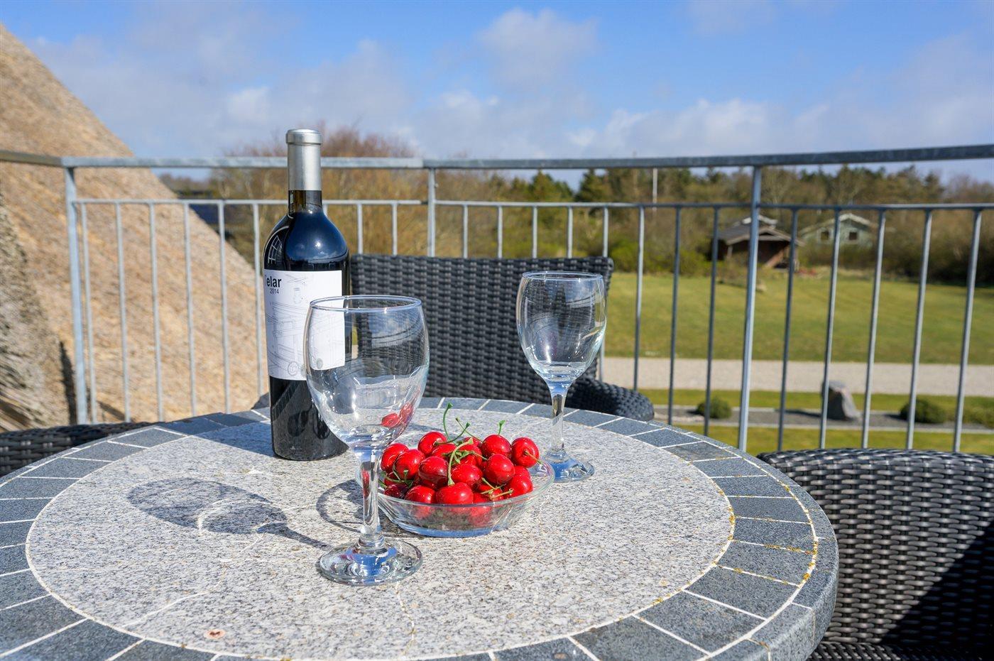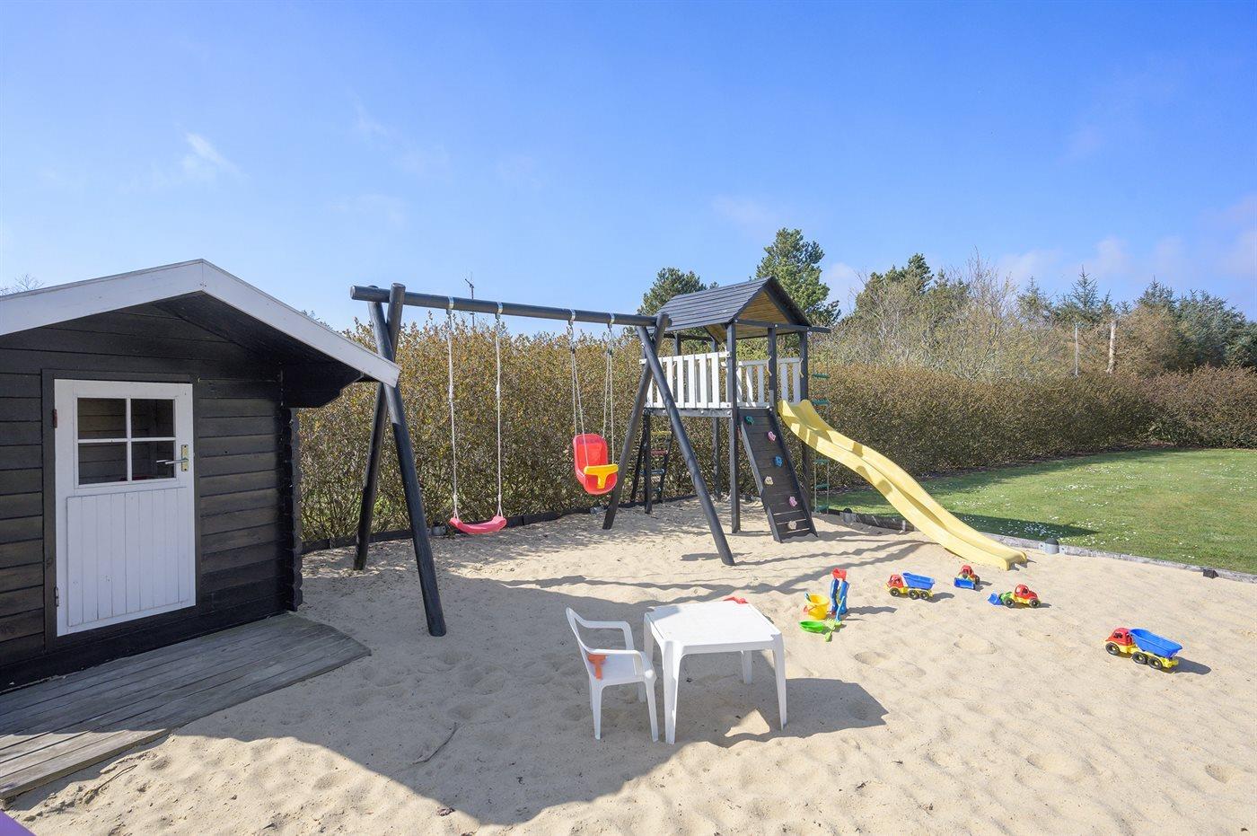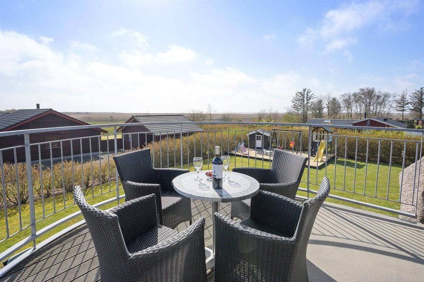 Et flot luksussommerhus i 2 plan, beliggende på en skøn naturgrund, hvor der fra 1. sal er udsigt over Ringkøbing Fjord. Huset er bygget i træ med stråtag 2008. Til huset hører stort såvel åbent som overdækket terrasseareal med div. havemøbler. Desuden findes der en udendørs sauna til 8 personer og en udendørs spa til 6 personer, som kan benyttes hele året. Desuden balkon.