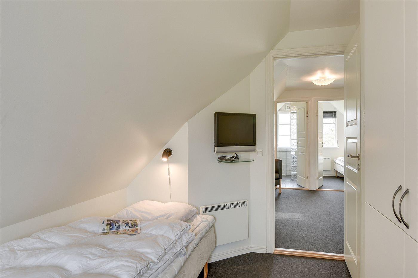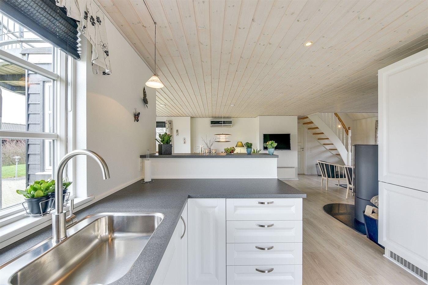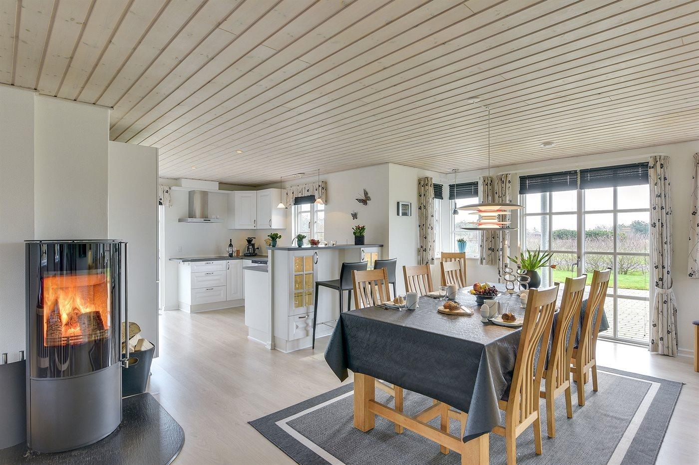 Moderne og veludstyret køkken med komfur med keramiske kogeplader og varmluftovn, mikrobølgeovn, opvaskemaskine og fryser. God spiseplads. Hyggelig stue med brændeovn samt TV med parabol (digital). 1 soveværelse med dobbeltseng. På 1. sal er der 3 soveværelser, 1 med dobbeltseng og 2 med hver 2 enkeltsenge. På 1. sal findes det ene af husets badeværelser, en hyggelig stue med ekstra TV (ingen antennemodtagelse) og DVD-afspiller samt balkon, hvorfra udsigten over fjorden kan nydes.