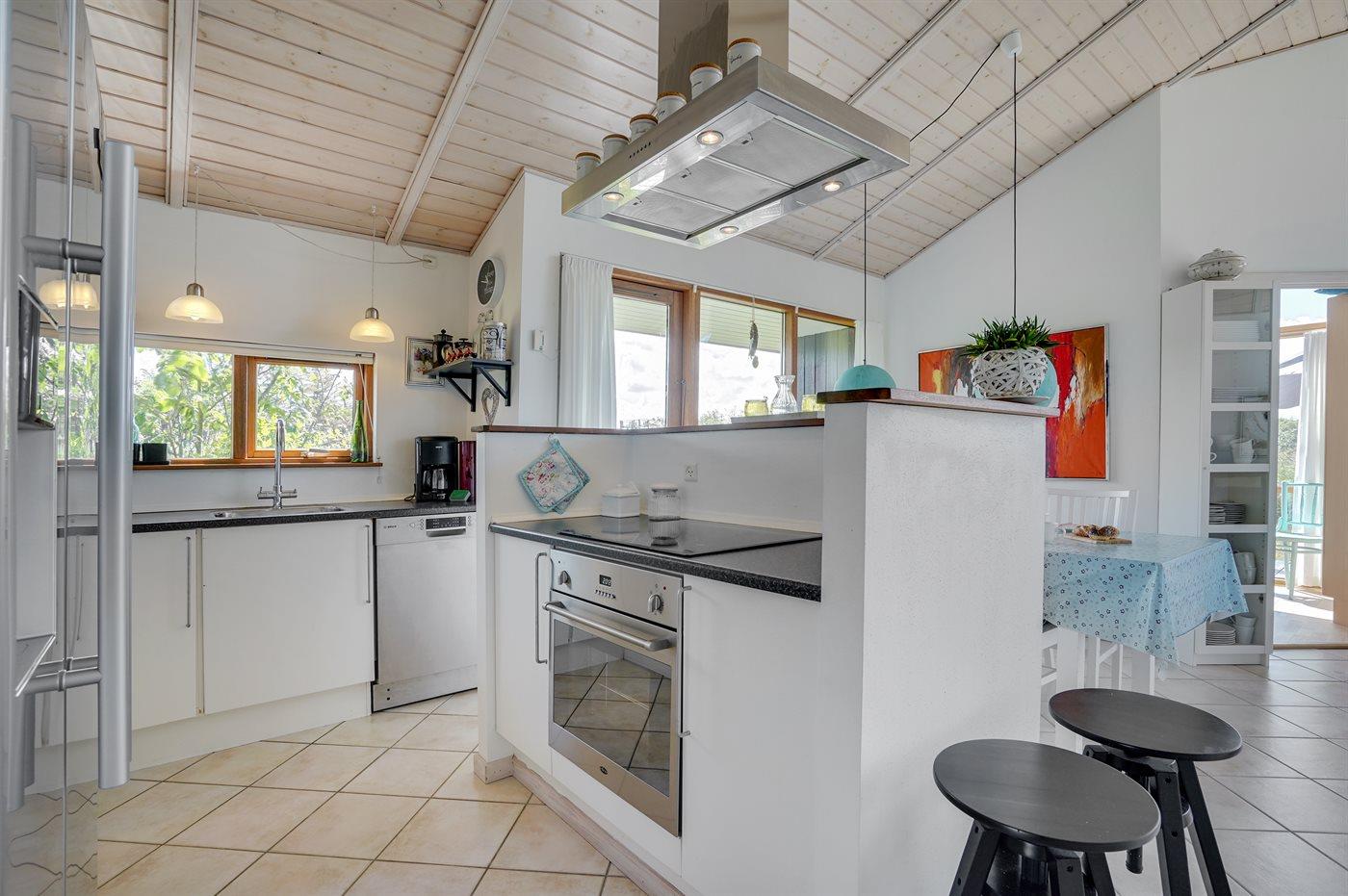 Køkkenet er udstyret med 1 amerikansk køleskab. Der er 4 keramiske kogeplader, varmluftovn, mikrobølgeovn samt opvaskemaskine.