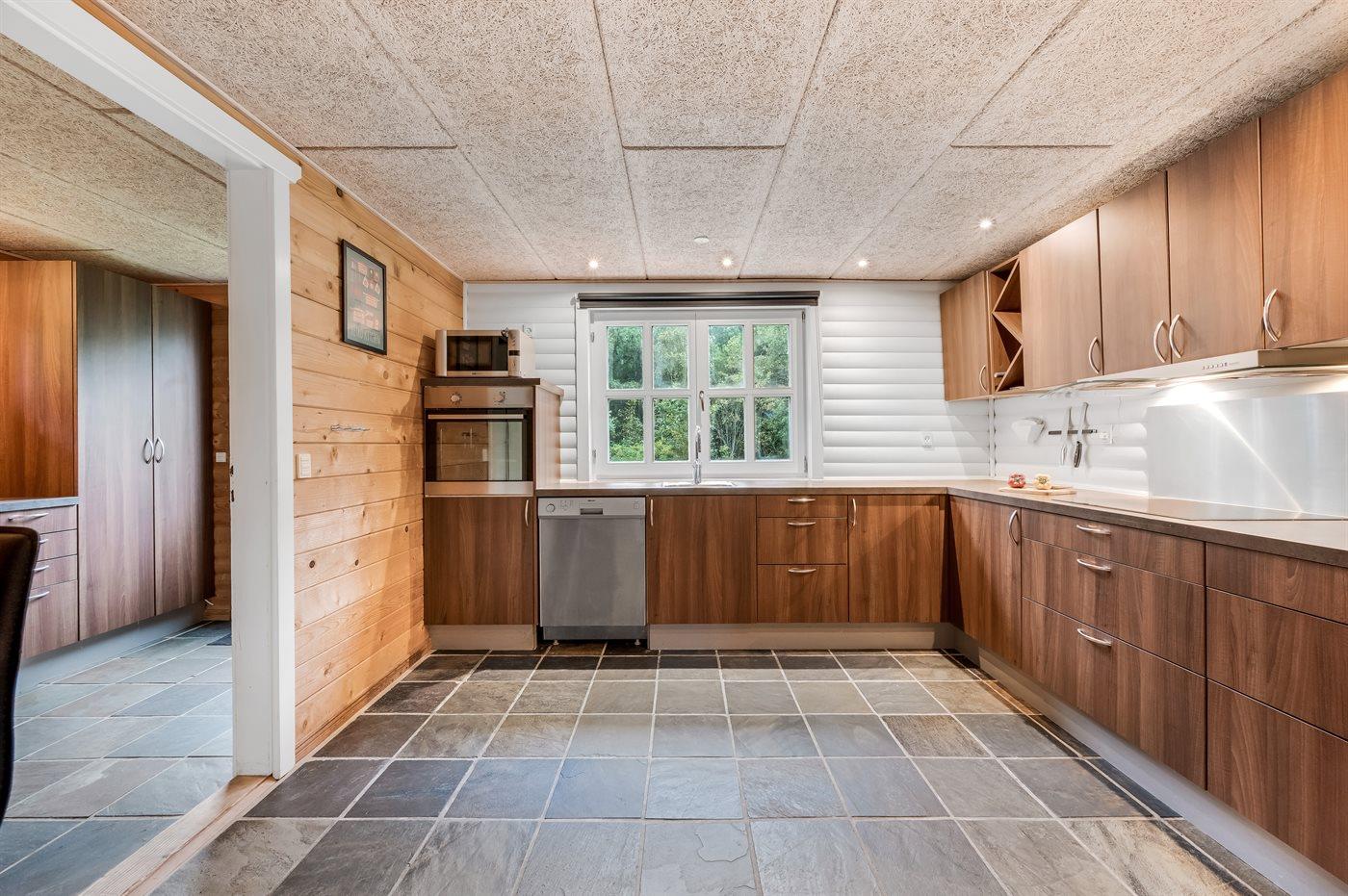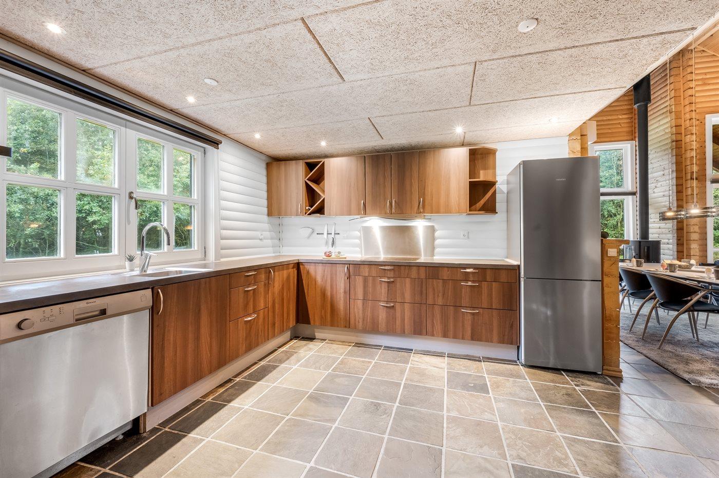 Køkkenet er udstyret med 1 køleskab. Der er 4 keramiske kogeplader, varmluftovn, mikrobølgeovn samt opvaskemaskine.