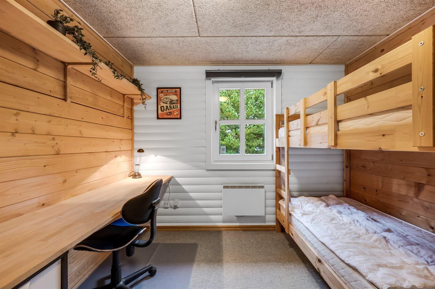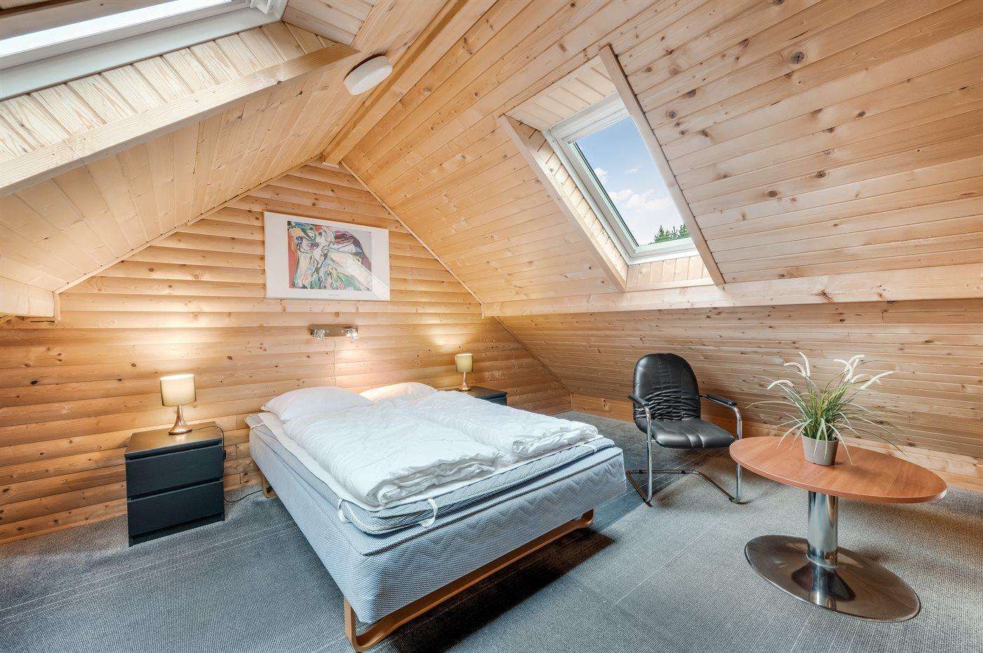 Der er i alt 3 soveværelser. Sovepladserne fordeler sig på: 4 sovepladser i dobbeltsenge. 2 sovepladser i køjeseng.2 sovepladser i elevationssenge. 2 af disse sovepladser befinder sig på husets hems.