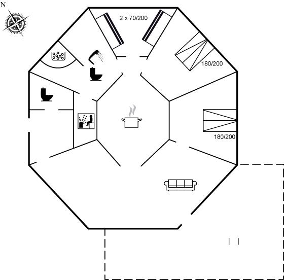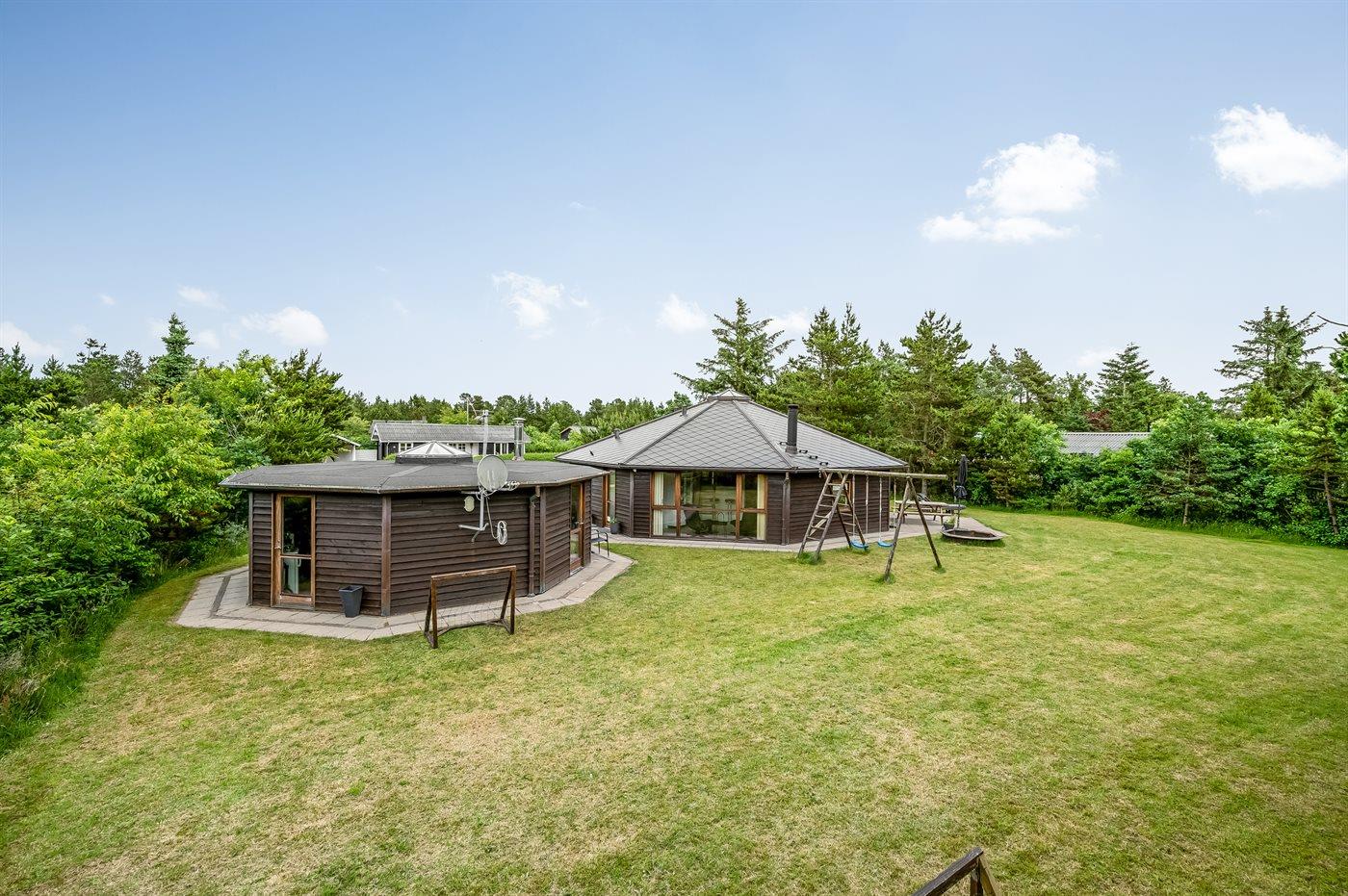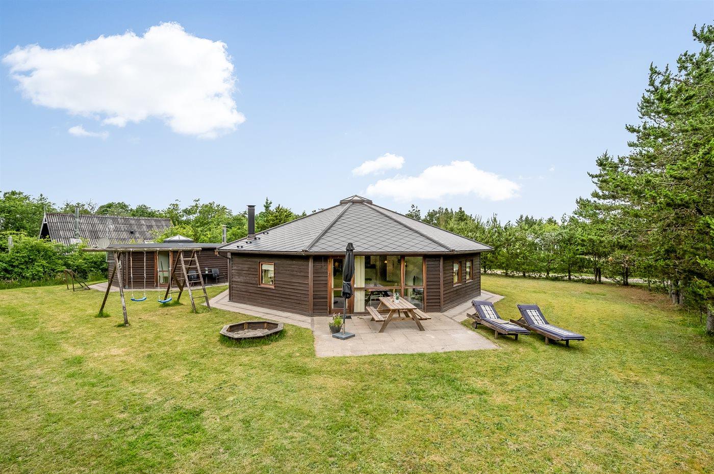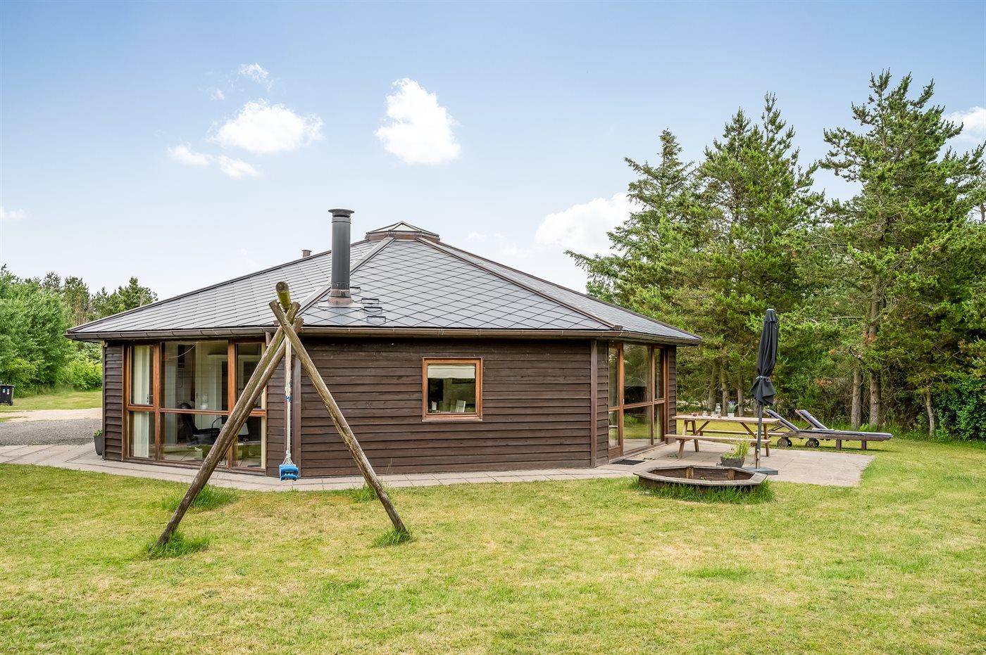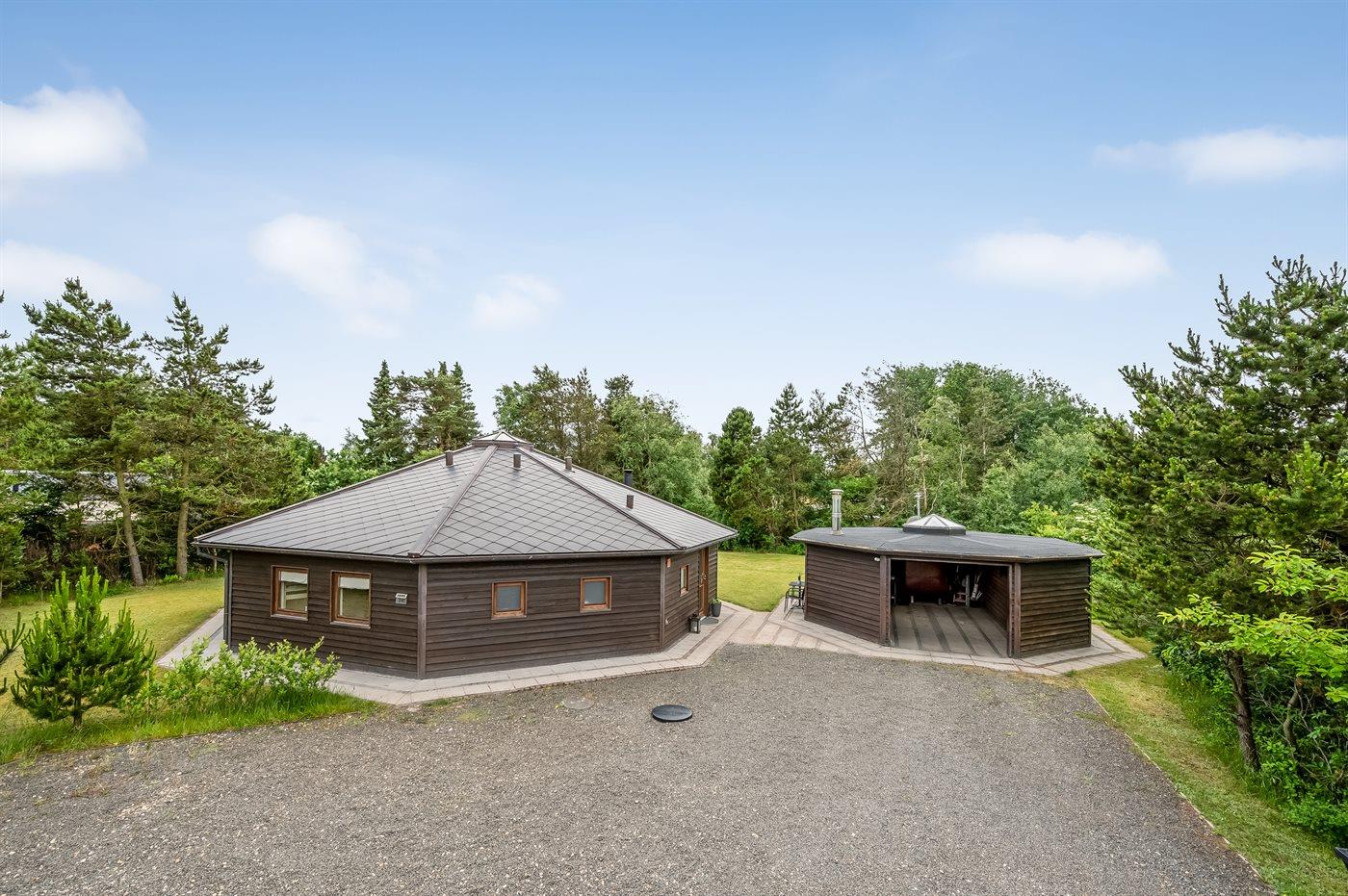 Dette flotte, arkitekttegnede og ottekantede sommerhus er en unik feriebolig udført i de bedste materialer beliggende ugenert for enden af lukket vej. Huset indbyder til en skøn ferie med en indretning, hvor der er lagt vægt på at skabe hyggelige omgivelser samtidig med, at der ikke er sparet på moderne bekvemmeligheder. På hemsen er der 2 sovepladser med kig til stjernerne igennem ovenlysvinduet samt TV-skærm og tilhørende tegnefilm til børnene. I alle 4 soverum samt på badeværelset er der installeret fladsskærm med indbygget DVD. I nærheden ligger Ringkøbing Fjord hvor der er gode fiskemuligheder samt gode vandre - og cykelstier. Tæt på huset kan fælles fodboldbane, en stor legeplads samt petanquebane benyttes. Desuden er der etableret 3-4.000 m2 hundeskov/legeplads ca. 100 m fra huset.